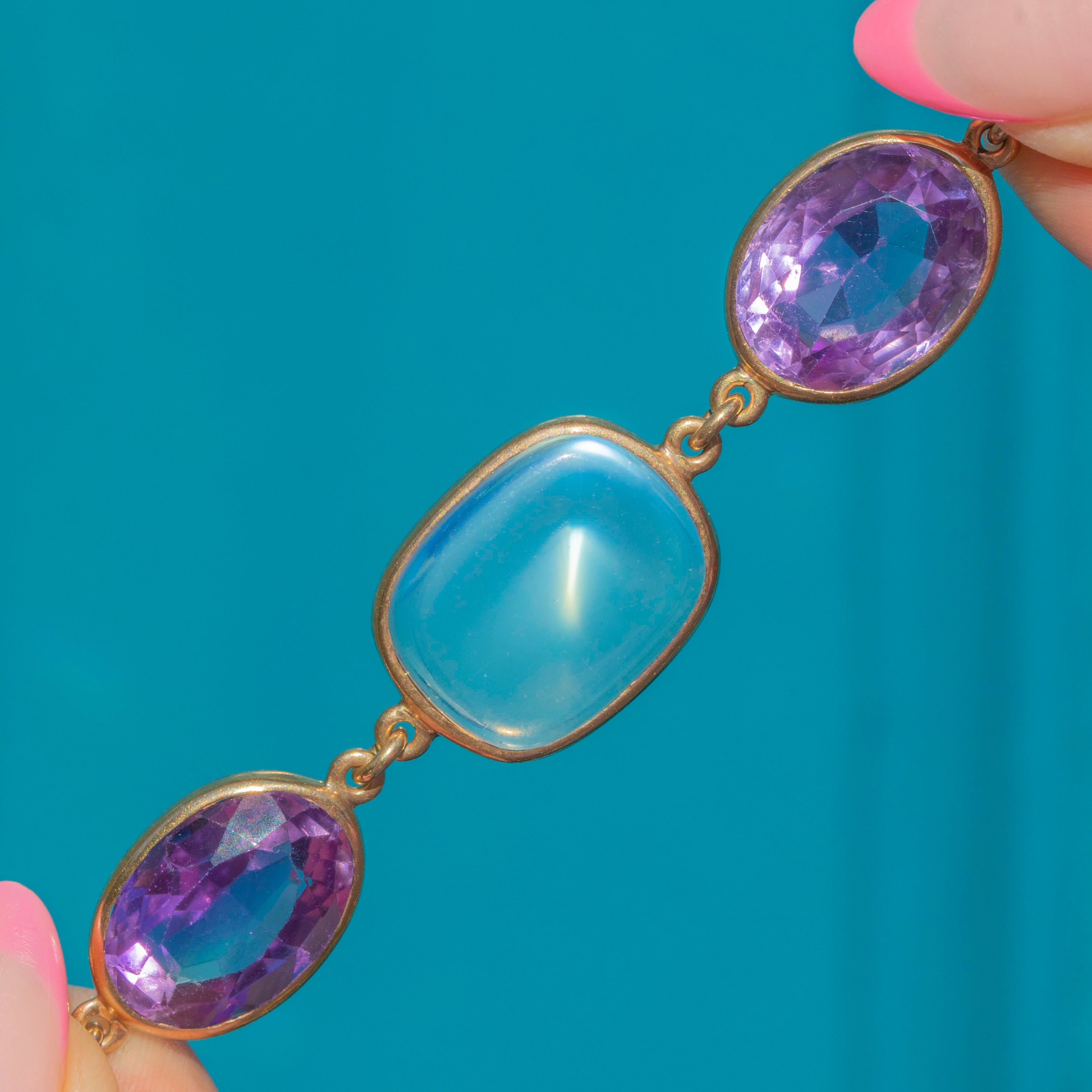 We simply adore this antique 9ct Gold harlequin multigemstone riviere necklace! This gorgeous piece boasts an array of multicoloured gemstones, including adularescent Moonstones, violet Amethysts, Pink Tourmaline and a pale blue Sapphire, to name a few!