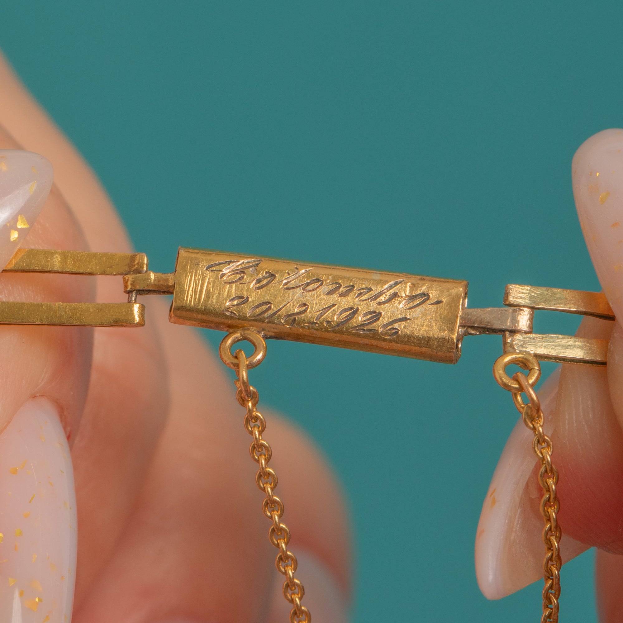Finished with a classic box-and-tongue clasp and safety chain, the clasp is hand-engraved “John 20/9/1926” and “Colombo 1926”, lending a romantic provenance to its 1920s date. With approximately 14.00ct of Garnets, it is a chic, colour-forward piece that stacks beautifully or sings solo.