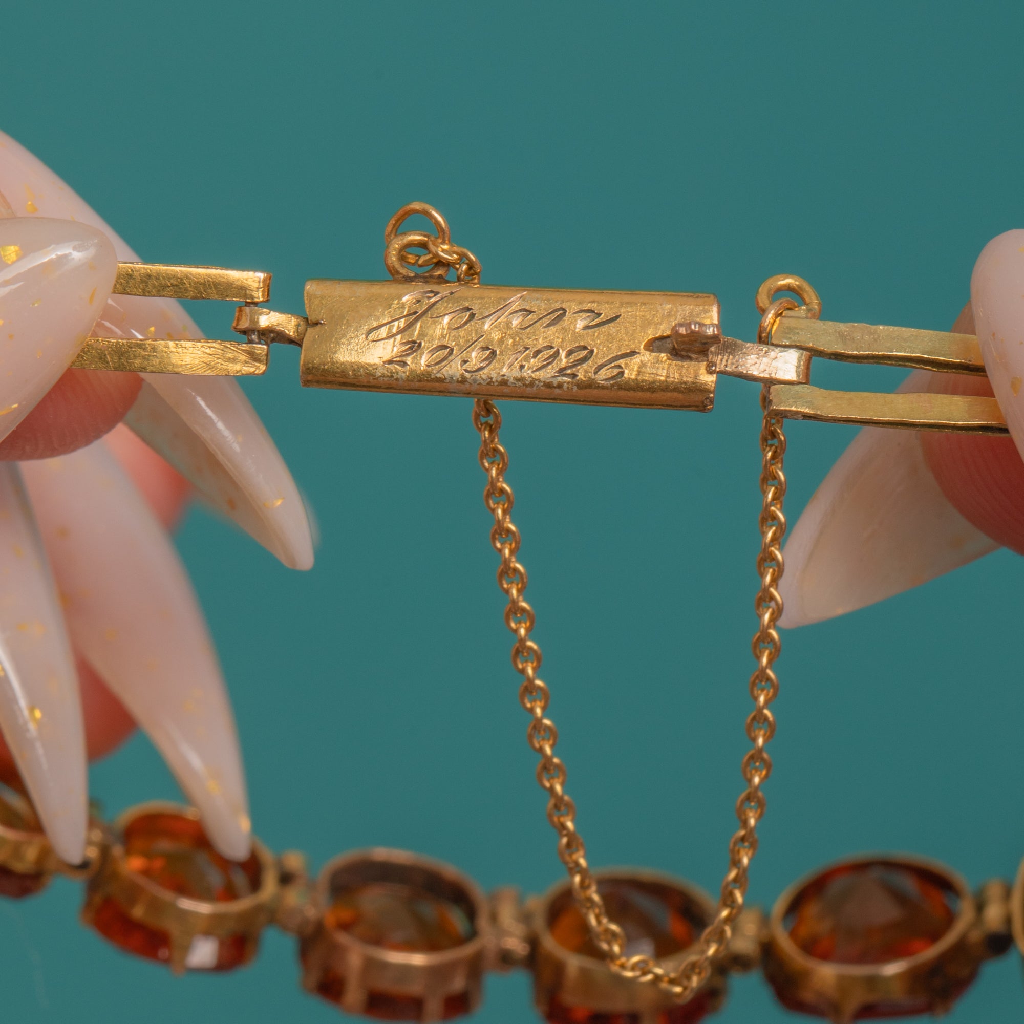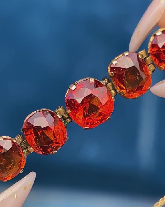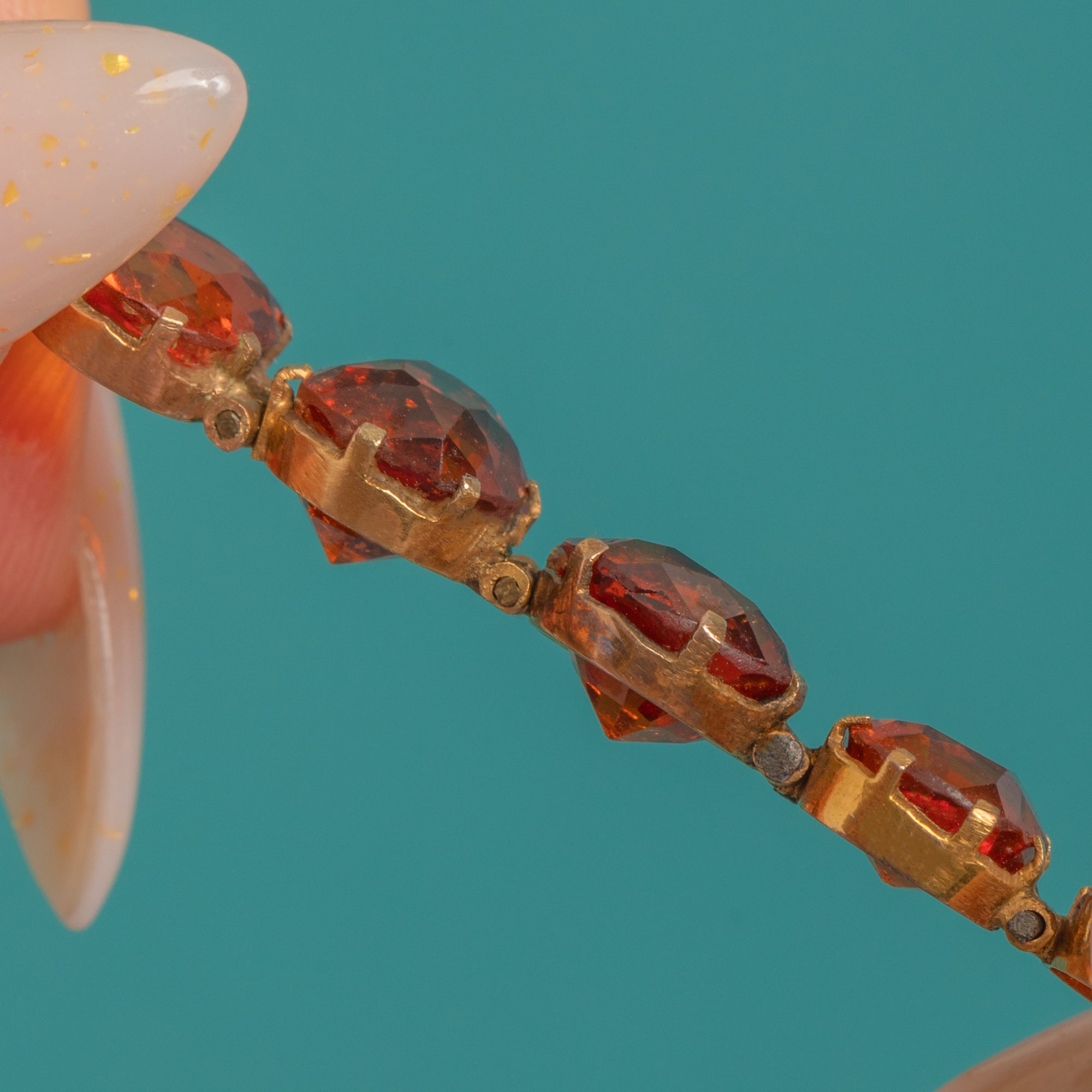 A jewel of the Jazz Age, this Art Deco riviere bracelet presents a sleek, continuous line of vivid Hessonite Garnets set in warm 9ct Gold. The articulated links drape fluidly around the wrist, each gem flashing lively orange to orange-red tones for saturated, elegant sparkle.