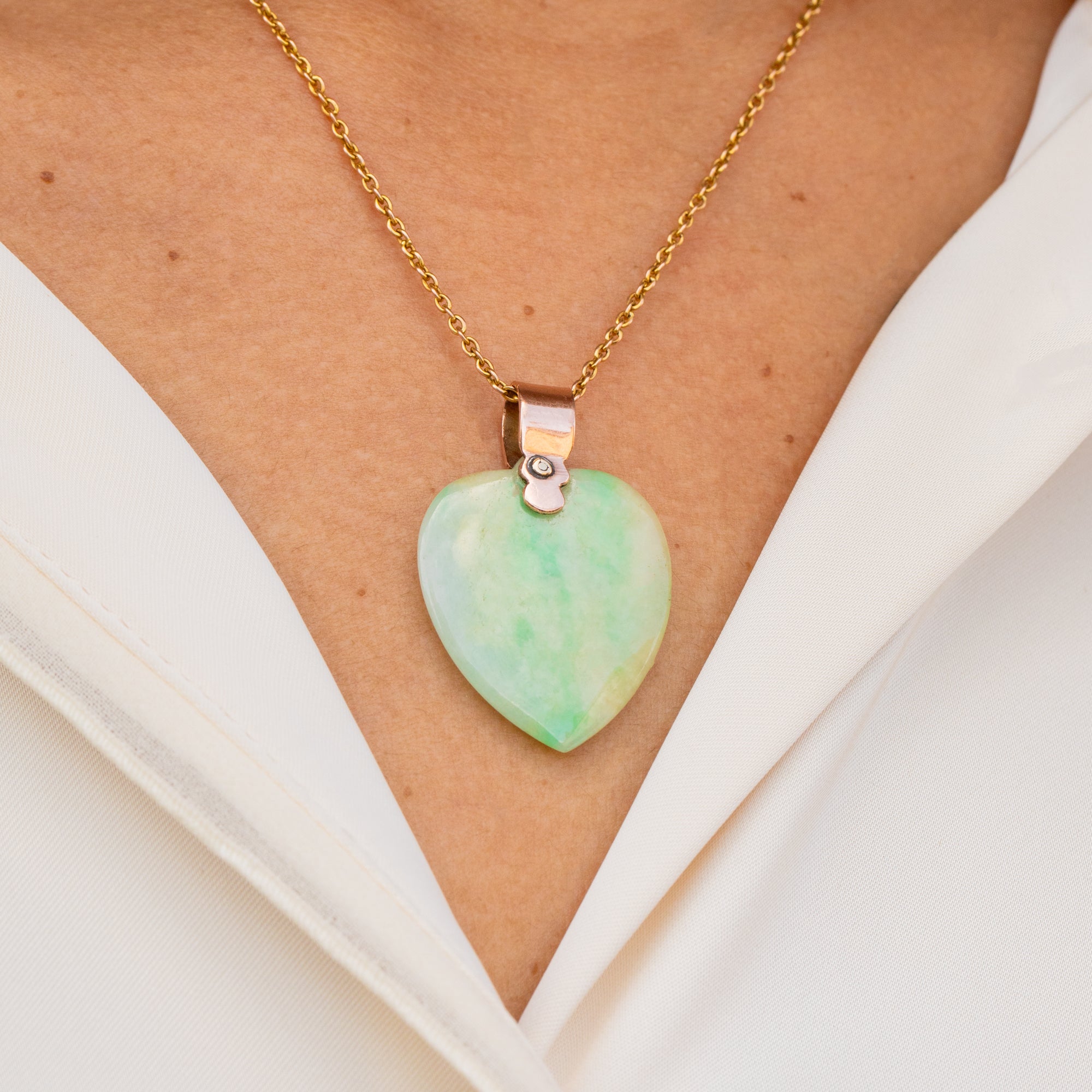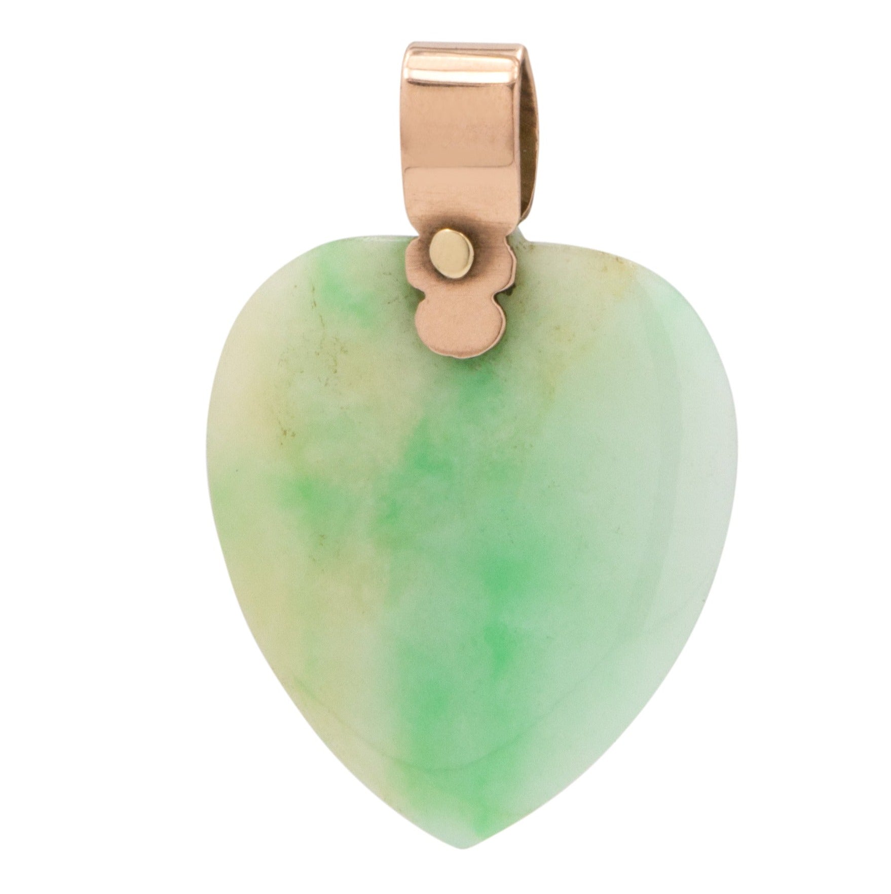 VERY GOOD. This antique 9ct Gold Jade heart pendant is in very good condition. The Jade is perfectly cut into a heart with smooth edges. Across her surface, there is some subtle wear which can be noted when looking under a loupe, but cannot be felt when running your fingers across her. The 9ct Gold bale has some darkening in the groove around the pin but has retained great shape, allowing you to securely suspend her from a chain!
