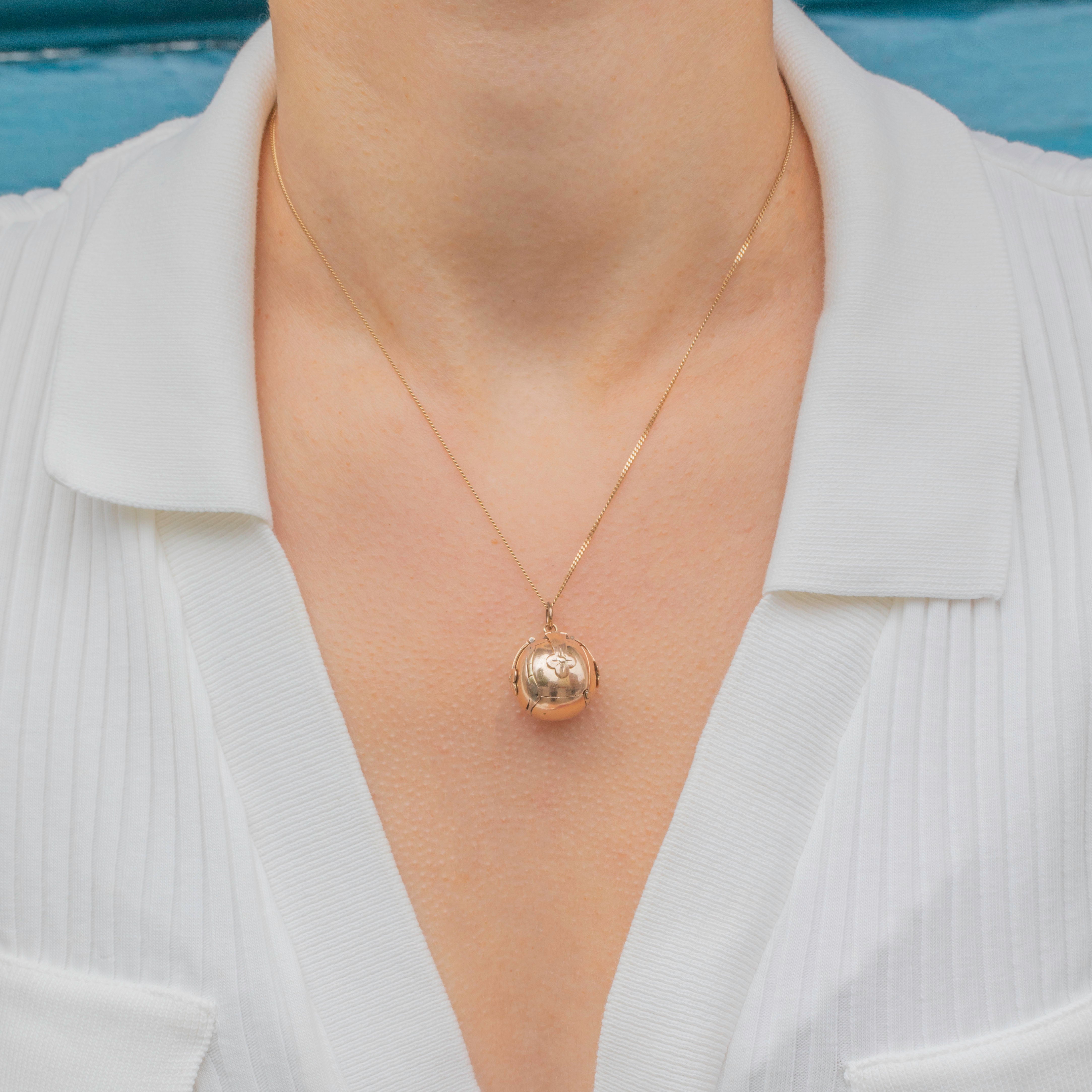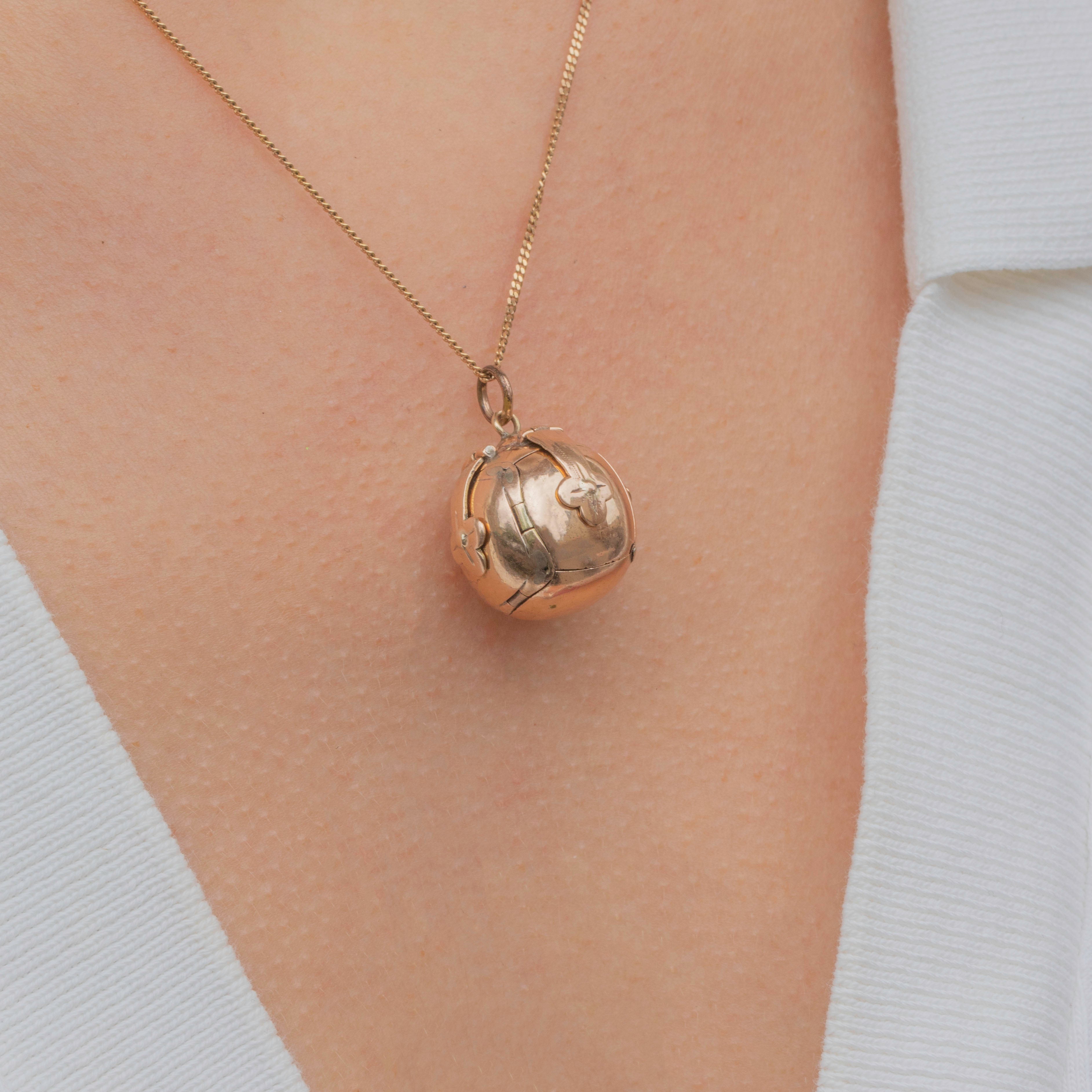 This antique 9ct Gold Masonic orb pendant is a sight to behold, with her exterior keeping the secrets of a spectacular inside. Her 9ct Gold catches light beautifully and exudes a magical glow as she rests across your décolletage.