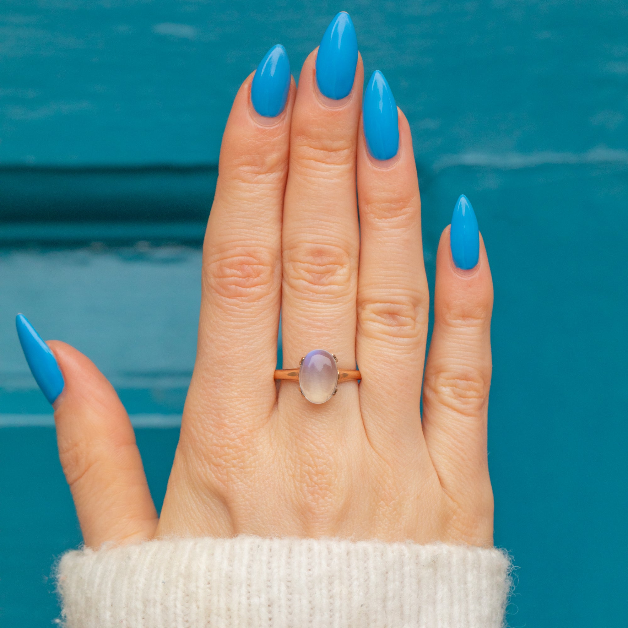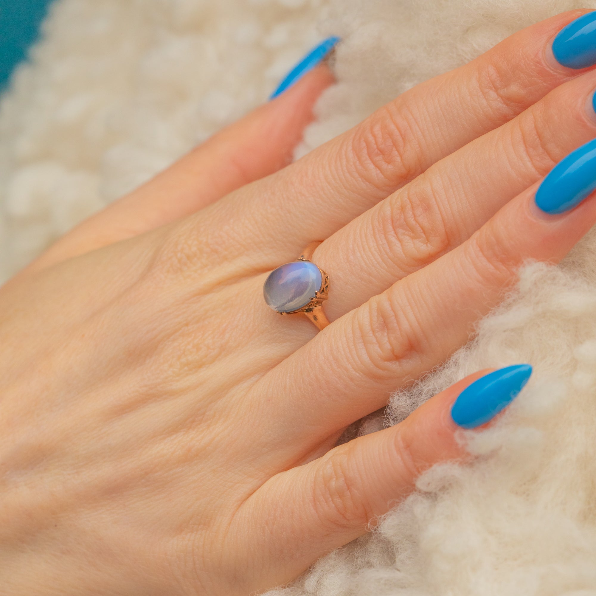 Displayed comfortably within her claw settings, this antique Moonstone ring features a gorgeous gallery and looks magnificent against the warmth of her 9ct Gold band. A stone associated with balance and relaxation, this Moonstone solitaire ring will bring a wave of calm to its wearer!