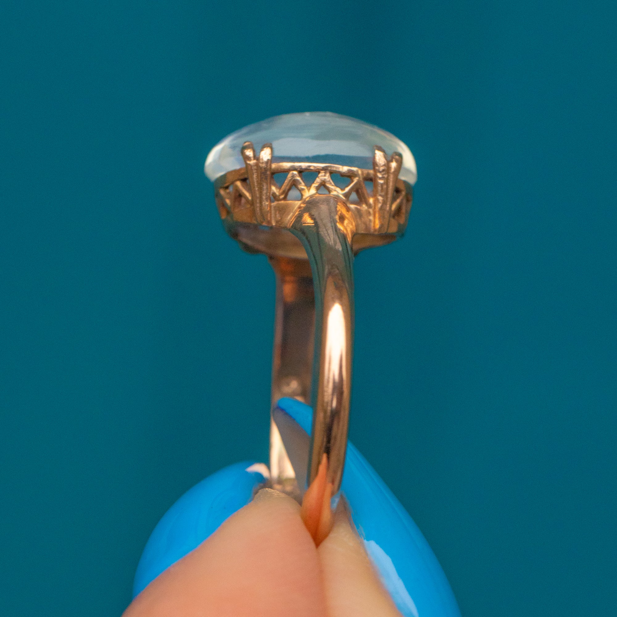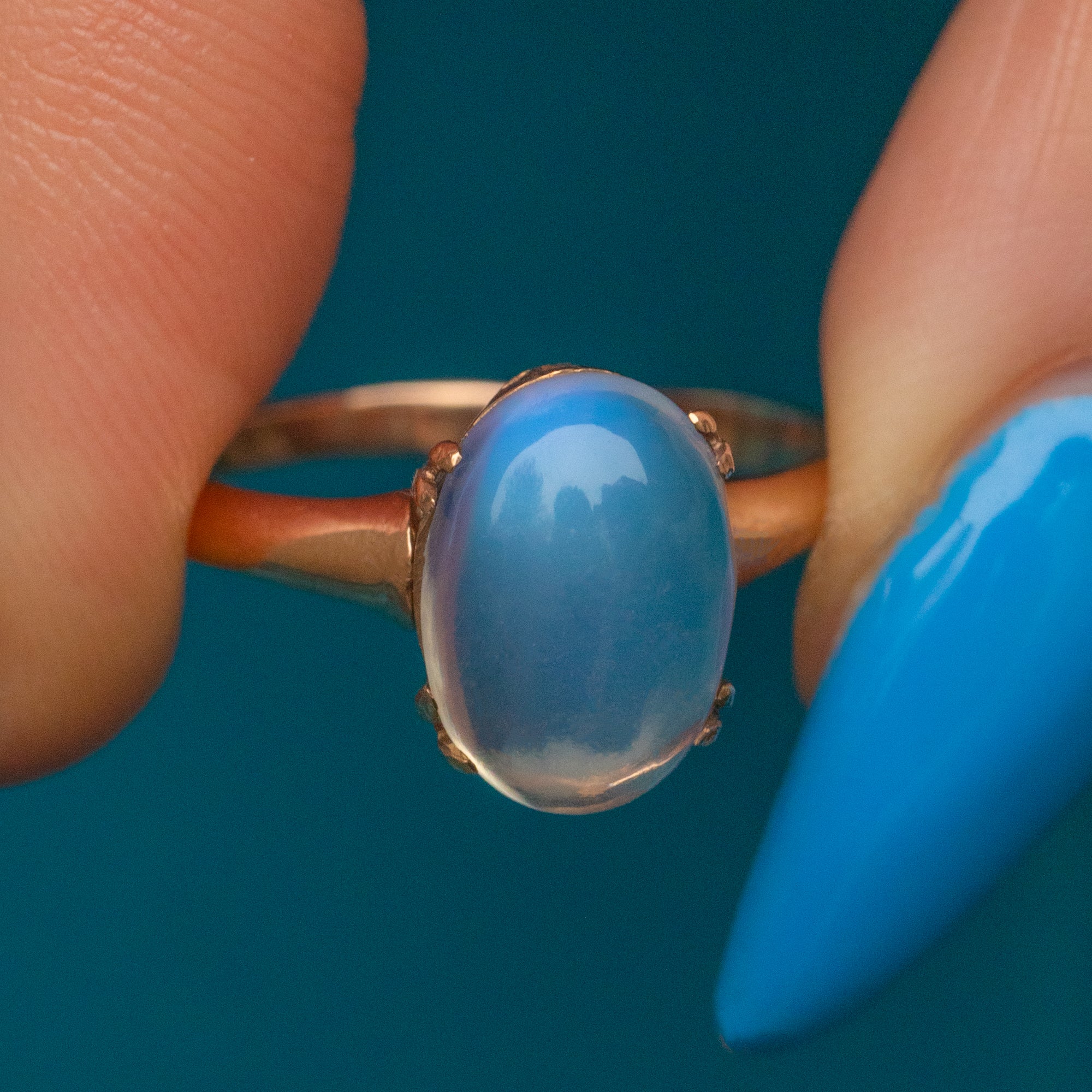 A majestic antique 9ct Gold Moonstone cabochon ring to add to your stack! Be transfixed by her soft iridescent lustre that billows across the smooth 2.70ct Moonstone cabochon; this Victorian ring is one to be admired.