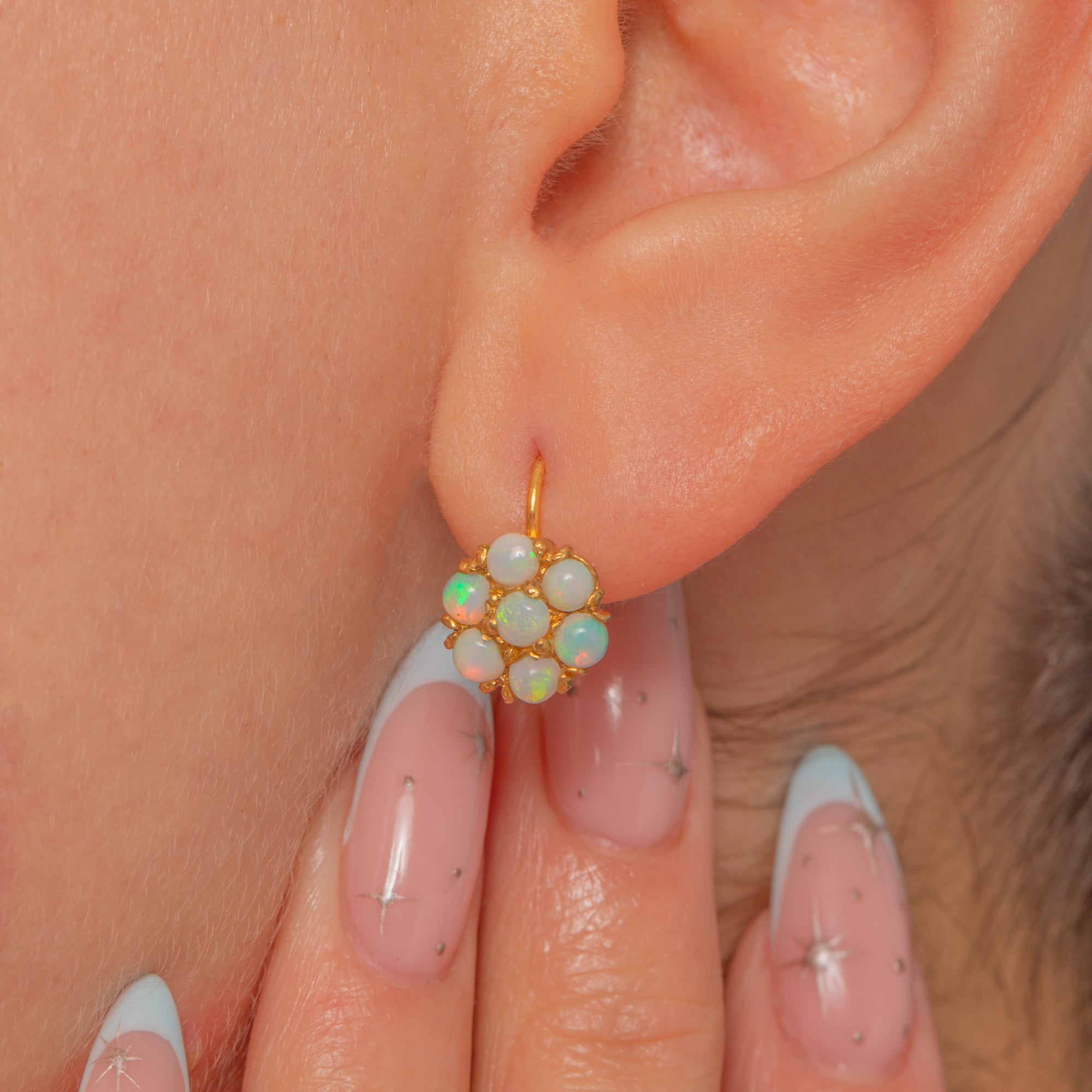 These charming Edwardian drop earrings capture the era’s romantic sensibility in glowing 9ct Gold. Each petite daisy cluster is formed of round Opal cabochons nestled in scalloped claw settings, their milky translucence igniting with pastel confetti-like flashes of green, blue and orange. The clusters suspend from simple shepherd-hook fittings for an effortlessly feminine silhouette.