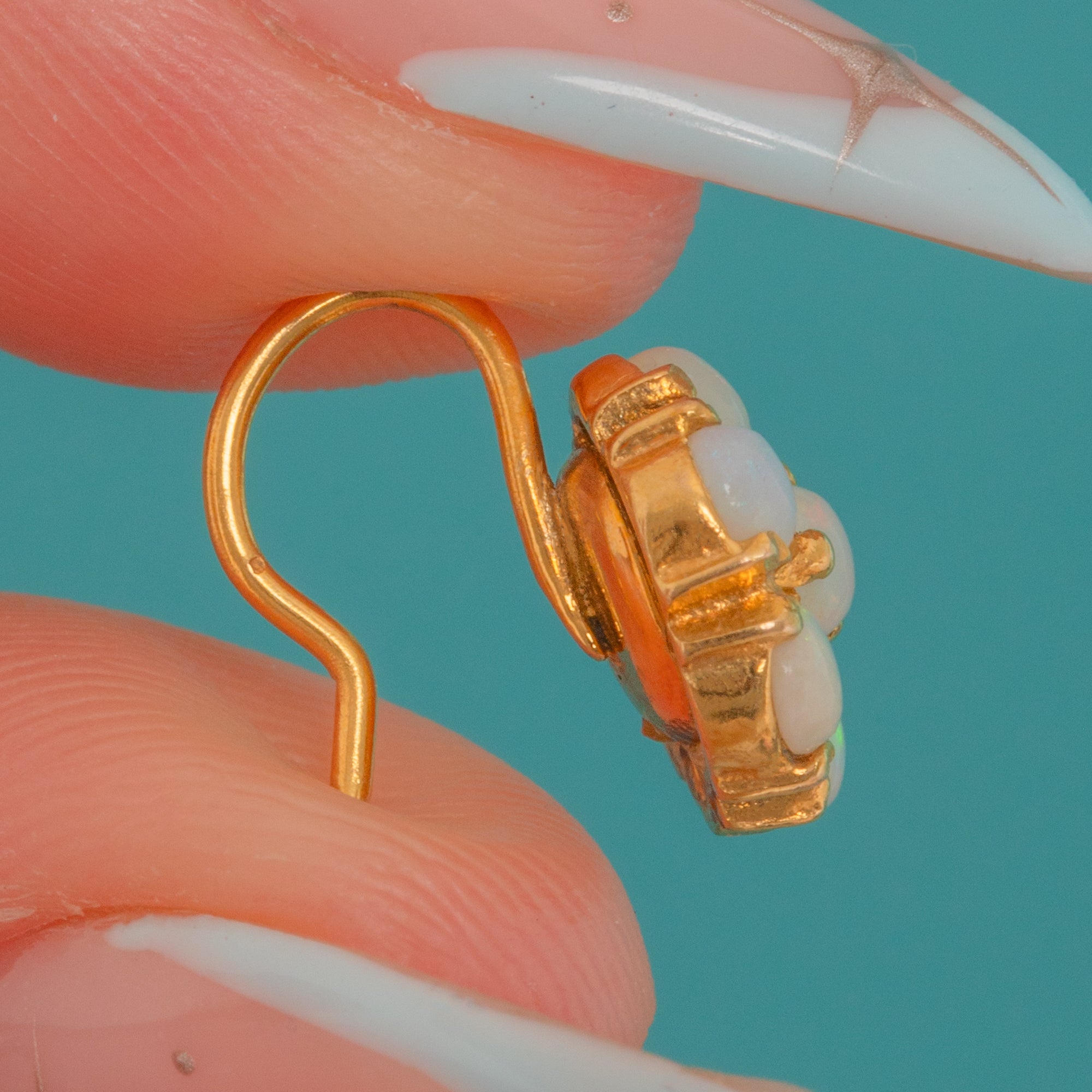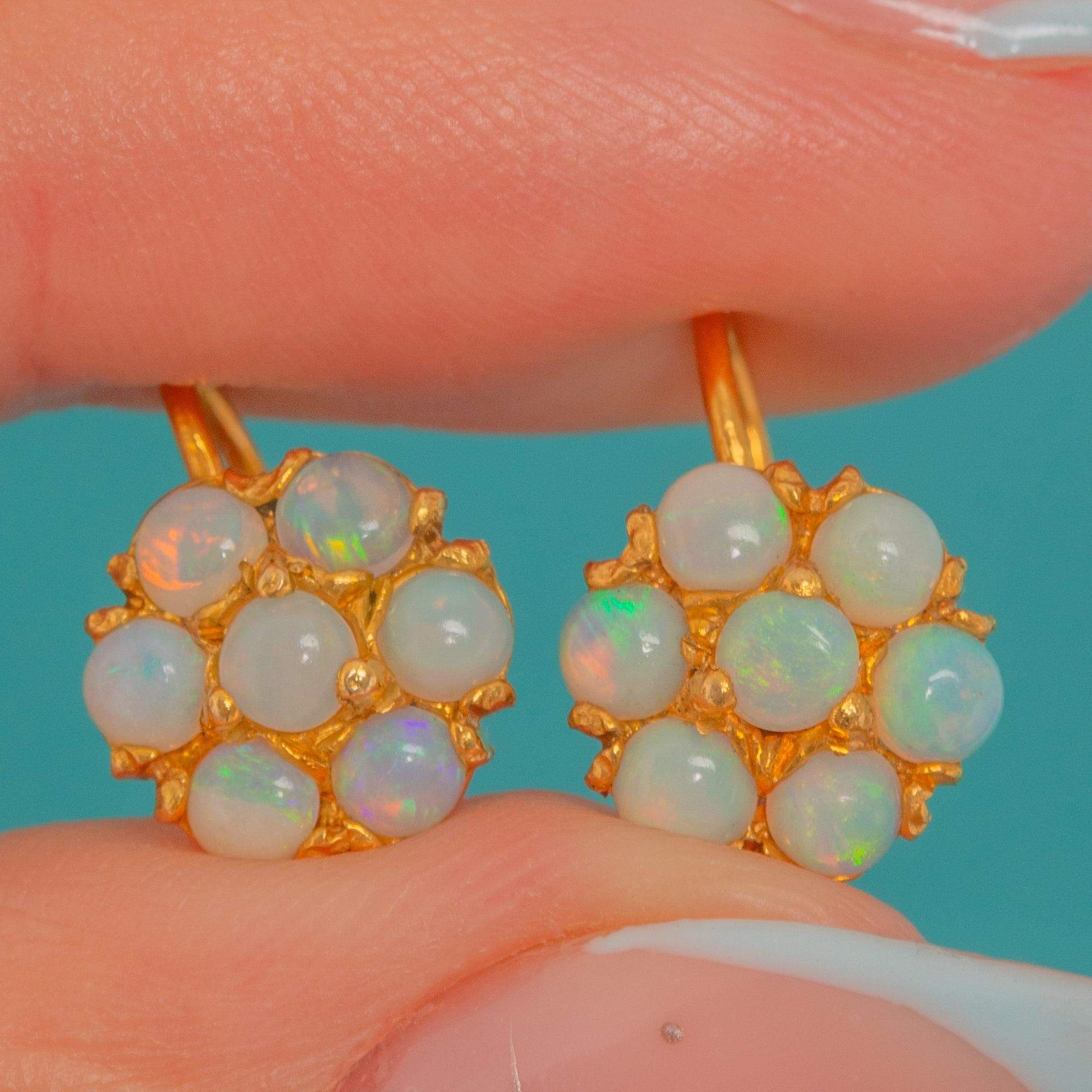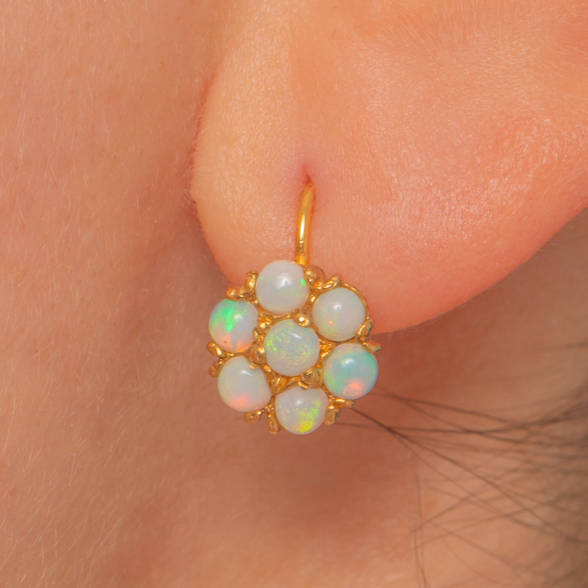 EXCELLENT: The Opals are natural, solid and display a lively array of pastel play-of-colour with no chips or abrasions visible. The settings are secure with neatly intact claws and only light age-appropriate surface wear to the Gold. Minor tool/solder marks are visible on the reverse and there is a slight bend to one hook, both stable and in keeping with careful antique wear.