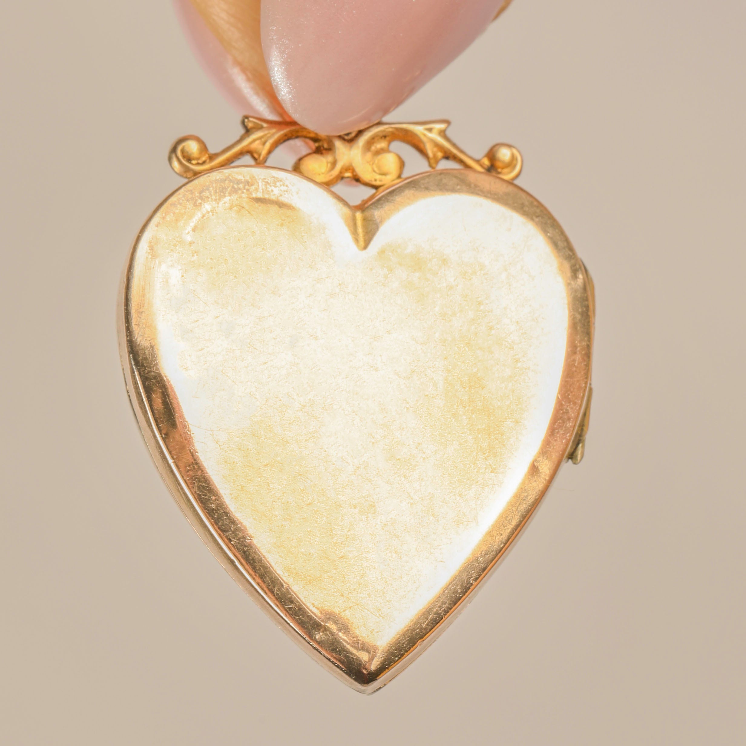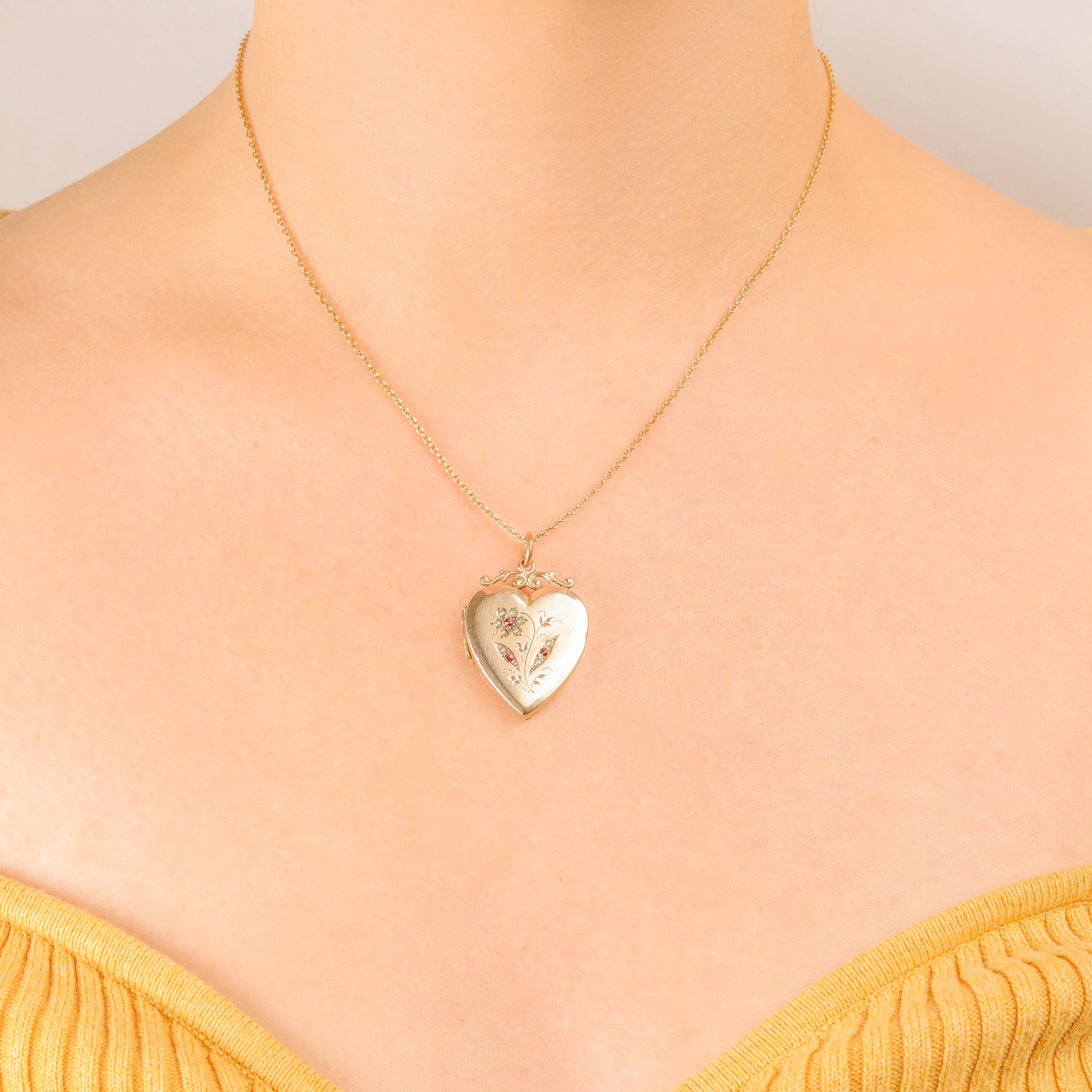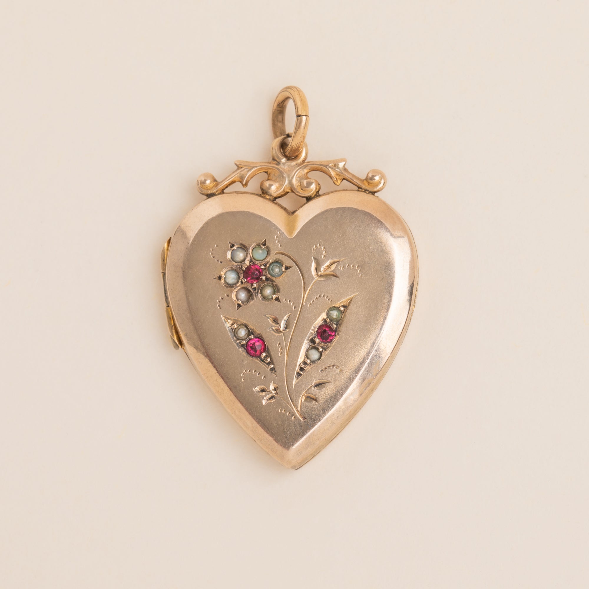 Sweet and perfect for those who love enchanting treasures, make this antique 9ct Gold Paste flower heart locket yours! Crafted from sun-kissed 9ct Gold, her curvaceous heart form is inlaid with a dainty flower formed of red Paste and a myriad of Pearls.