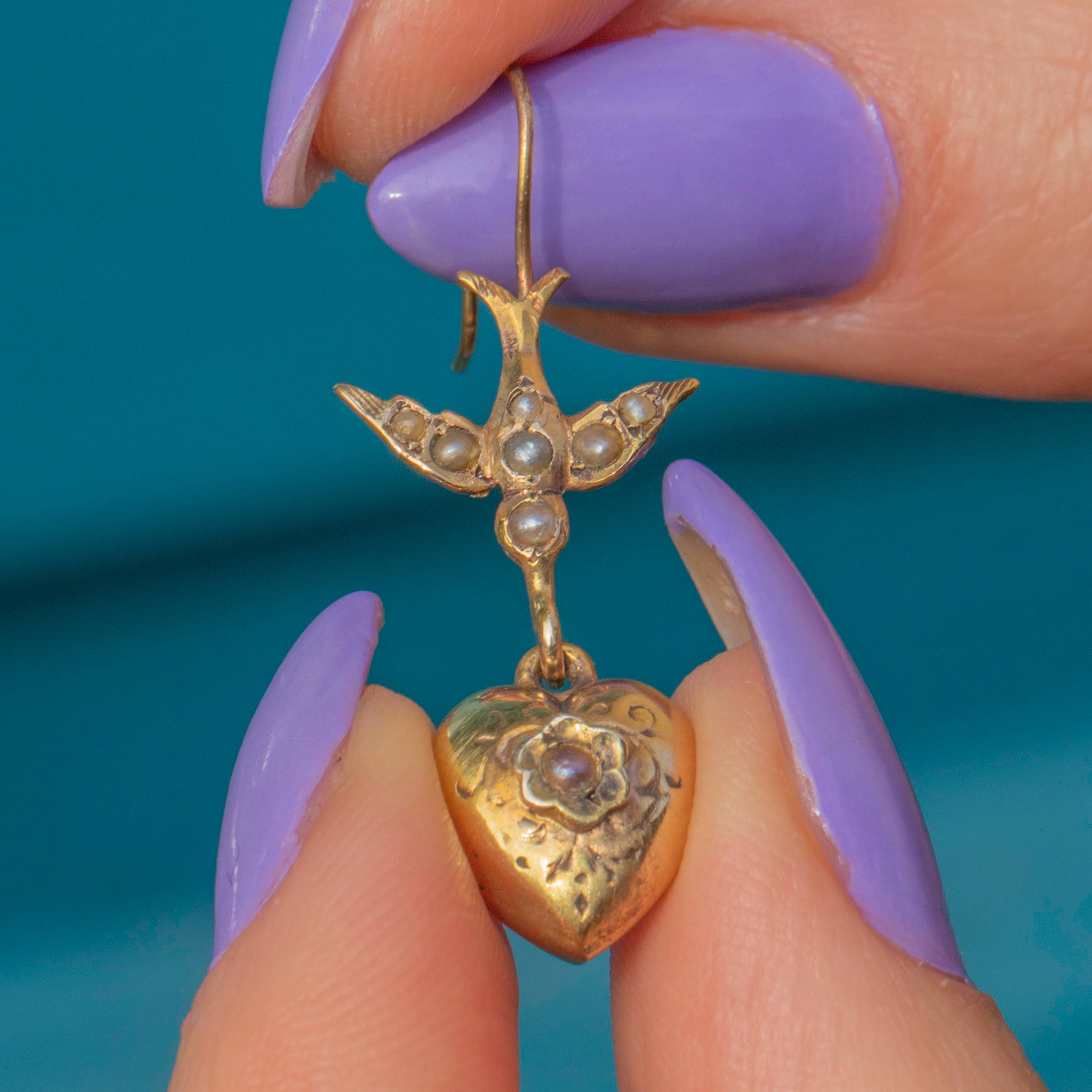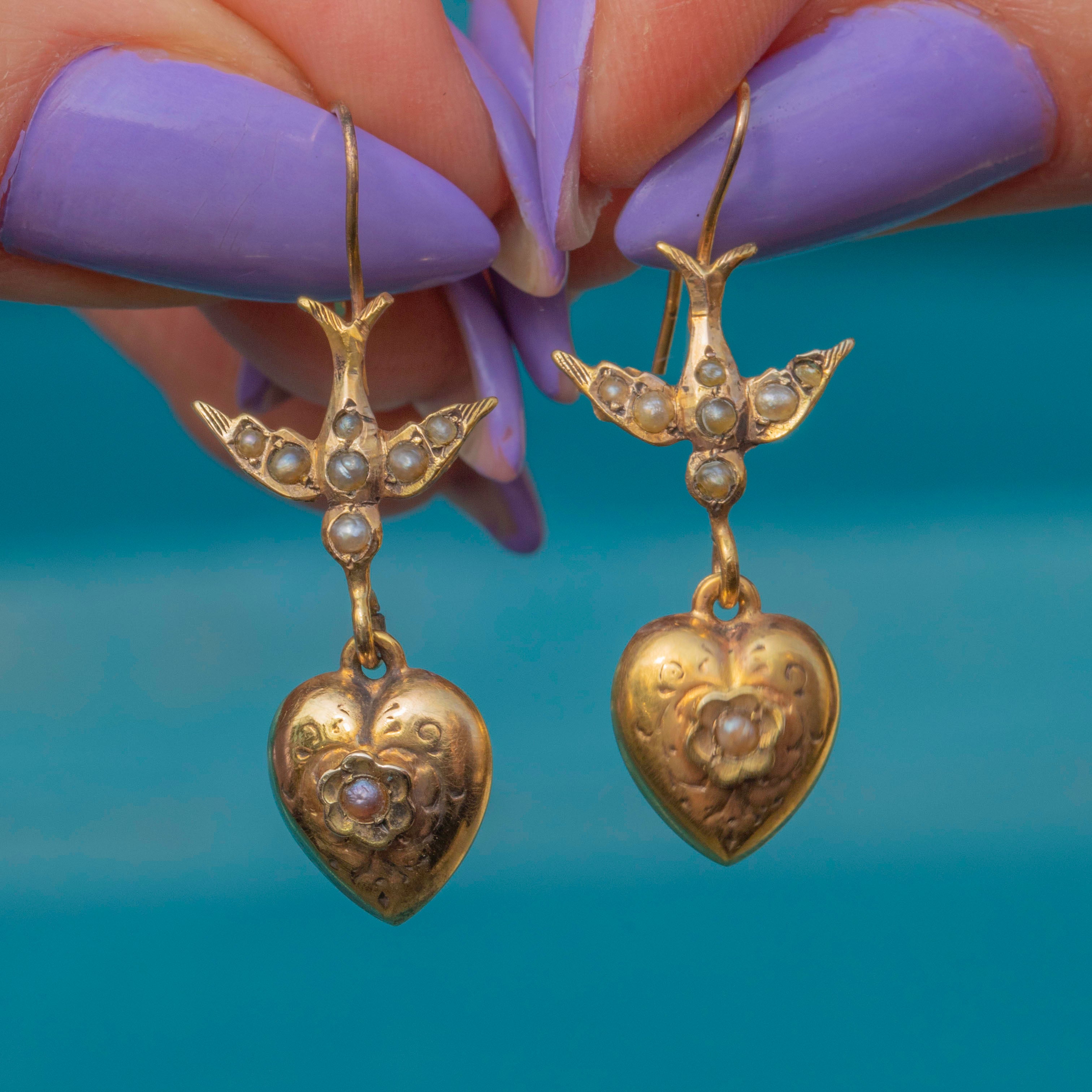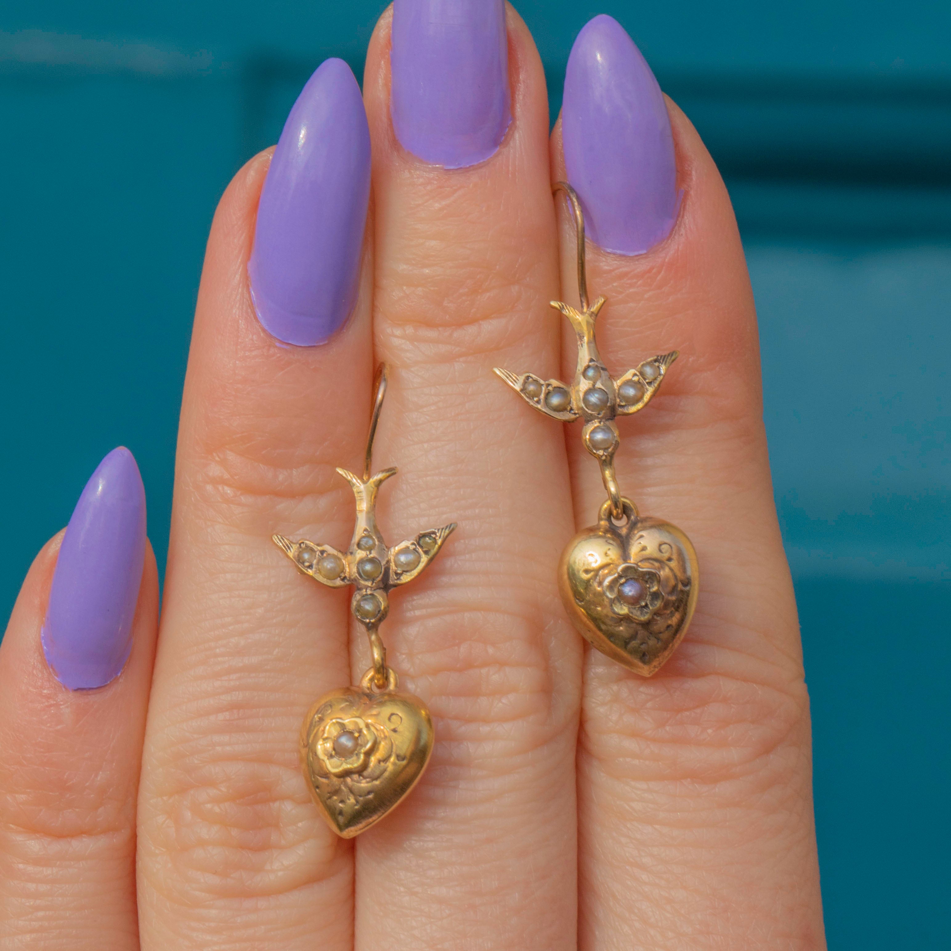 Gefertigt aus butterweichem 9ct Gold, zeigt jeder Ohrhänger eine zierliche Schwalbe, die über einem kunstvoll gravierten Herz schwebt. Jedes typische edwardianische Motiv ist mit feinen Saatperlen verziert, die diesen Ohrringen einen reizvollen antiken Charme verleihen.