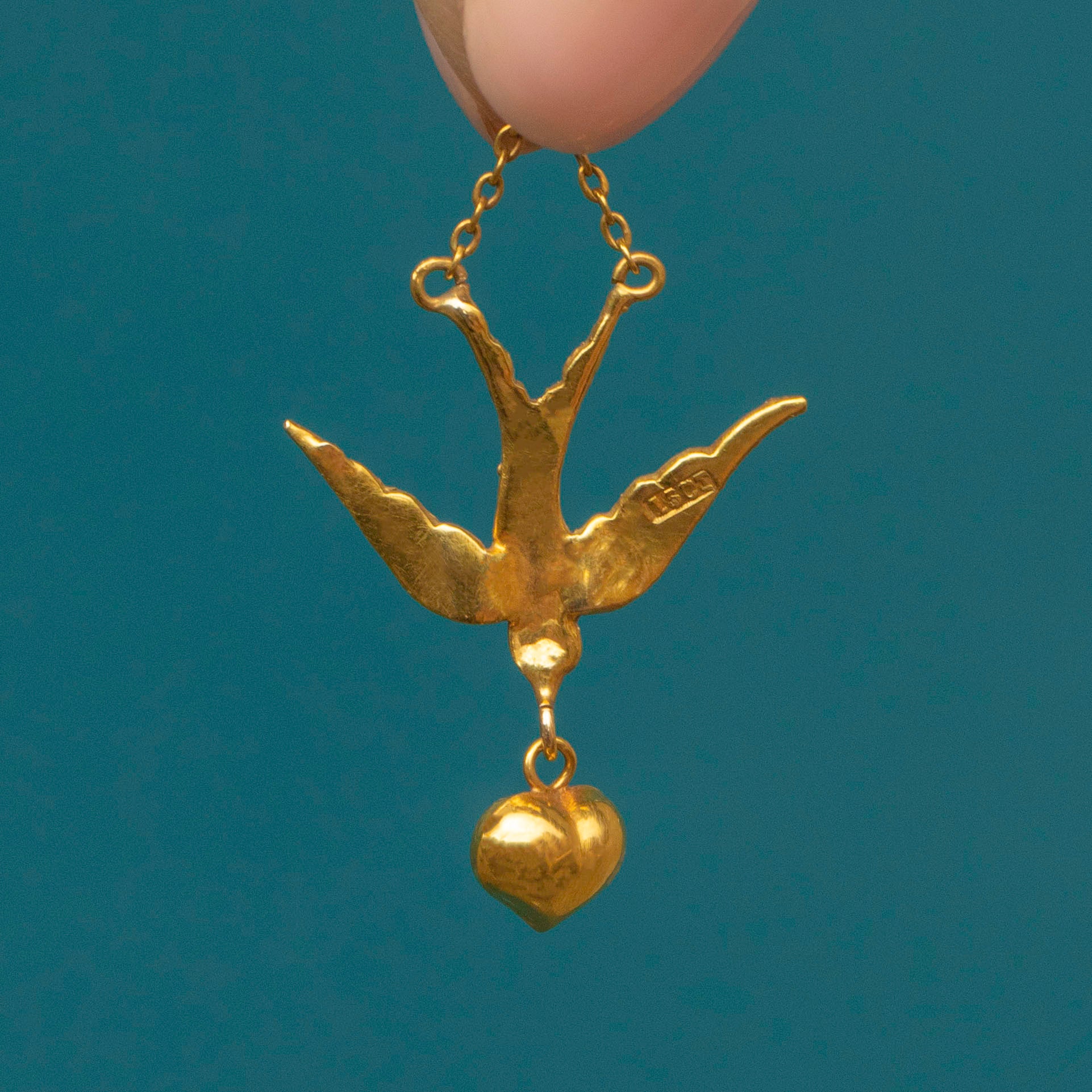 Dangling from the swallow is a smooth golden heart charm, that will sit daintily against your décolletage. Swallows held a deeply romantic significance for the Victorians, symbolising faithfulness, making her a wonderful love token. Pieces such as this were often given to loved ones embarking on a journey or those left behind, serving as a poignant reminder of shared love. The perfect parting gift for your long-distance love!