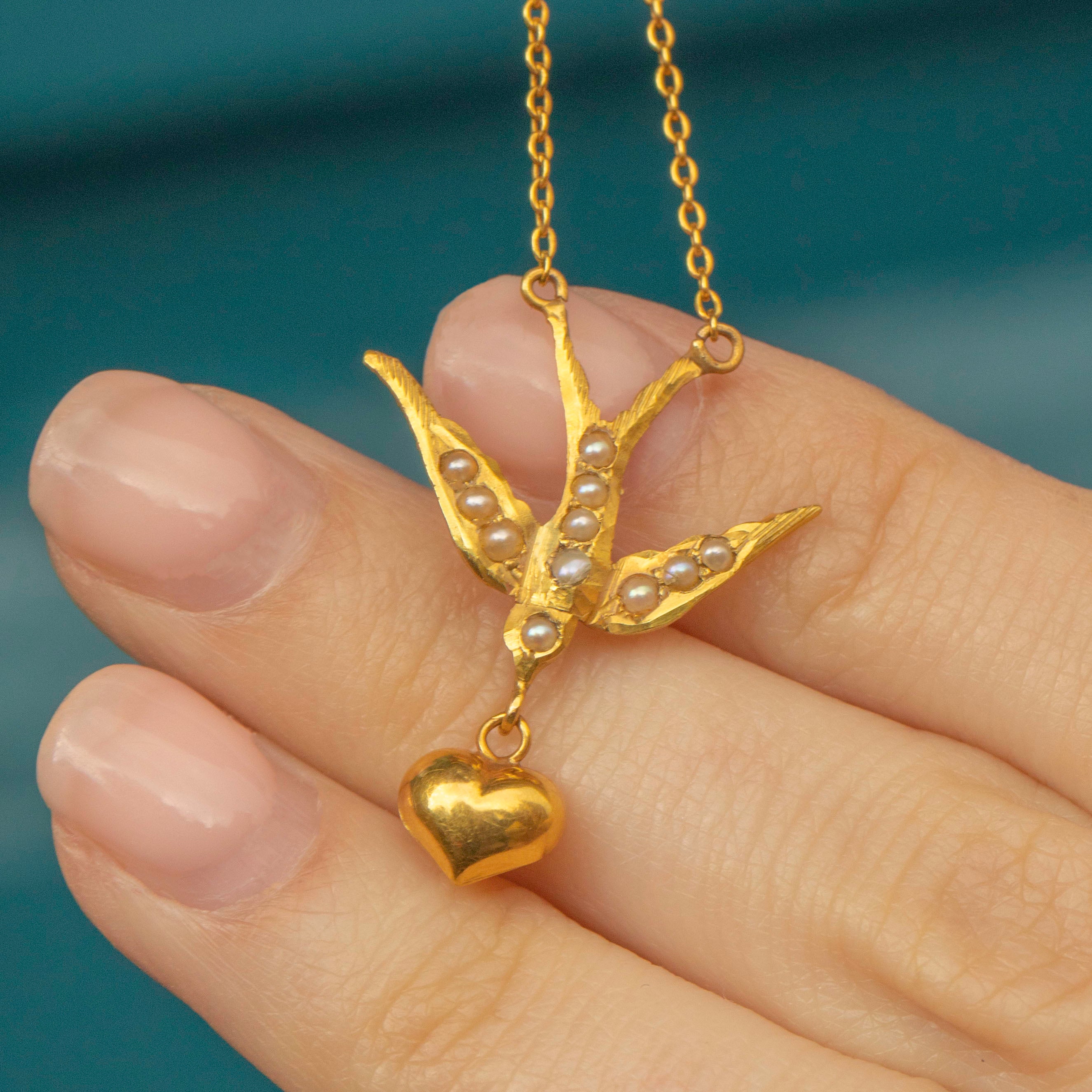 EXCELLENT This antique 9ct Gold Pearl swallow heart necklace is in excellent condition. Her swallow is perfectly formed and securely suspended from her well-preserved 9ct Gold chain. The glowing Pearls are all held securely in their settings,  allowing for confident and dependable wear. You will want to take this sweeping swallow with you wherever you go!