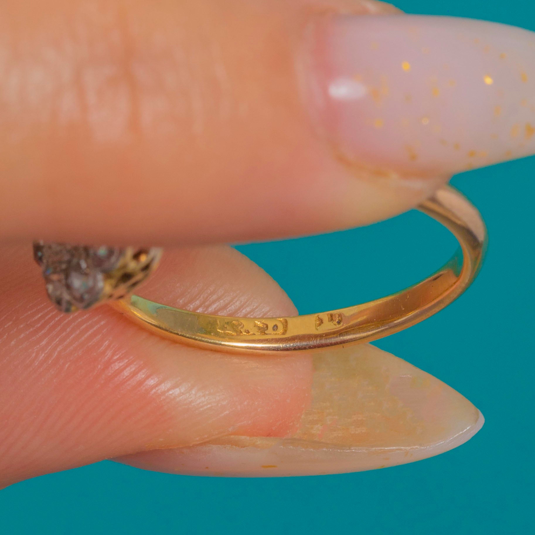 EXCELLENT: Diamonds are bright and well-matched with no obvious chips or abrasions, all securely set within crisp millegrain collets. The 9ct Gold shank shows only light surface wear consistent with age; the Platinum settings and openwork gallery remain well-defined. No obvious resizing seams or restoration work visible.