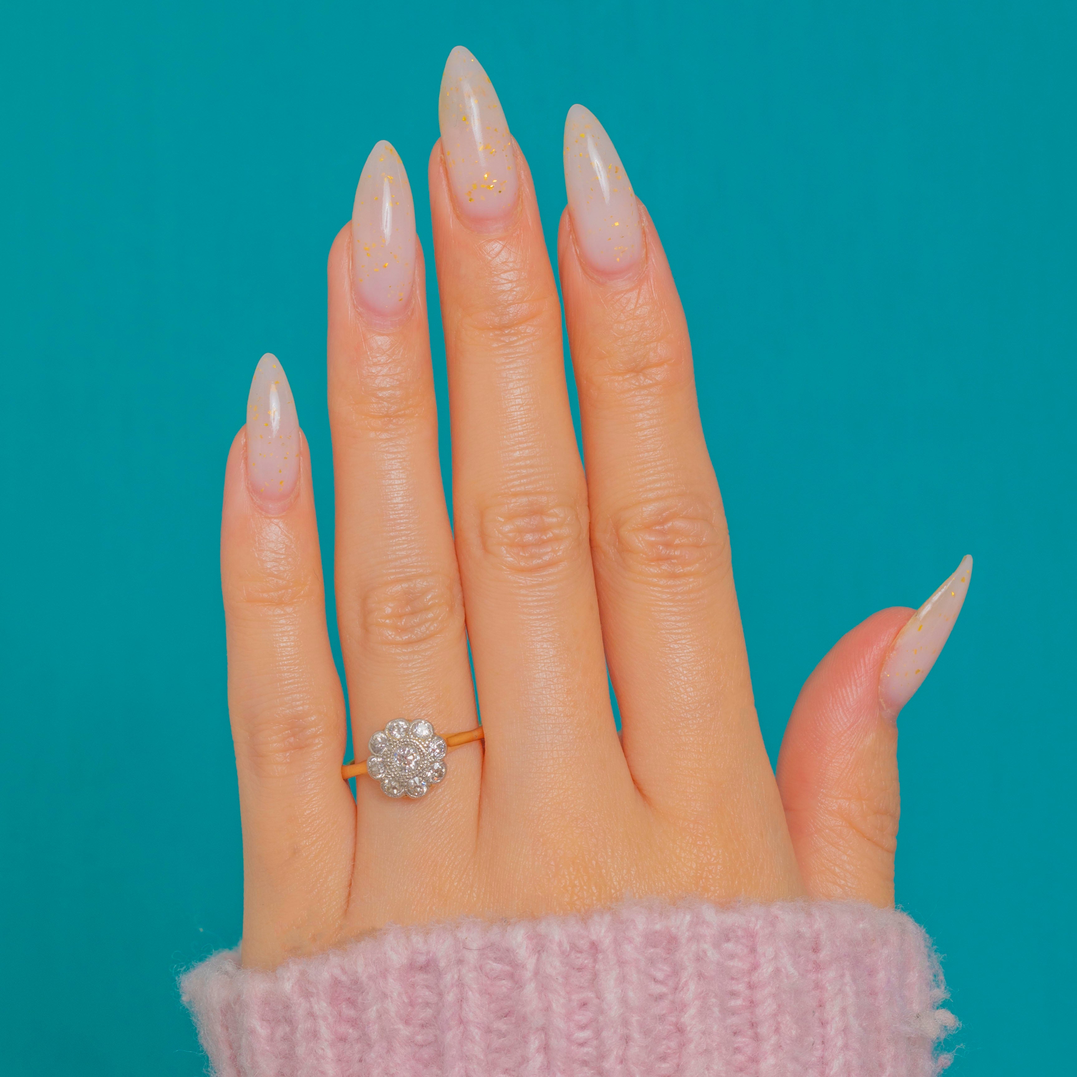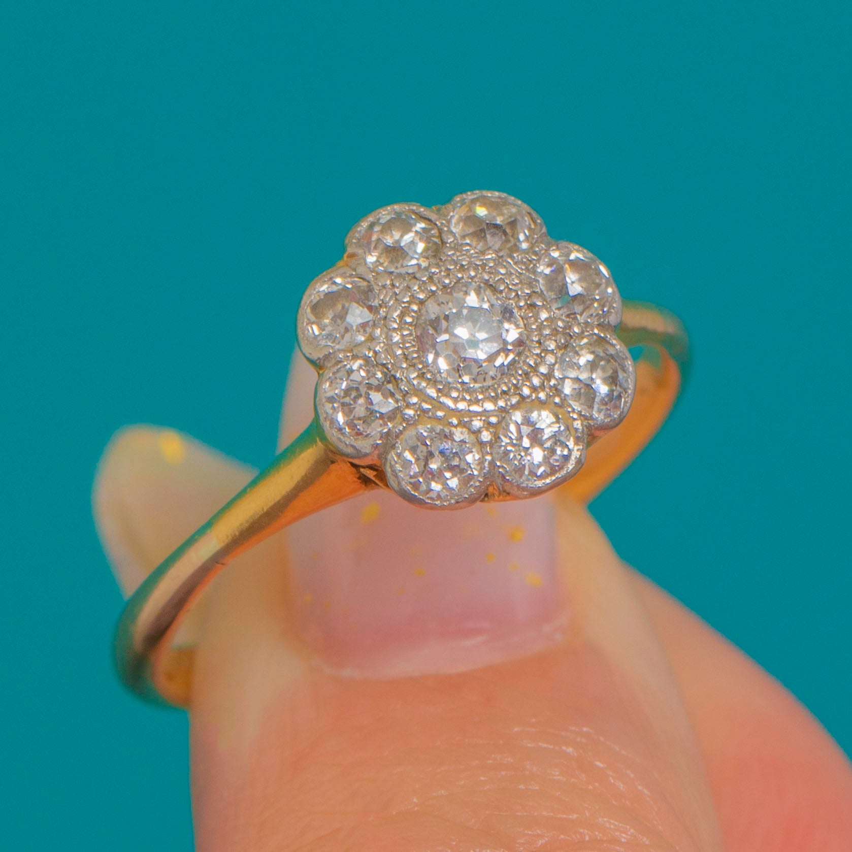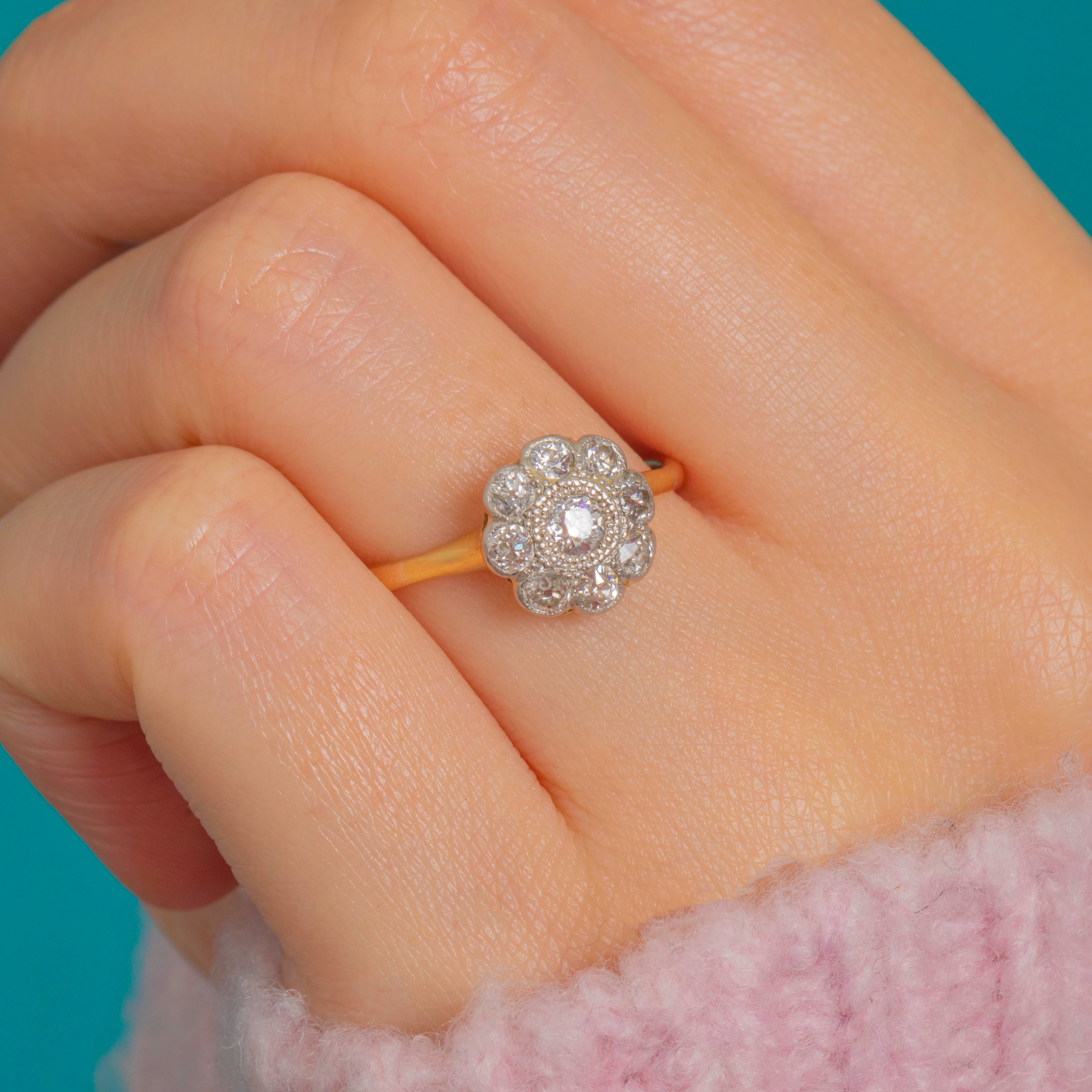 Charmingly refined and effortlessly wearable, this Art Deco Diamond cluster ring marries a cool Platinum-topped head with a warm 9ct Gold band. A radiant round Diamond sits at the centre, haloed by eight sparkling companions, each neatly framed with delicate millegrain for that quintessential period finish. The floral rosette silhouette, petite in scale yet wonderfully bright, feels timeless and elegant from every angle.