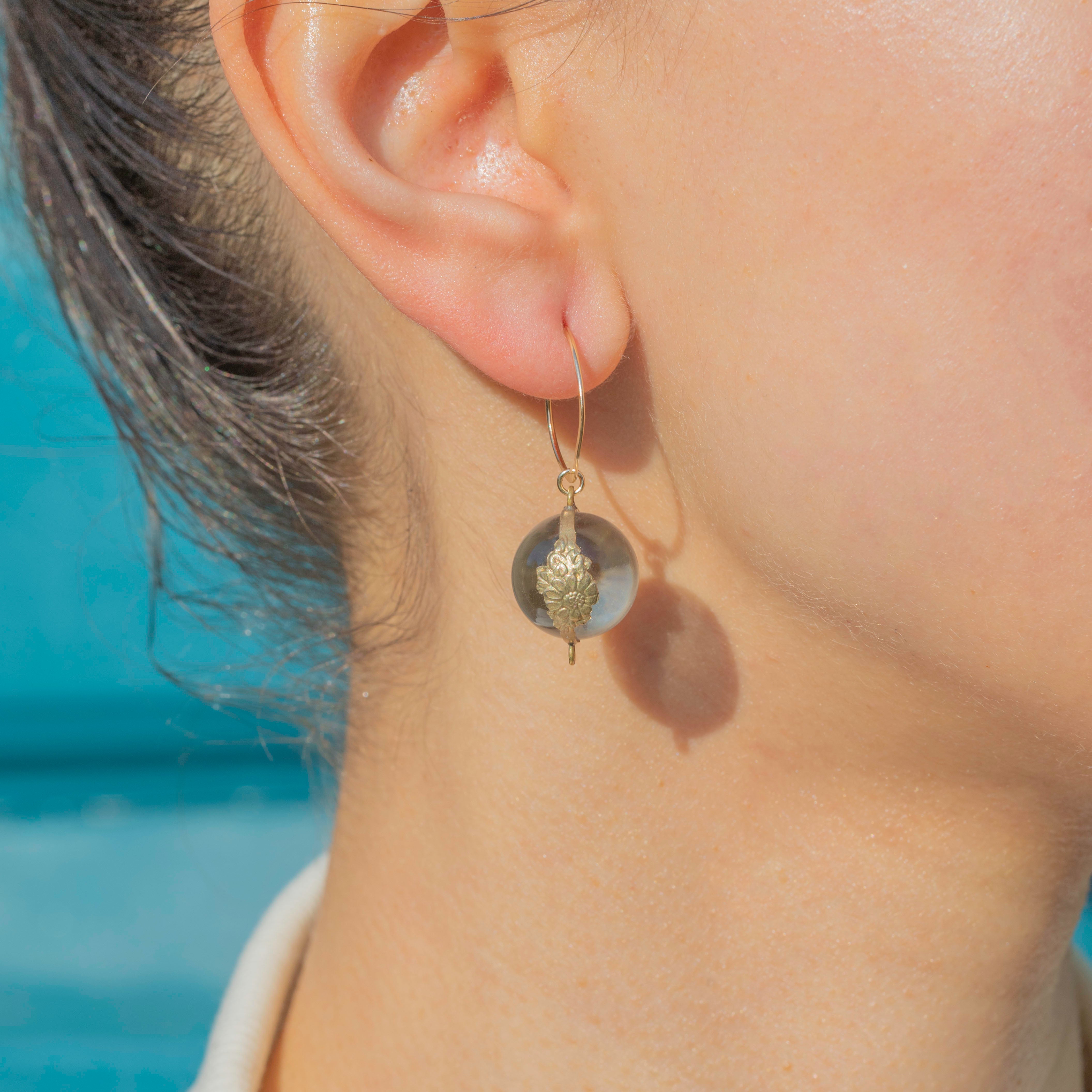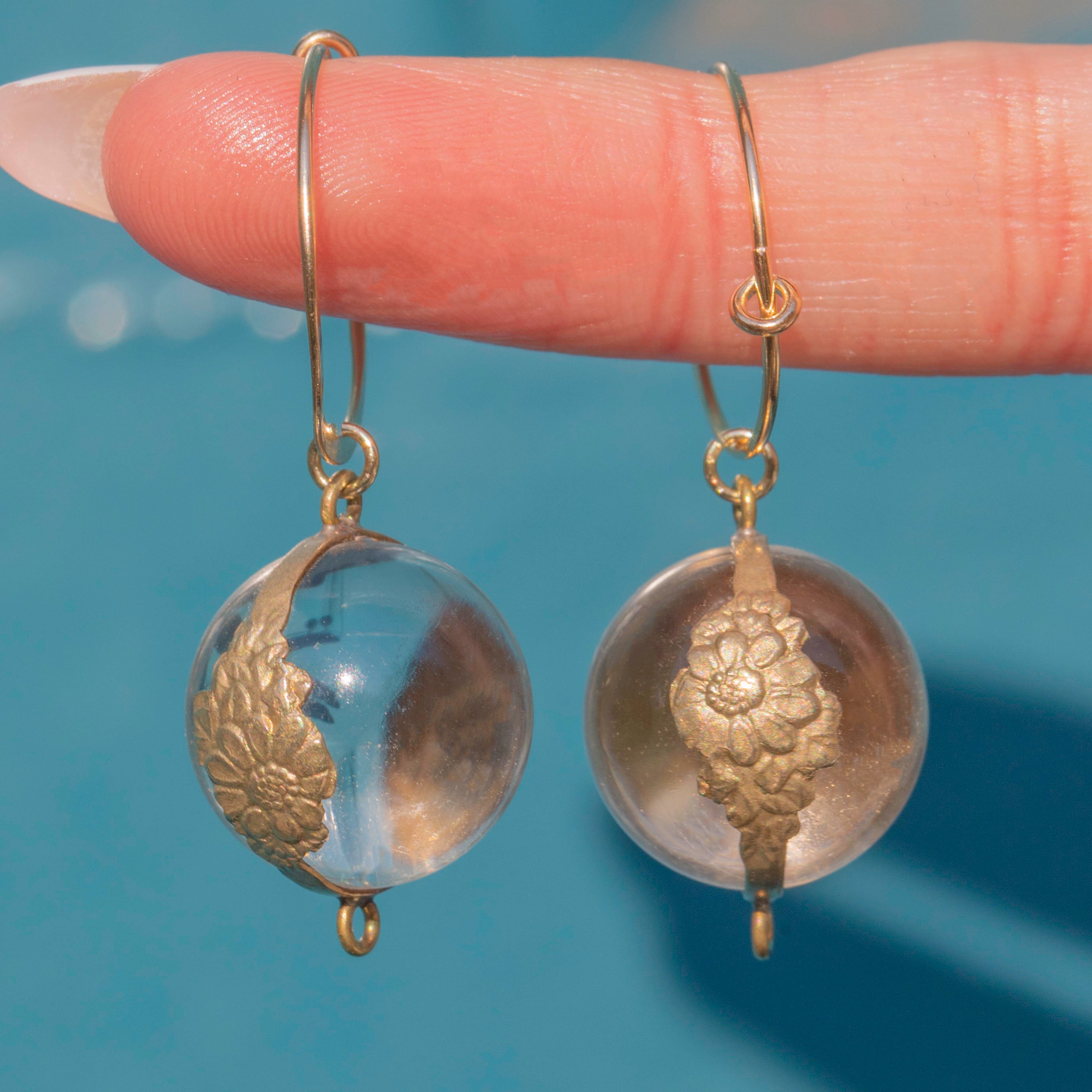 Antique 9ct Gold Pools of Light Rock Crystal Earrings with Hoop, Floral Settings