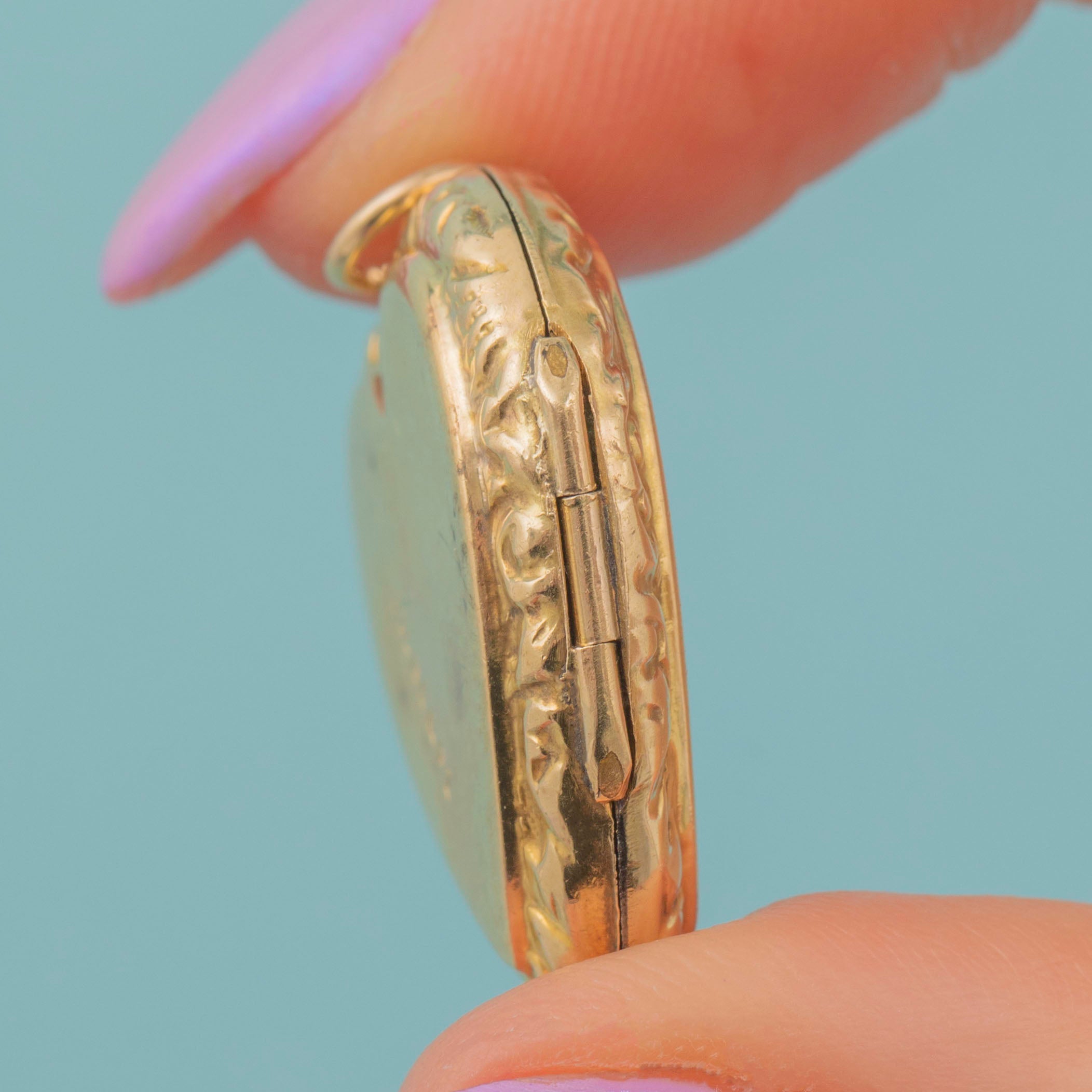 VERY GOOD. This antique 9ct Gold repoussé heart locket is in very good condition and is brimming with charm. The Gold has a lovely buttery hue and the repoussé border is defined with no signs of surface wear. The Gold does have some small areas of discolouration and minor surface scratches, and the detailing down the centre of the locket softened slightly with age. However, this wear isn't overly noticeable and does not detract from the beauty of the piece. Best of all, the locket closes with a wonderfully satisfying click—ready to keep your cherished memories safe for years to come!