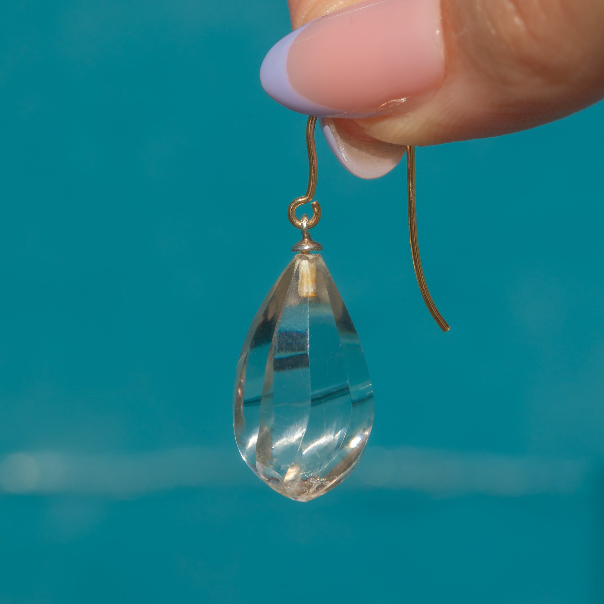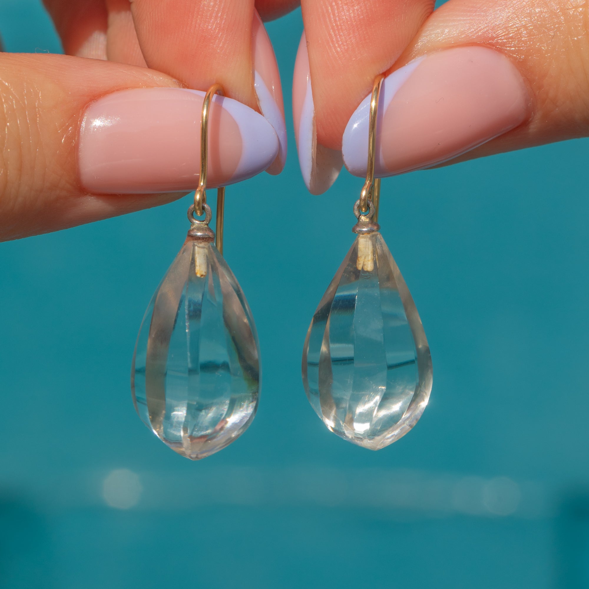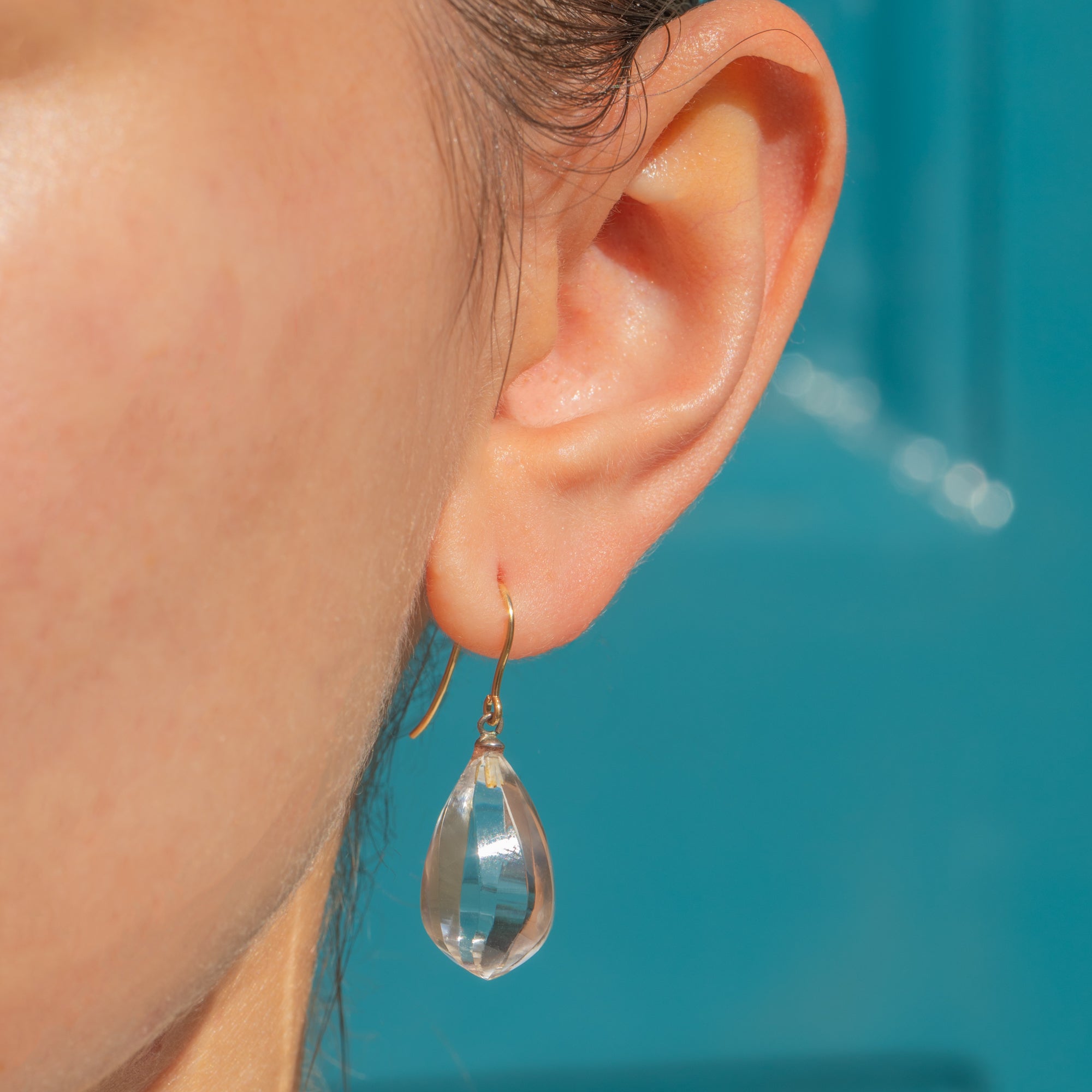 Skillfully hand-cut Rock Crystals are suspended from pretty 9ct Gold hooks, their crisp facets creating quite the display as they dance in the light. Complete with long and slender ear hooks, you can wear these beauties from day until night with ease.