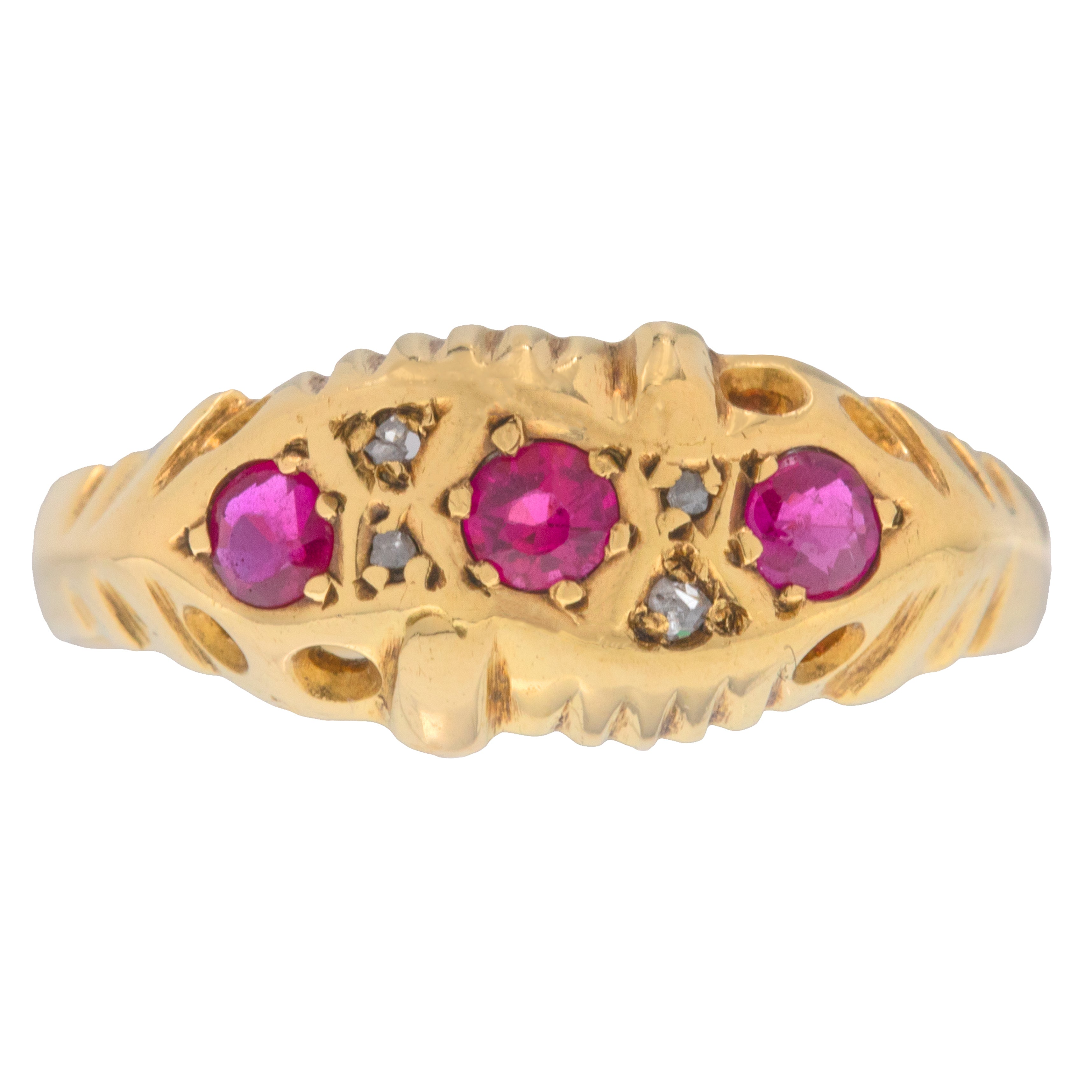 Exuding luxury from her every crevice, this antique 18ct Gold Ruby Diamond ring will make a delightful addition to your collection! Crafted from solid 18ct Gold, this ring boasts three fuschia-hued Rubies set across her centre accompanied by a sprinkling of dainty rose-cut Diamonds adding a subtle twinkle as they catch the light.