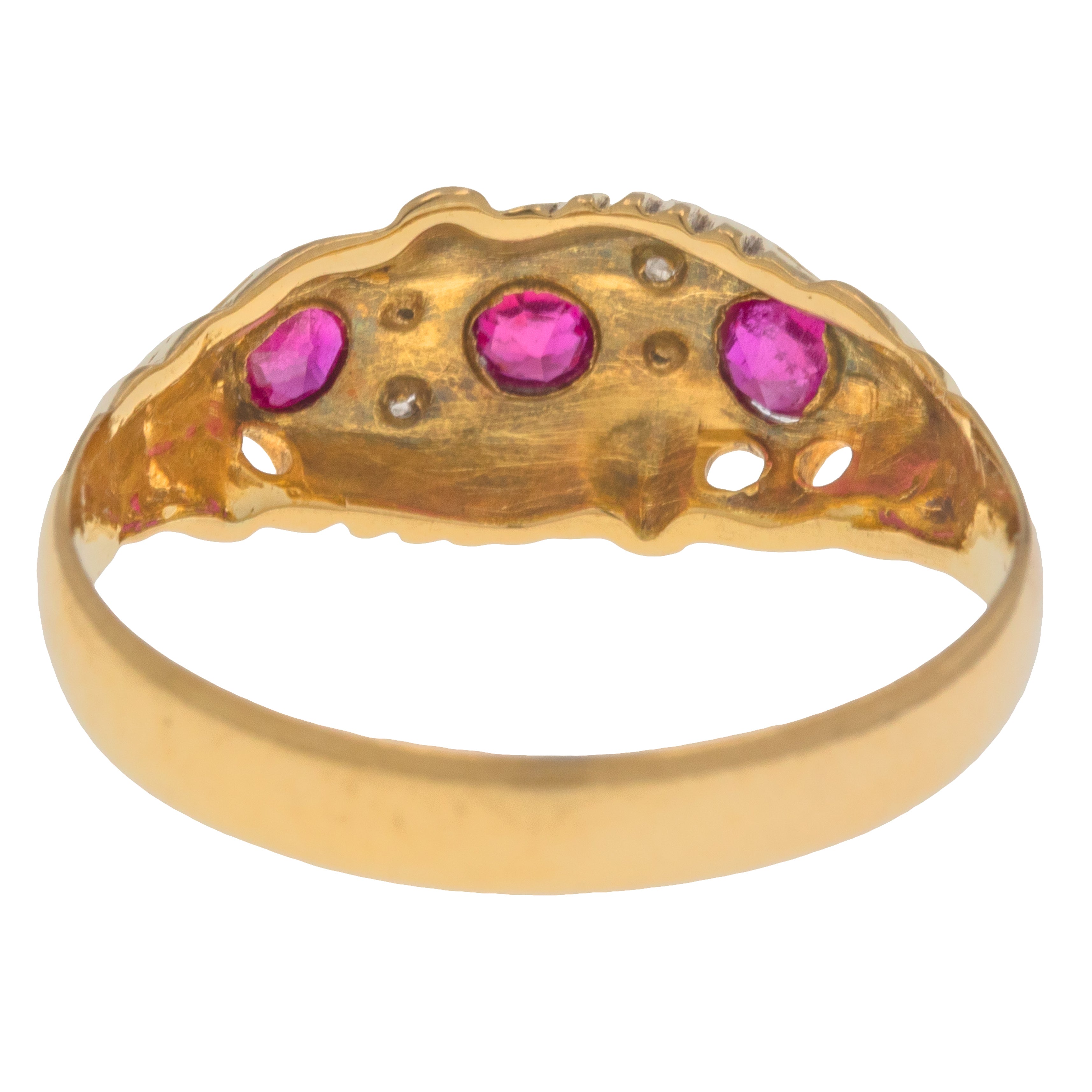 EXCELLENT. This antique 18ct Gold Ruby Diamond ring is in excellent condition throughout. The Gold is saturated and all of the details have remained crisp. The gemstones are all present and securely set, free from any chips or fleabites. With a full set of hallmarks on the inside of the band allowing us to accurately date her to 1919, this is a highly collectible ring ready to be adored for years to come!