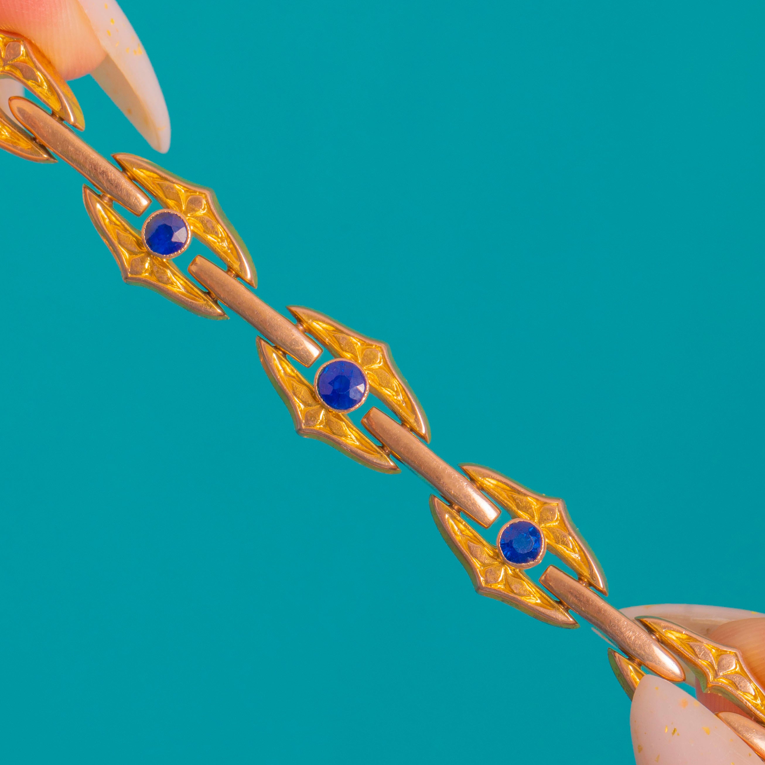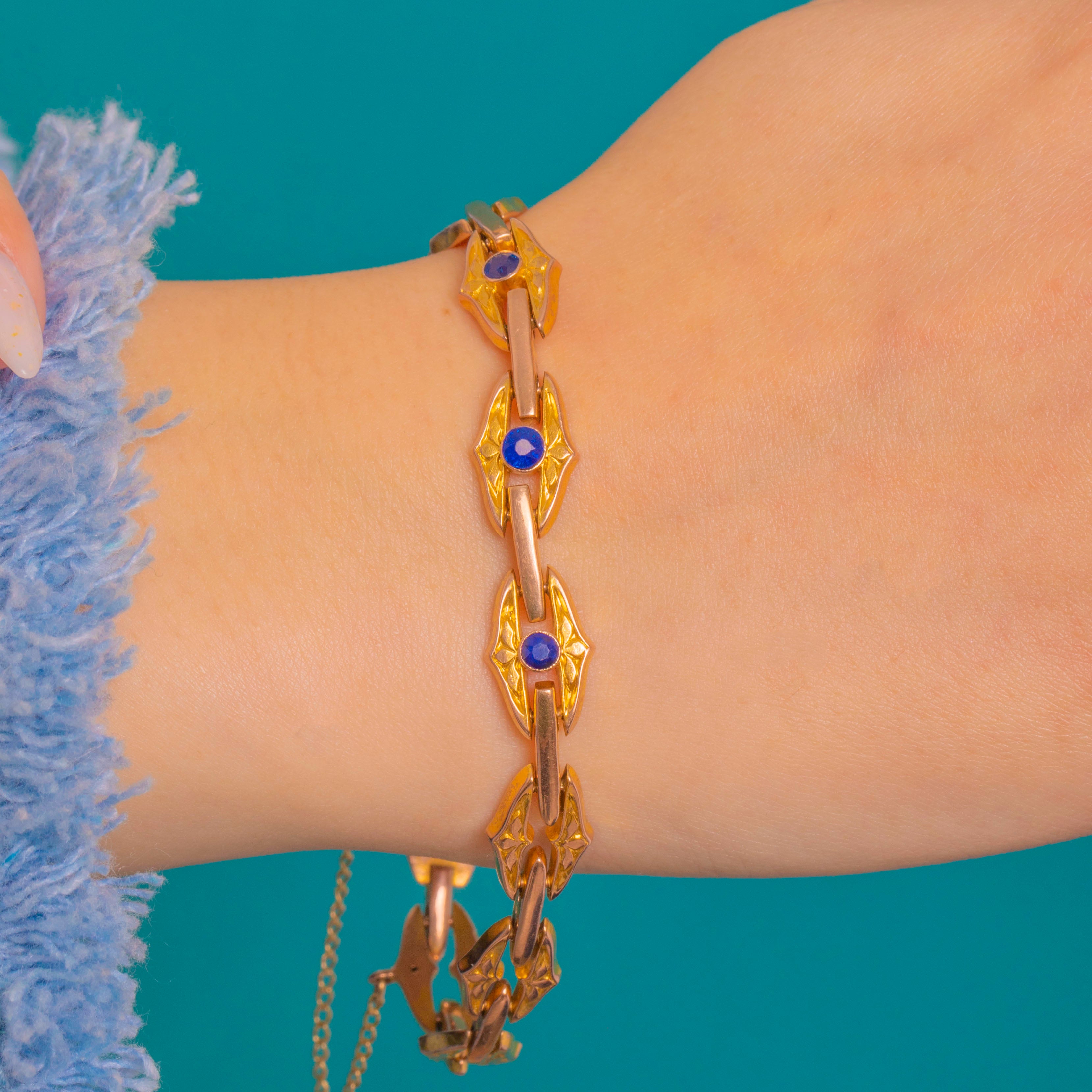 A refined Victorian bracelet crafted in two-tone 9ct Gold, its warm rose Gold bars alternating with elegant yellow Gold navette plaques. Each plaque is softly chased and centred with a round Sapphire in a neat rubover setting, creating a rhythmic line of vivid blue highlights across the wrist.