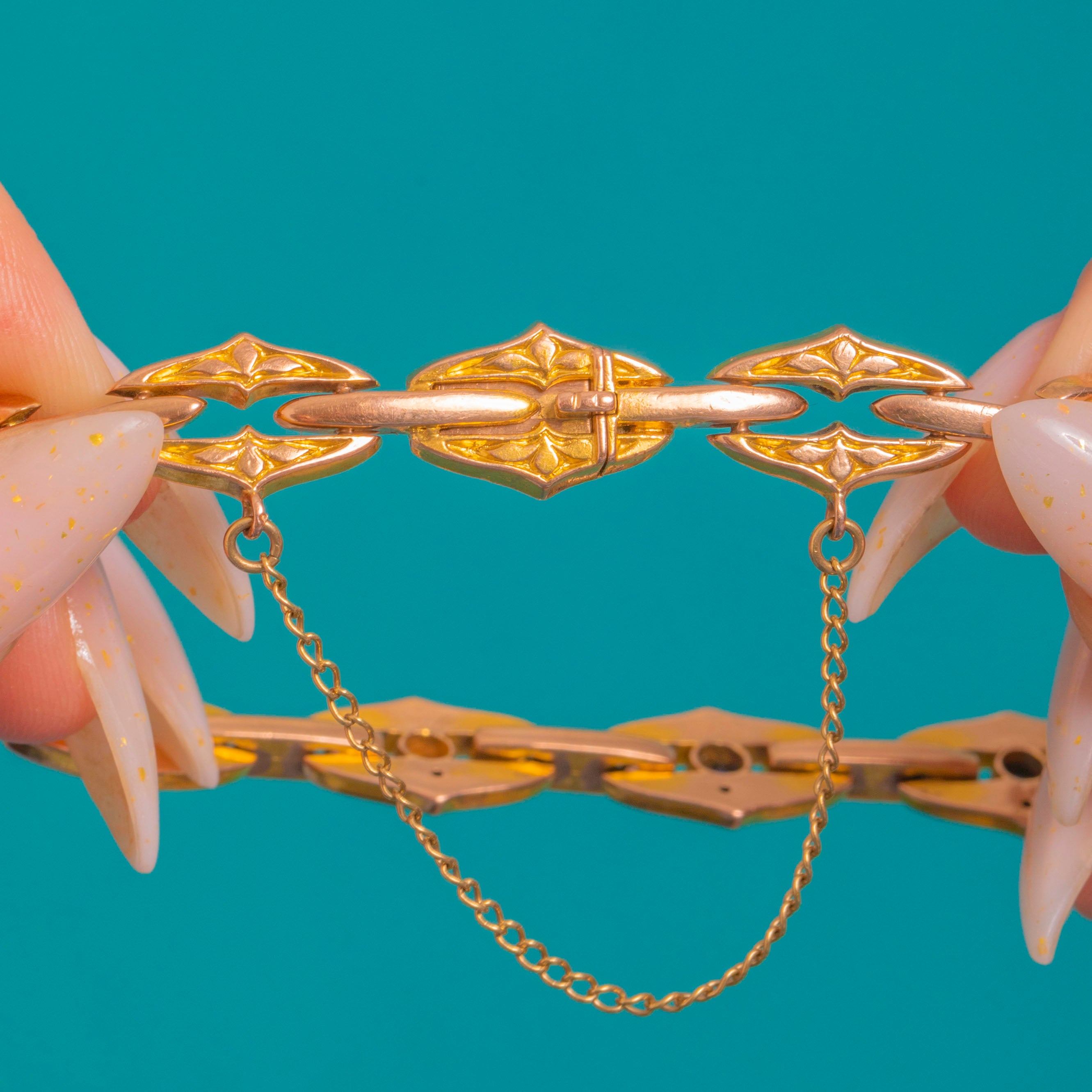 Beautifully articulated for a fluid drape, it closes with an integrated box-and-tongue clasp and a safety chain for peace of mind. The harmonious interplay of geometry, subtle engravings and rich colour makes this a timeless piece with unmistakable Victorian charm.