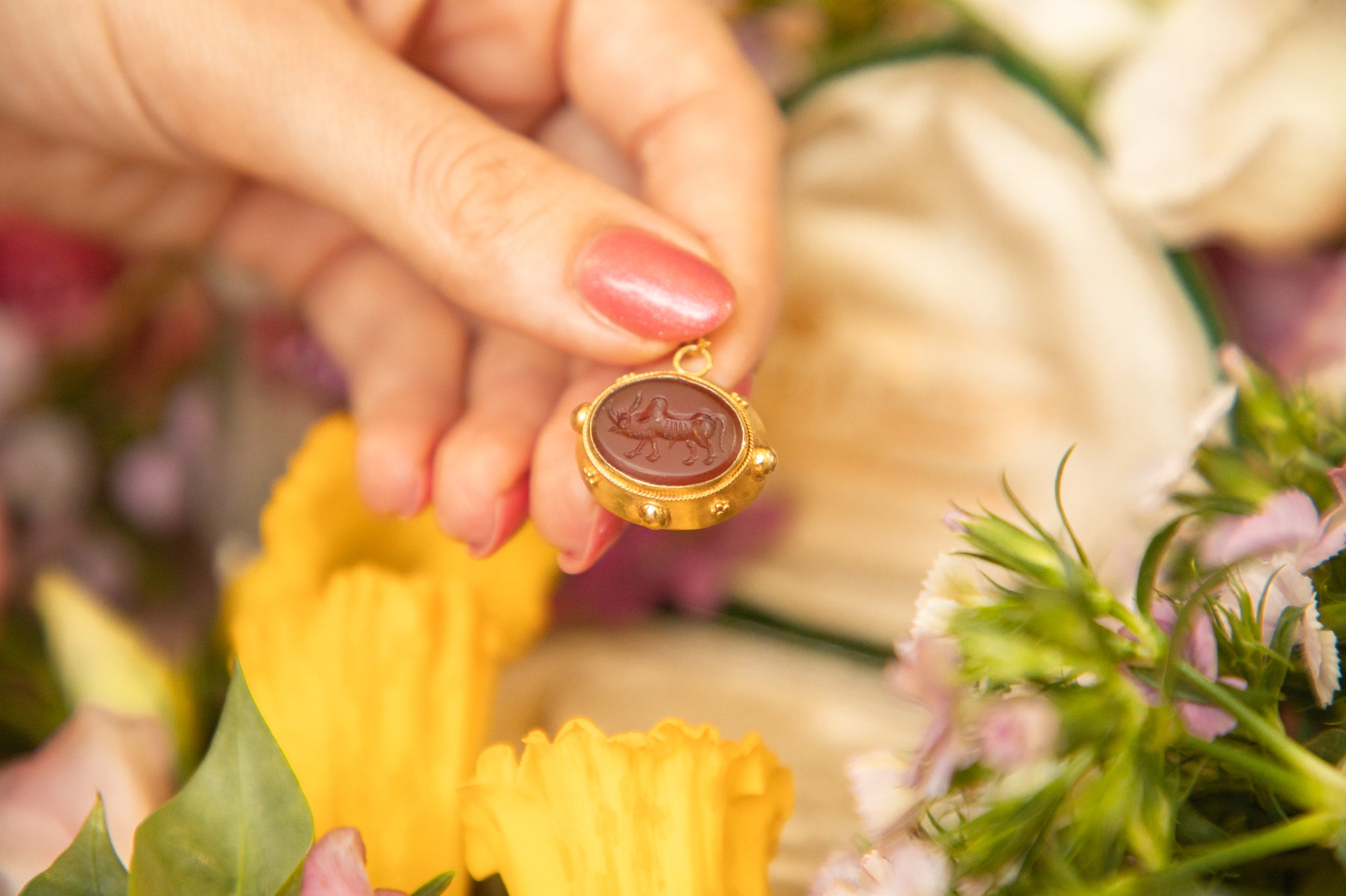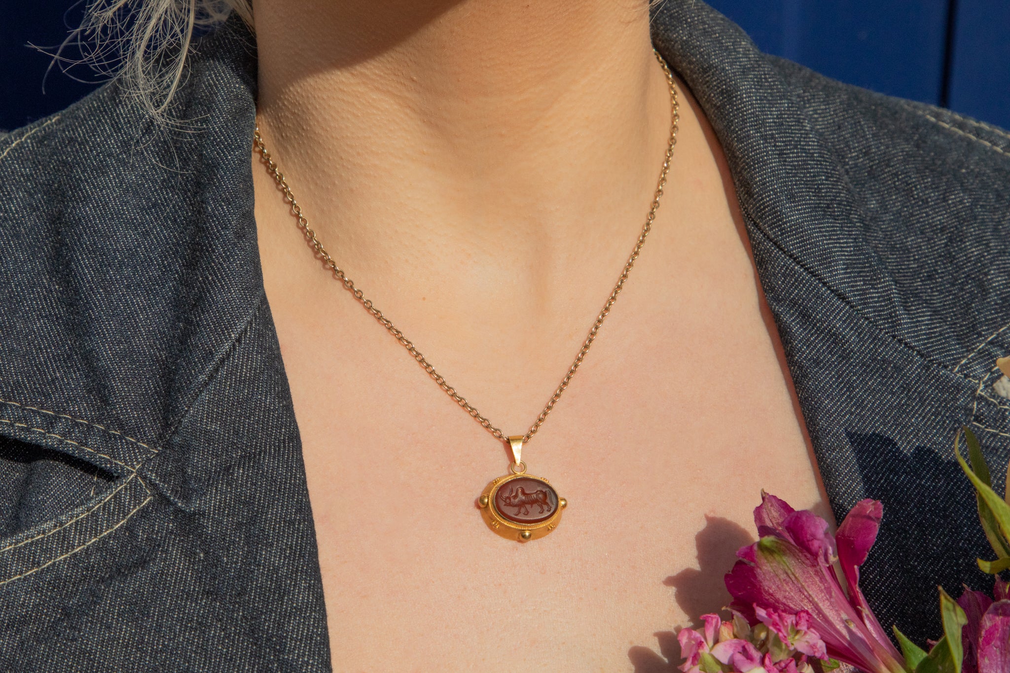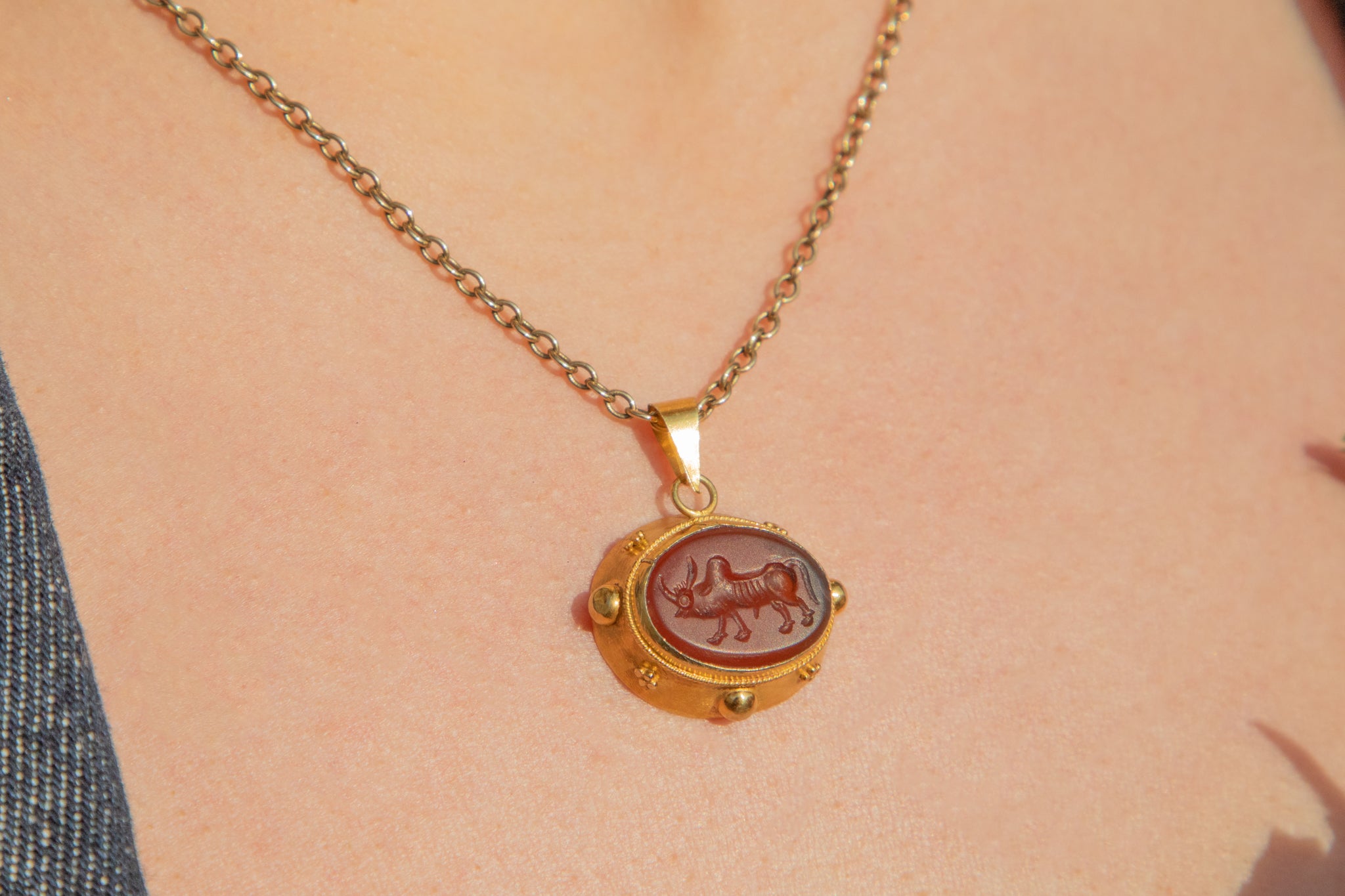This antique 9ct Gold "Taurus" bull Agate intaglio pendant is truly one of a kind! Boasting a chunky profile and sunshine-yellow bloomed 9ct Gold, this pretty pendant will have everyone talking.