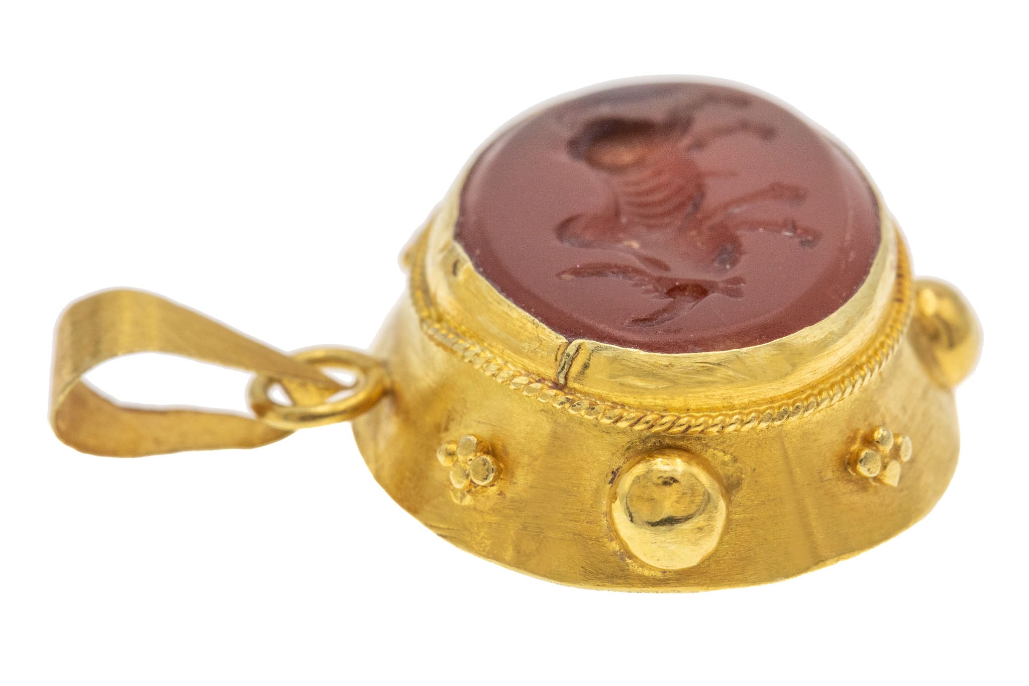 MATERIALS: 9ct Gold (bloomed), Agate / Dark Carnelian (hand-carved intaglio).
