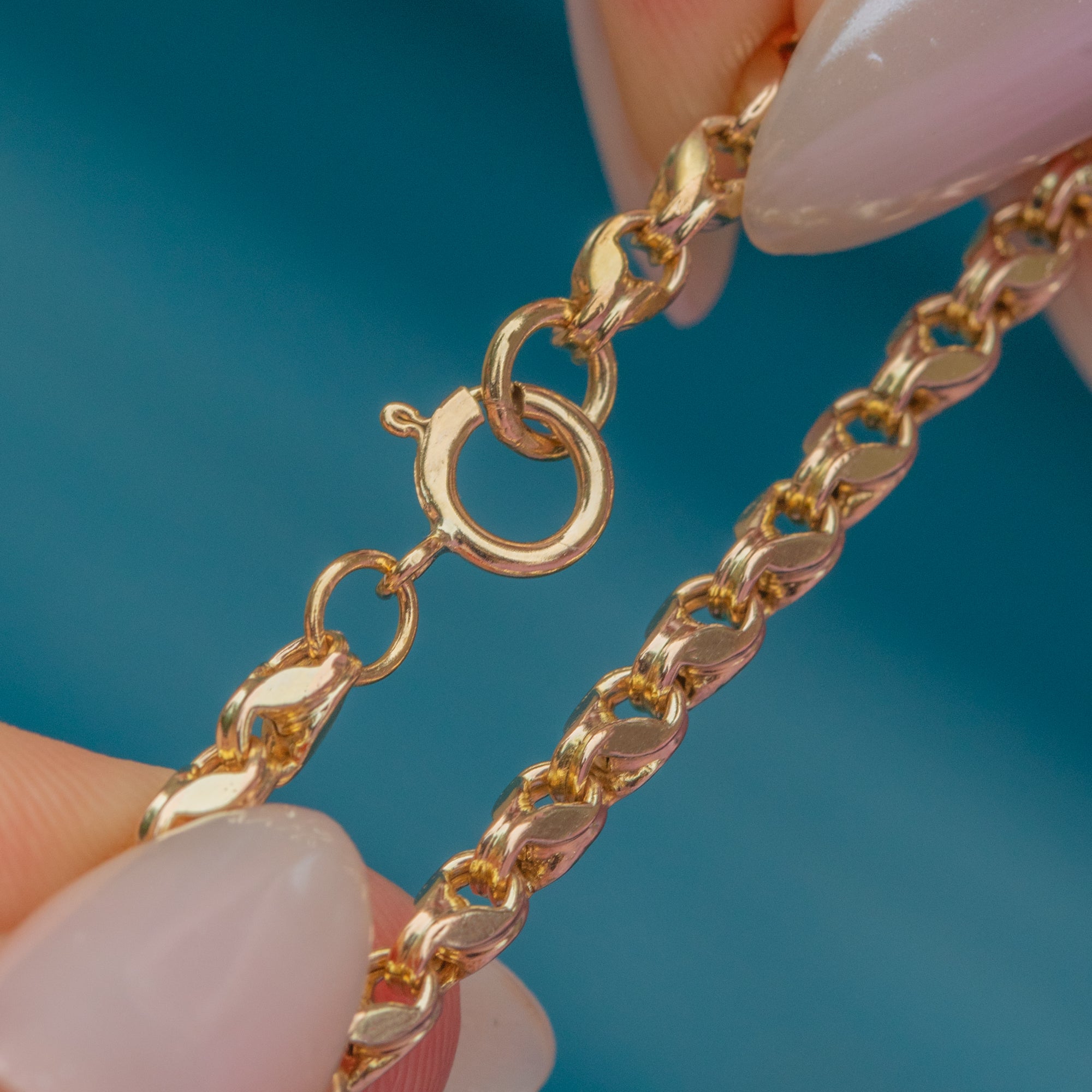 VERY GOOD-EXCELLENT:  Each of the 9ct Gold tulip links are uniform and secure, and the charm is secure attached. The bolt ring requires a firm push to close, however, once it is shut, it remains secure, allowing you to wear this glossy Victorian bracelet with utmost confidence.