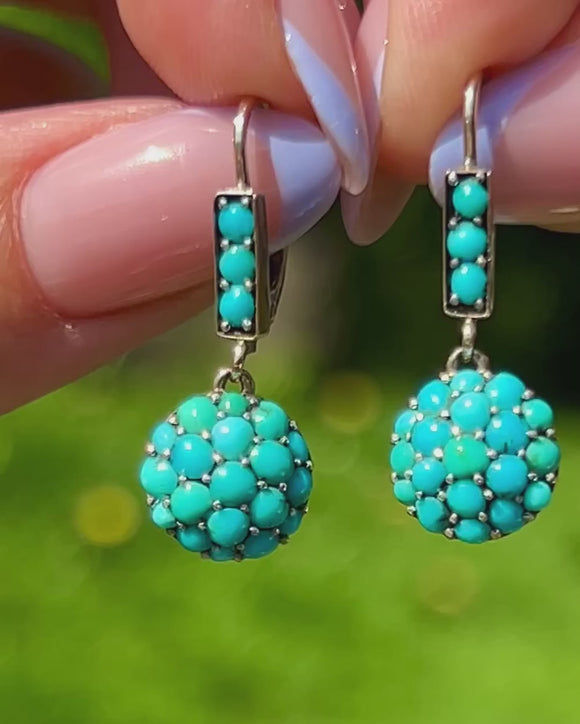 Exuding Victorian splendour, each drop earring is adorned with a myriad of Turquoise stones, each carrying a delightful duck egg blue hue, with subtle variations in tone.