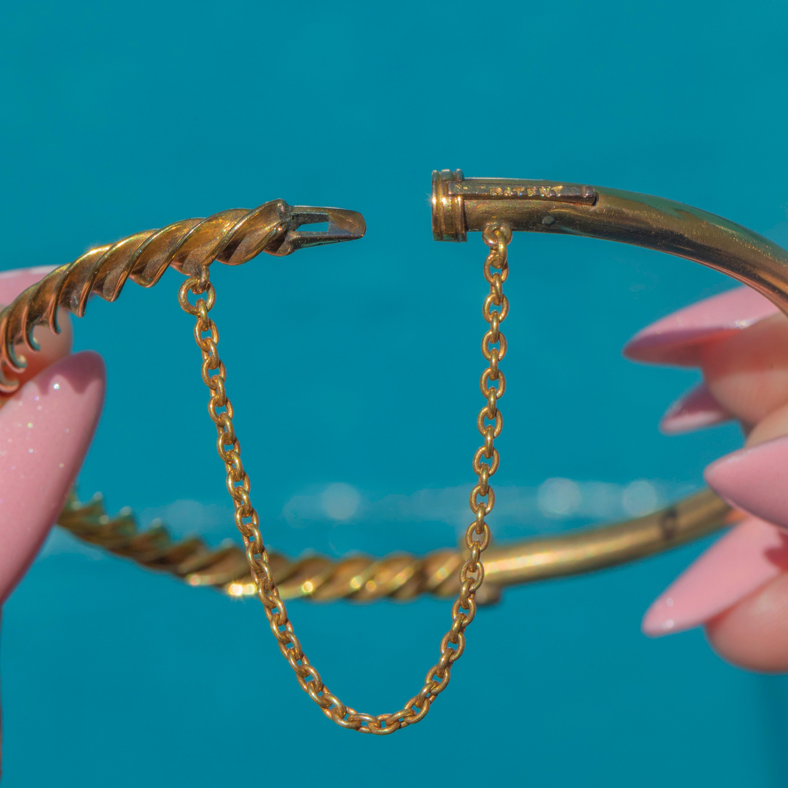 VERY GOOD: This antique 9ct Gold twist bangle is in very good overall condition, with only minor signs of wear consistent with age and use. The Gold retains a lovely warm tone, though there is some surface wear and light discolouration on the bangle band and heart charm. The clasp functions securely, closing with a satisfying click, and the original safety chain is intact, offering additional peace of mind during wear. This is a charming and wearable antique piece, full of romantic character!