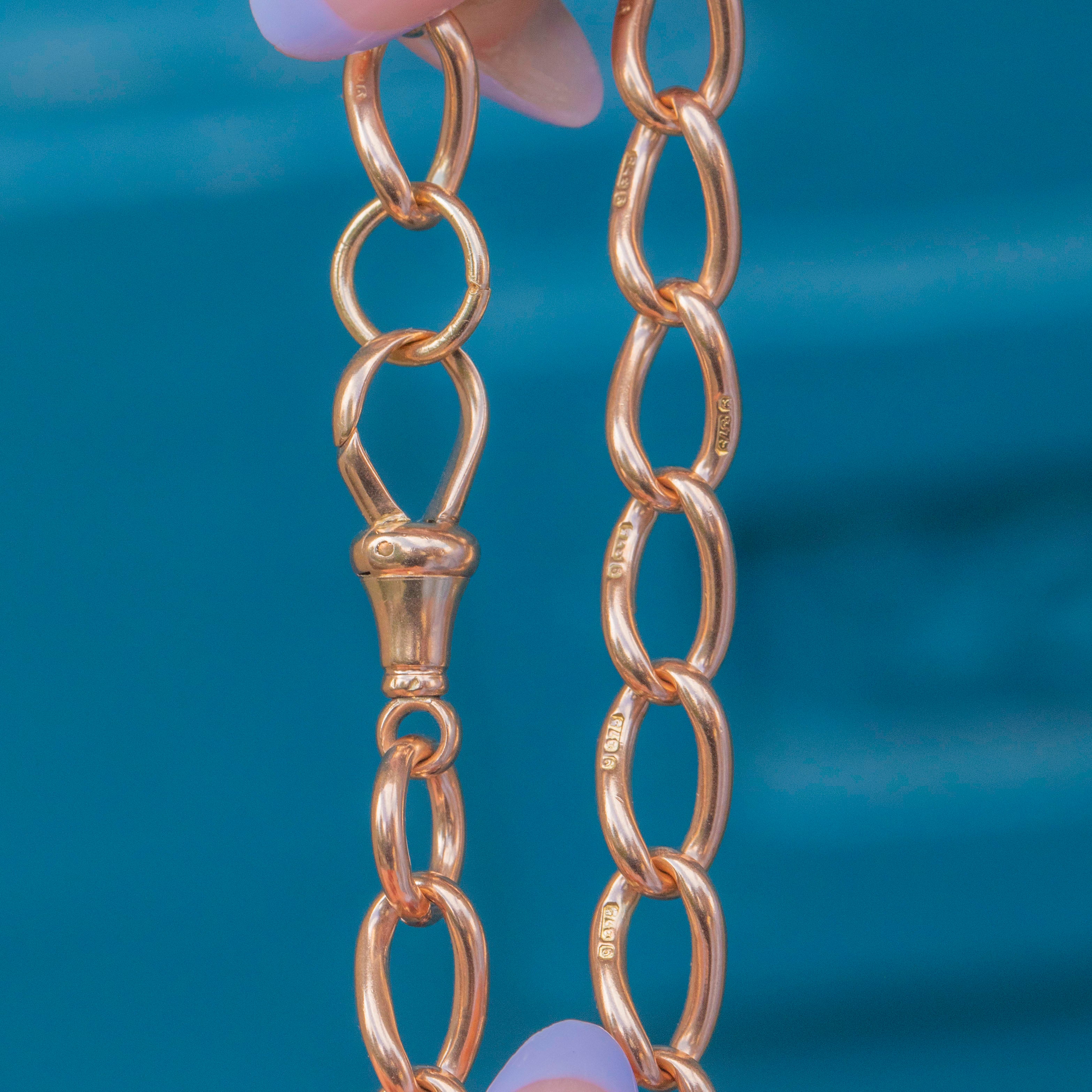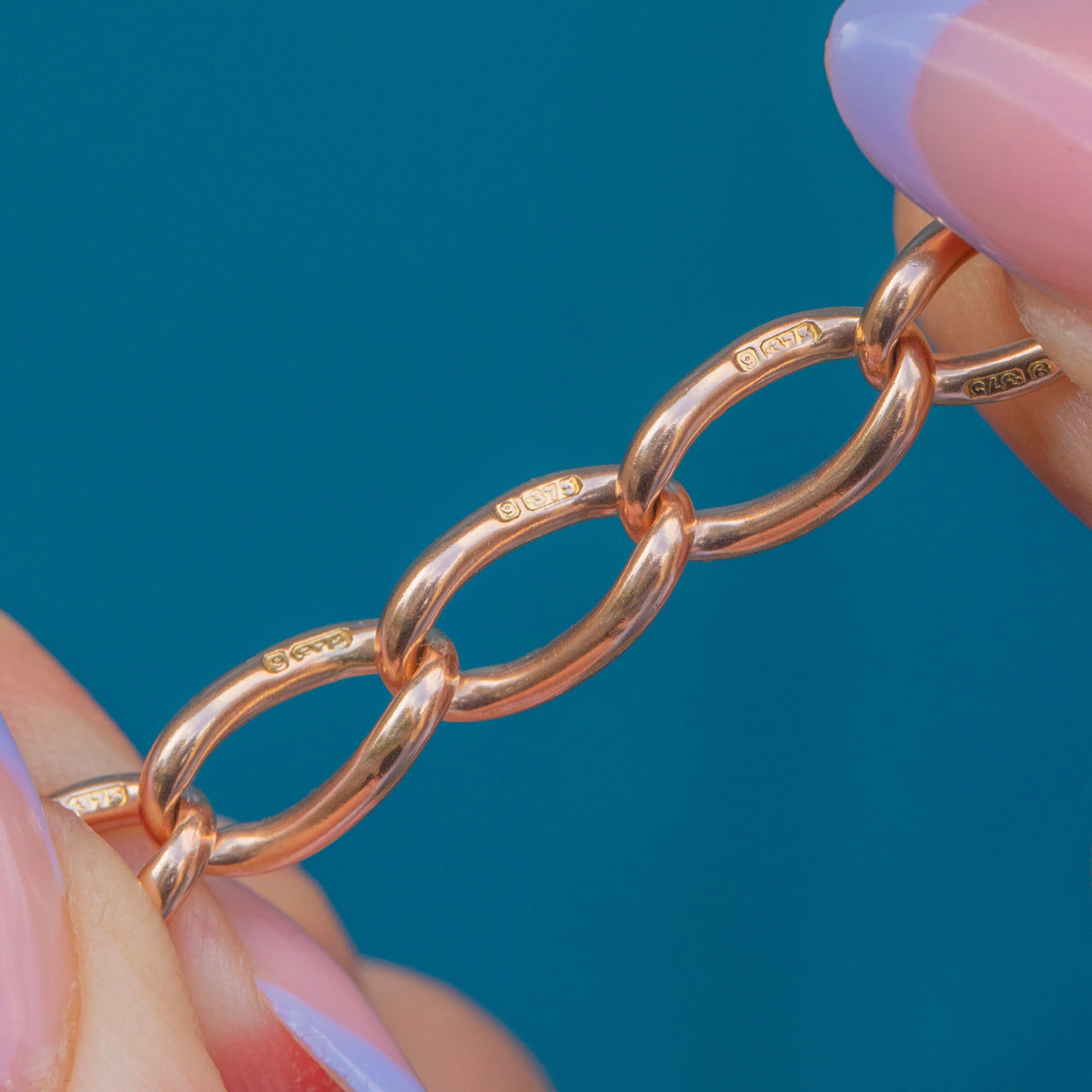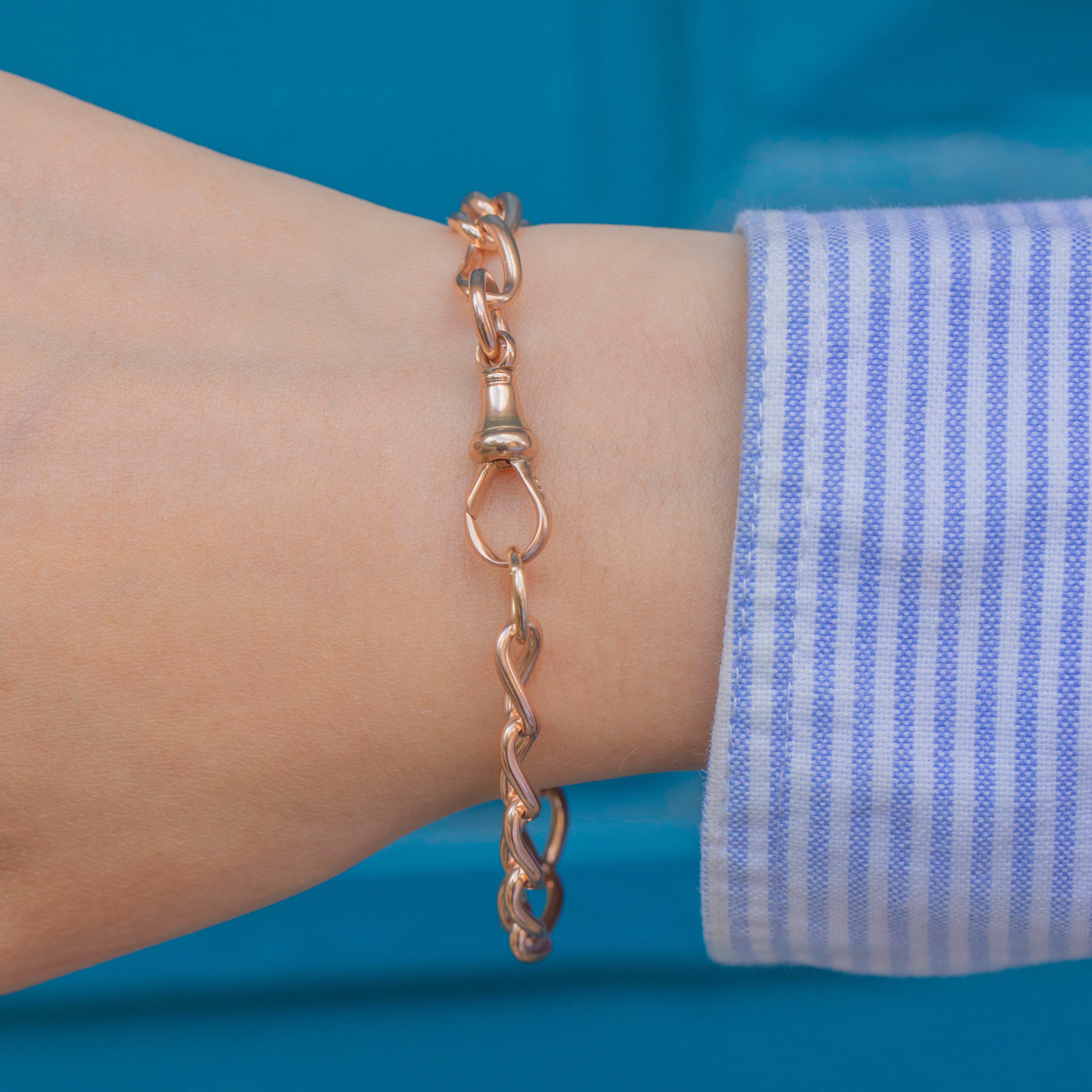 EXCELLENT: This antique 9ct Rose Gold bracelet is in wonderful condition. Each of her links are uniform and secure, and her dog-clip is in perfect working order. With little else to note, she's a must-have!