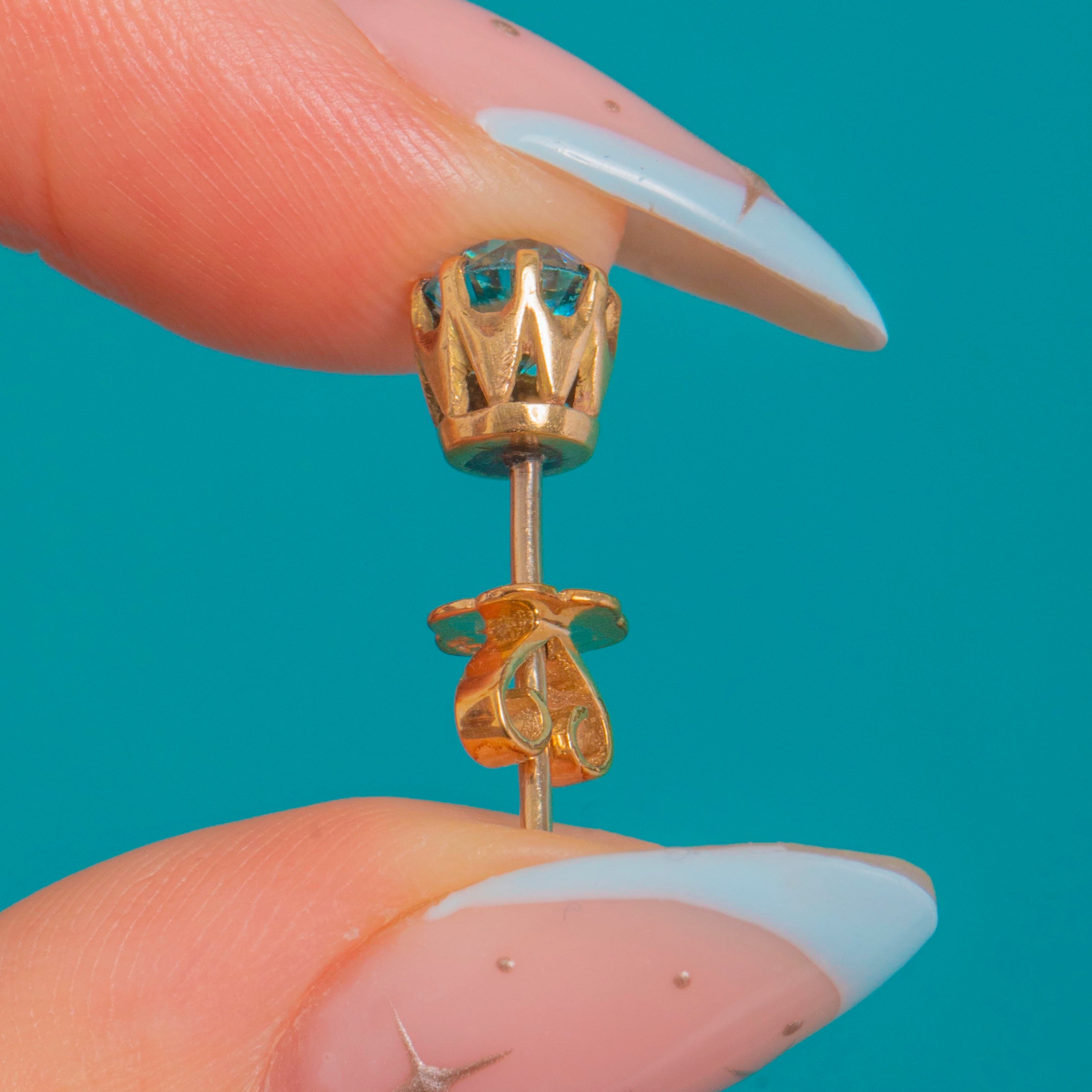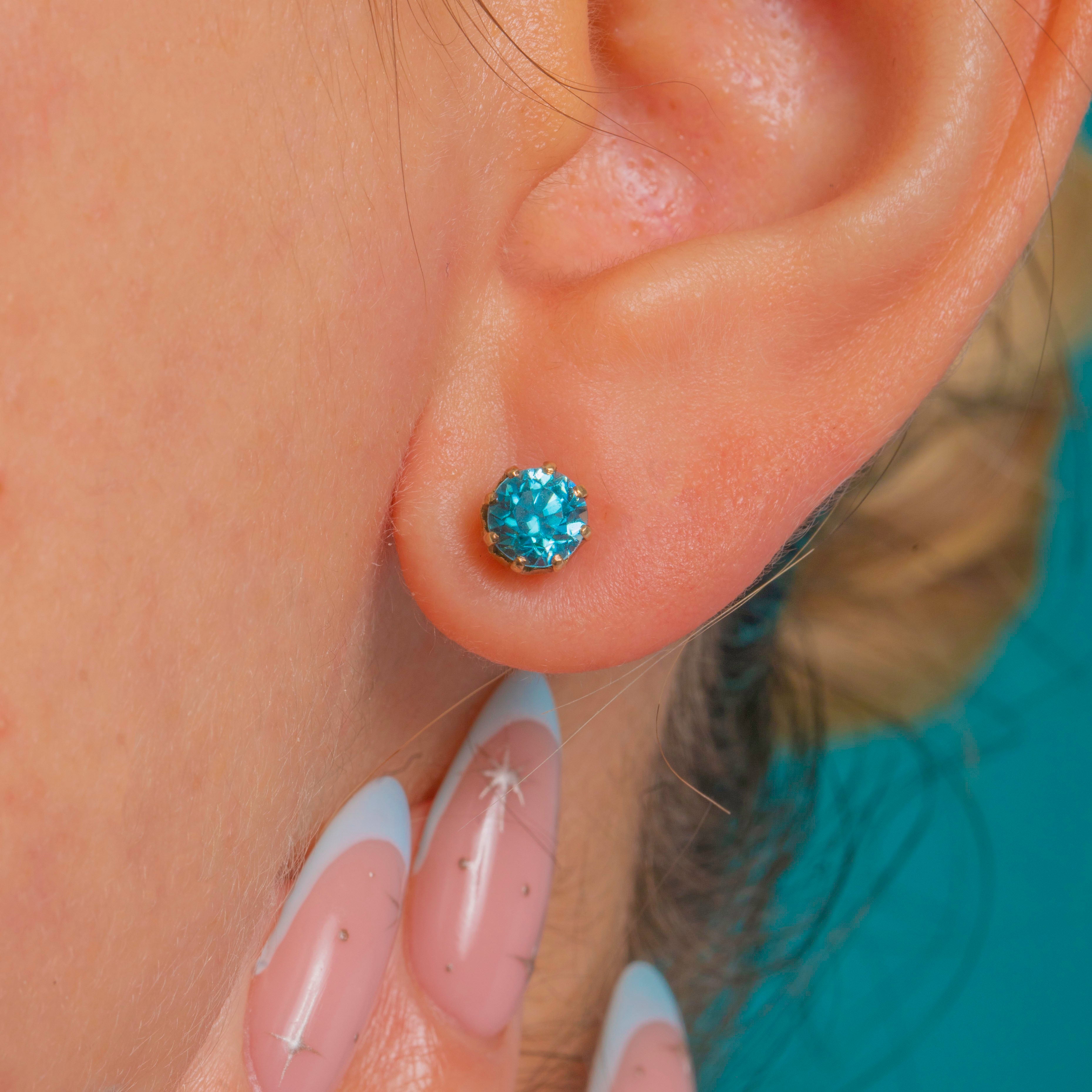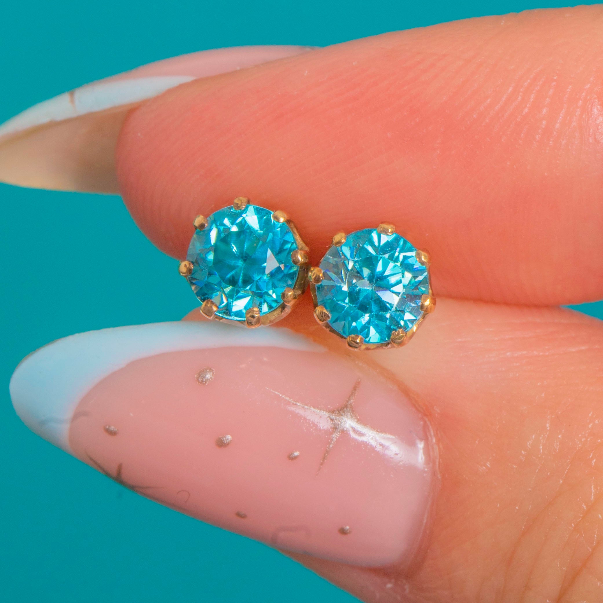 Petite and beautifully bright, these Art Deco stud earrings showcase vivid teal-blue natural Blue Zircons in classic multi-claw crown settings of 9ct Gold. The open galleries and neat, low profiles bring plenty of sparkle while keeping the look refined and timeless.