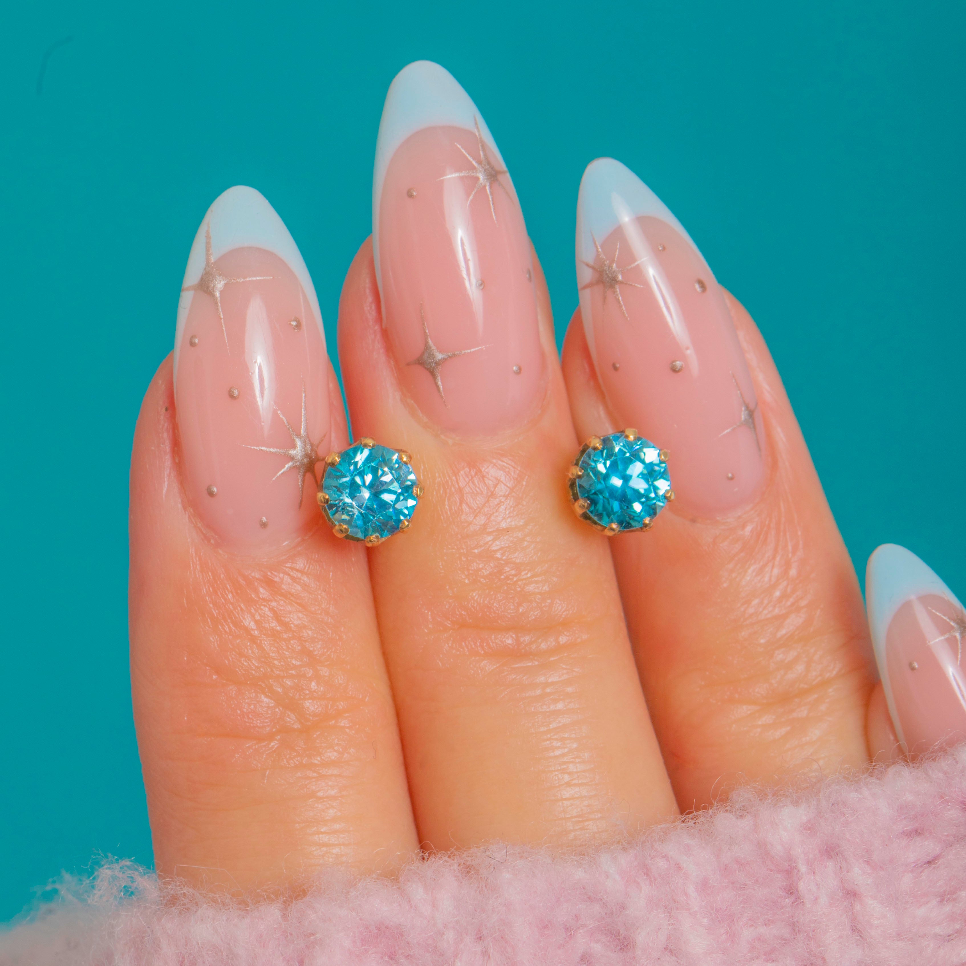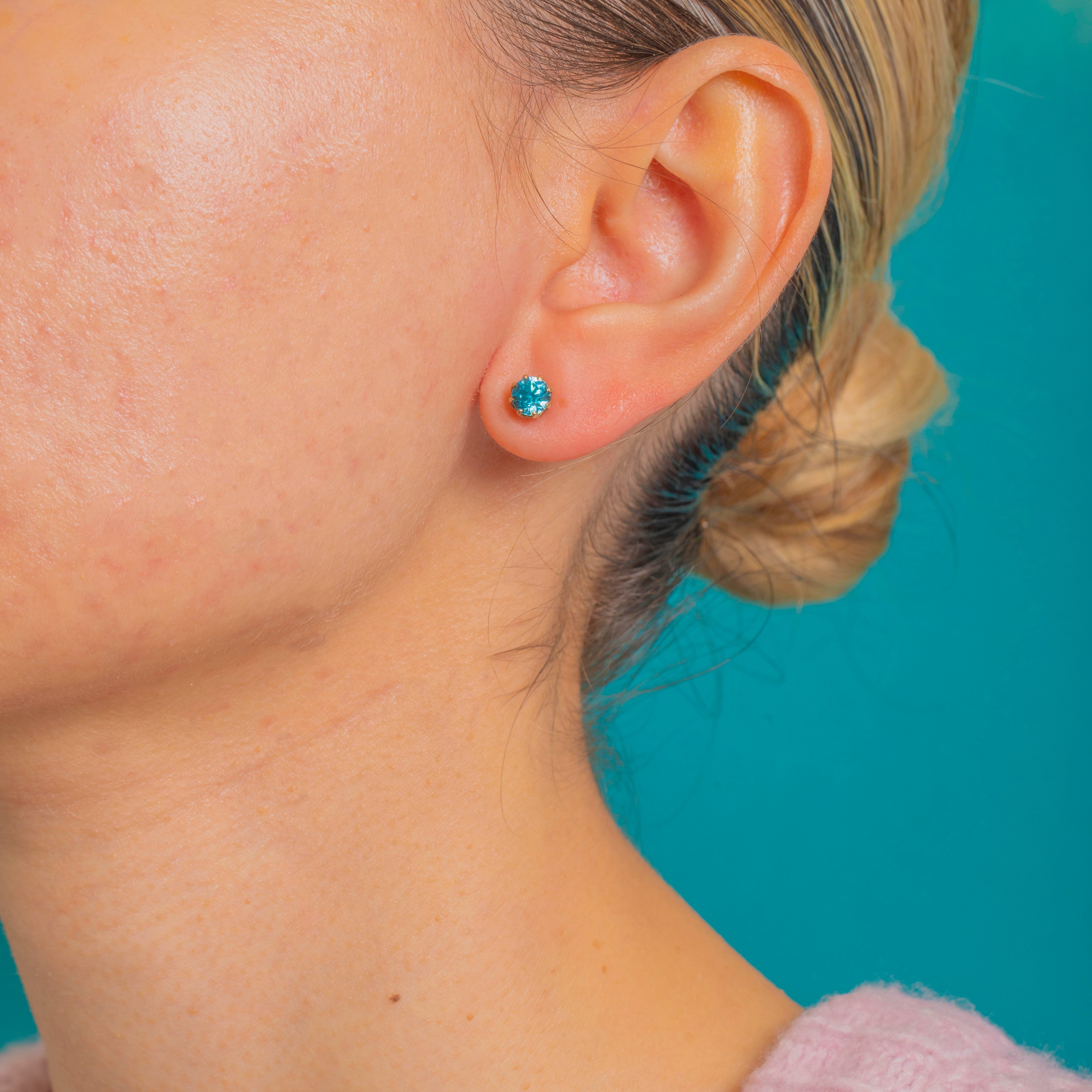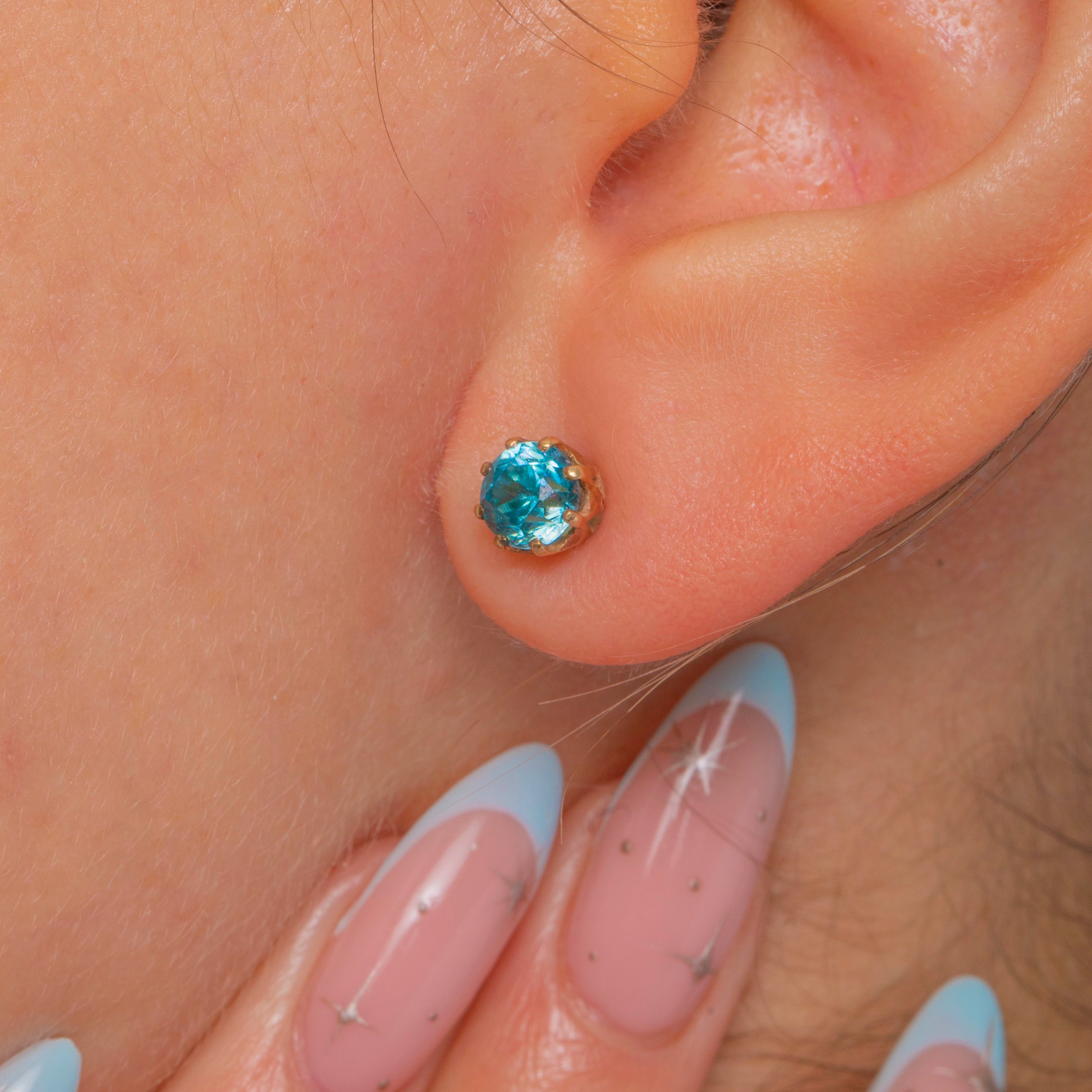 Petite and beautifully bright, these Art Deco stud earrings showcase vivid teal-blue natural Blue Zircons in classic multi-claw crown settings of 9ct Gold. The open galleries and neat, low profiles bring plenty of sparkle while keeping the look refined and timeless.