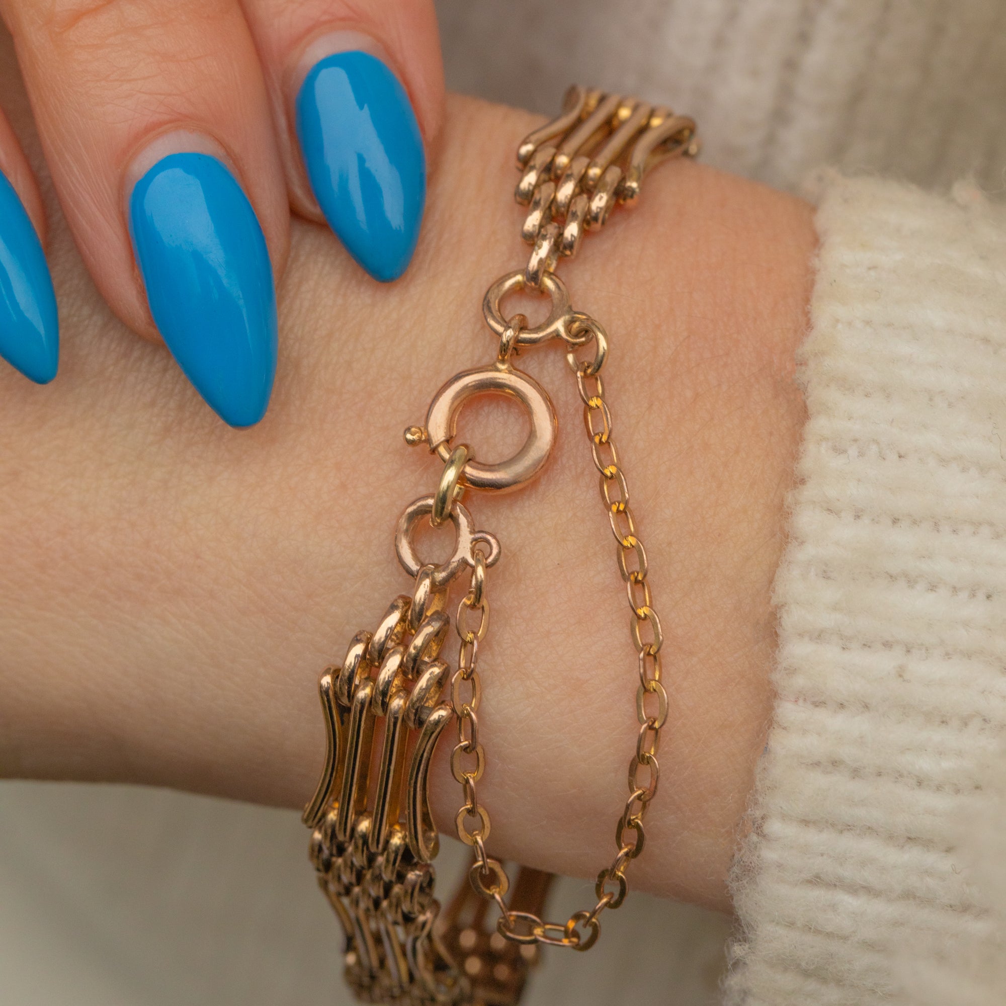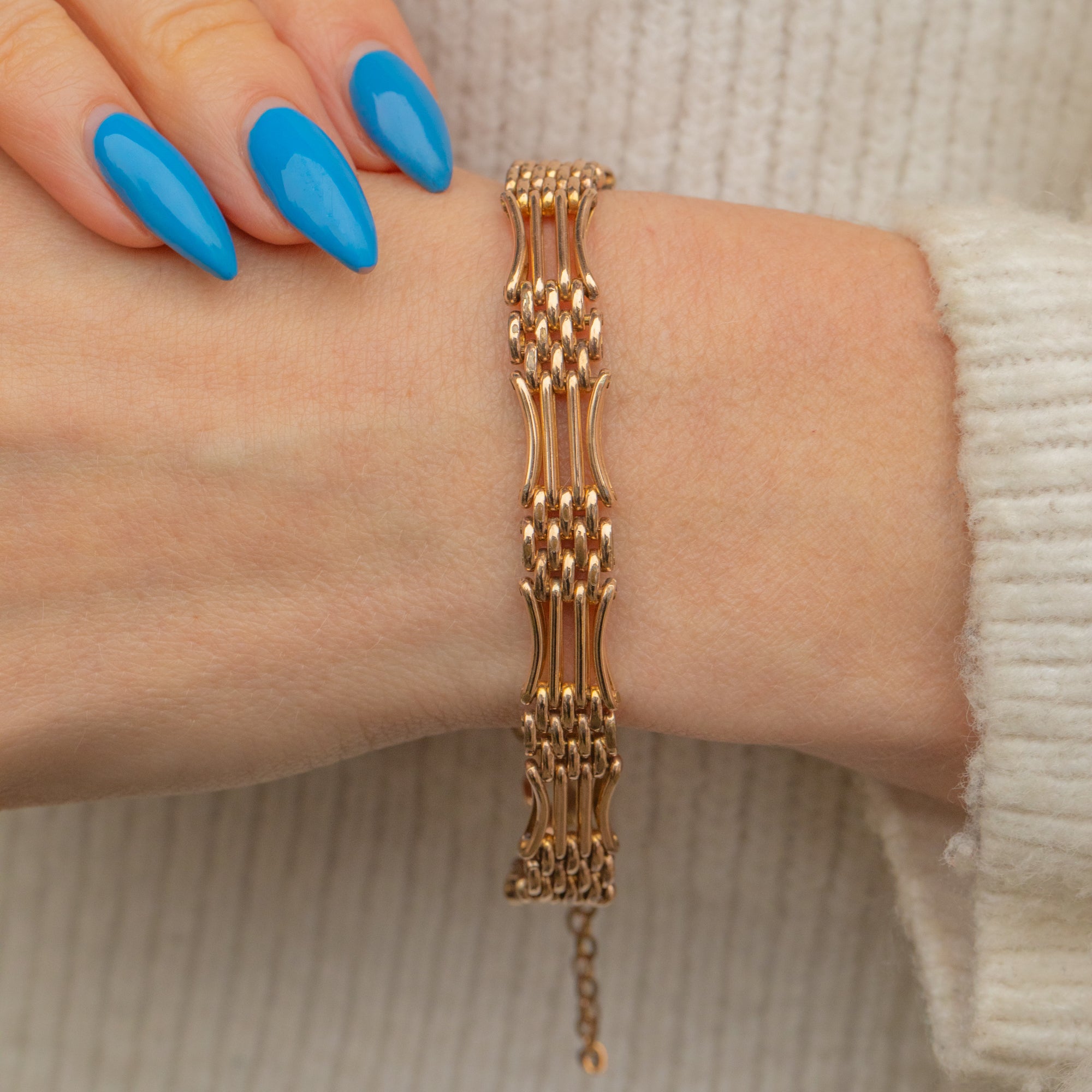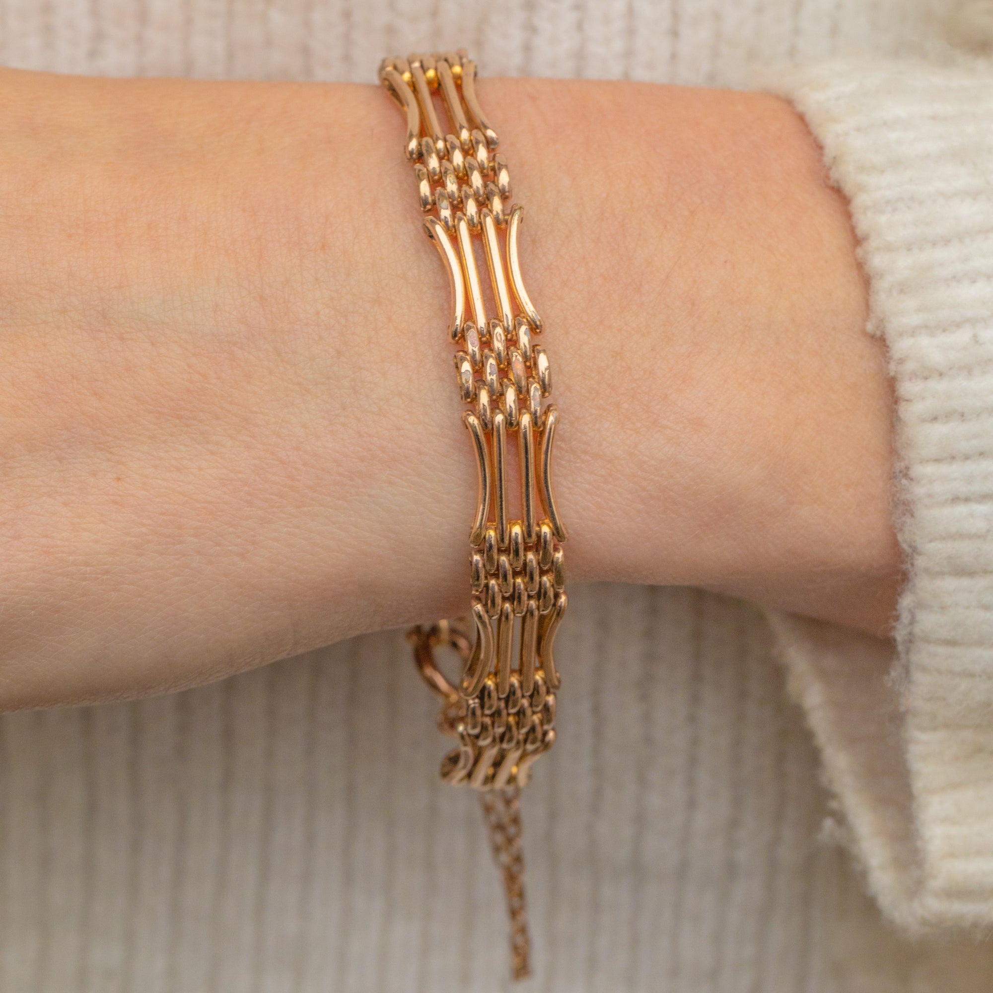 VERY GOOD. This antique 9ct Gold gate bracelet is in very good condition. The bracelet has a stunning Golden hue which has lasted immaculately throughout the years. The links are each securely connected, with only some minor signs of wear commensurate with age. The piece closes with great security, with the added benefit of the safety chain so you can wear this piece with absolute reassurance.