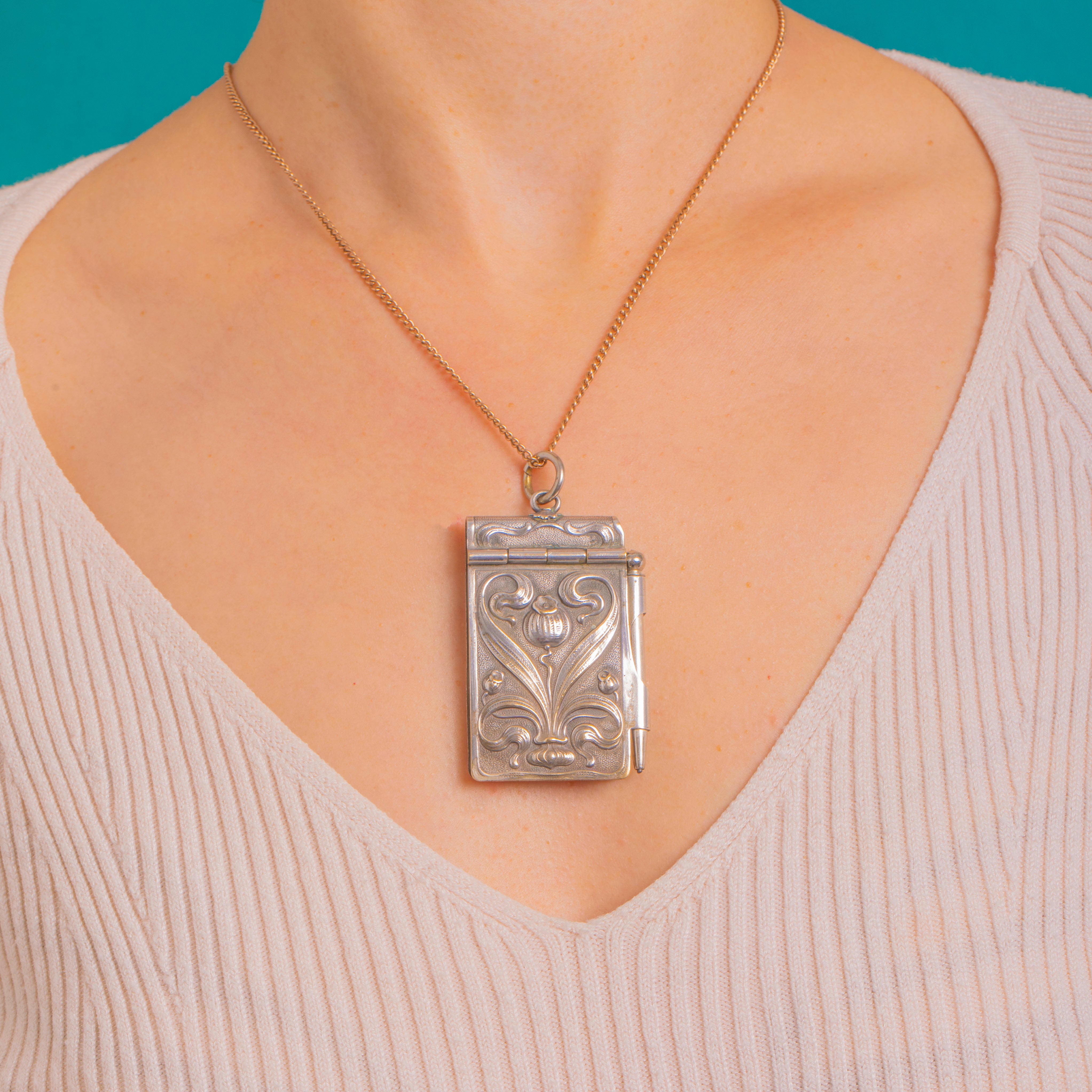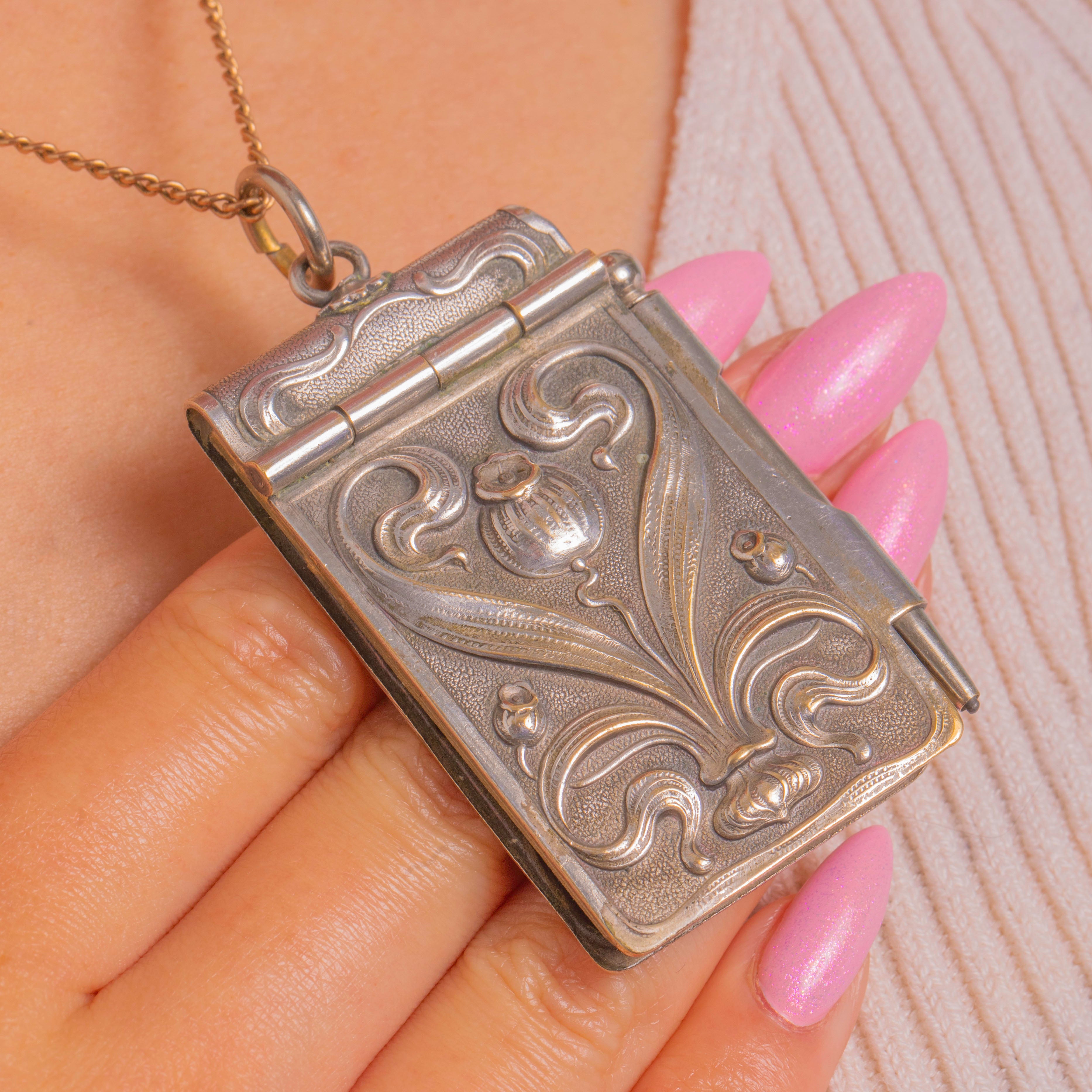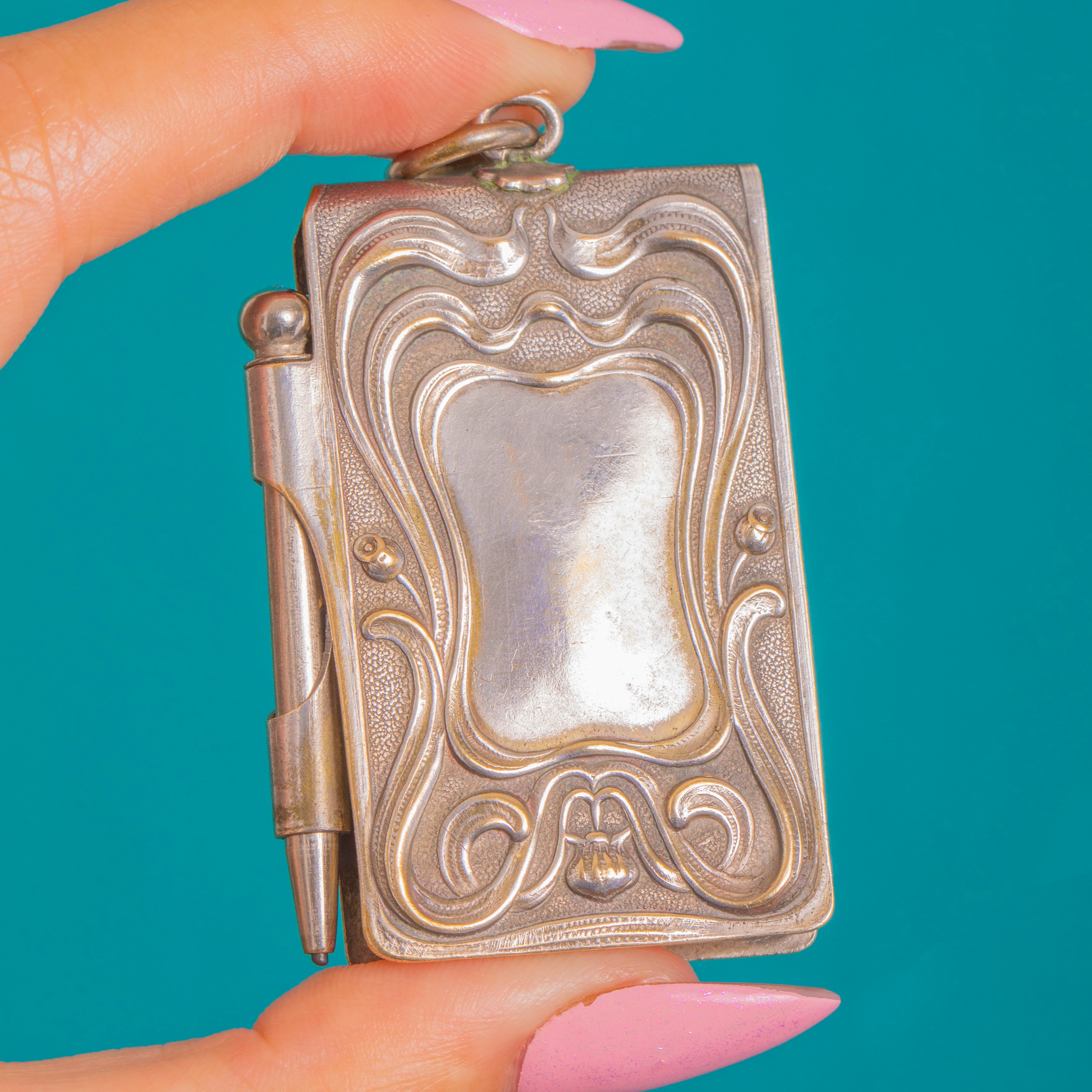 Antiker Art Nouveau französischer Aide-Mémoire-Buch-und-Bleistift-Anhänger