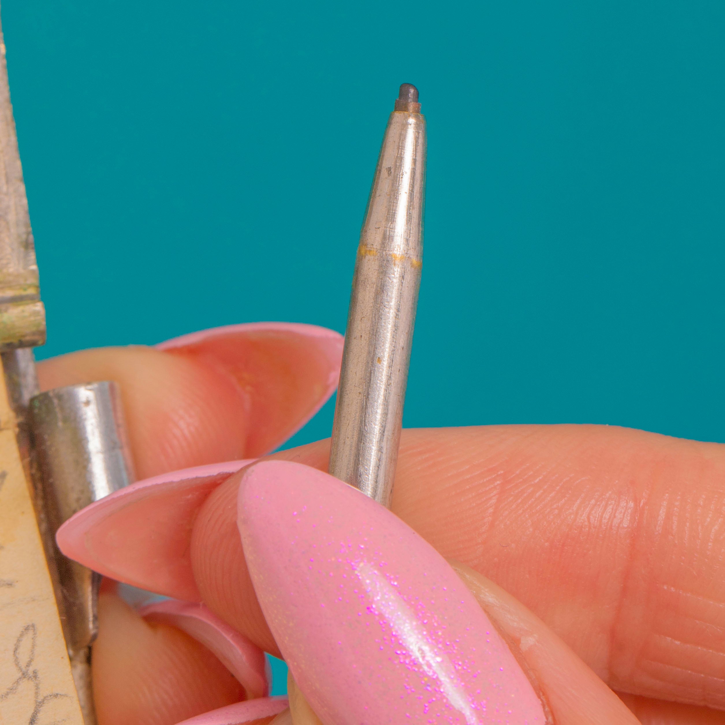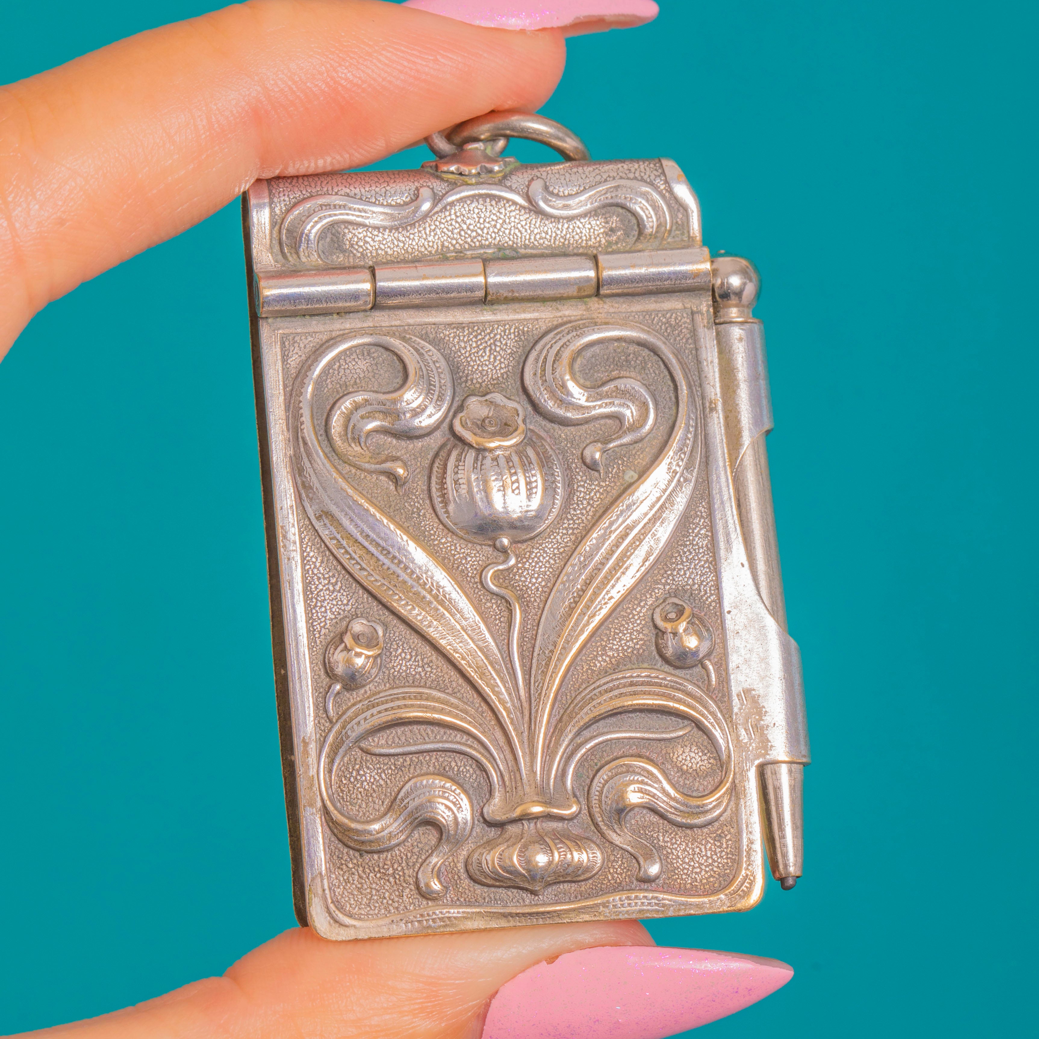 Der schlanke, herausnehmbare Bleistift liegt in einer eigenen Röhrenhülse mit einem eleganten Schiebestift zur Sicherung, während das Scharnier-Etui sich öffnet und kleine Notizbuchseiten mit warmem, goldfarbenem Innenleben an den Rändern sichtbar werden lässt. Sowohl dekorativ als auch wunderbar praktisch – ein tragbares Erinnerungsstück, das die Romantik und Kunstfertigkeit der Epoche einfängt.