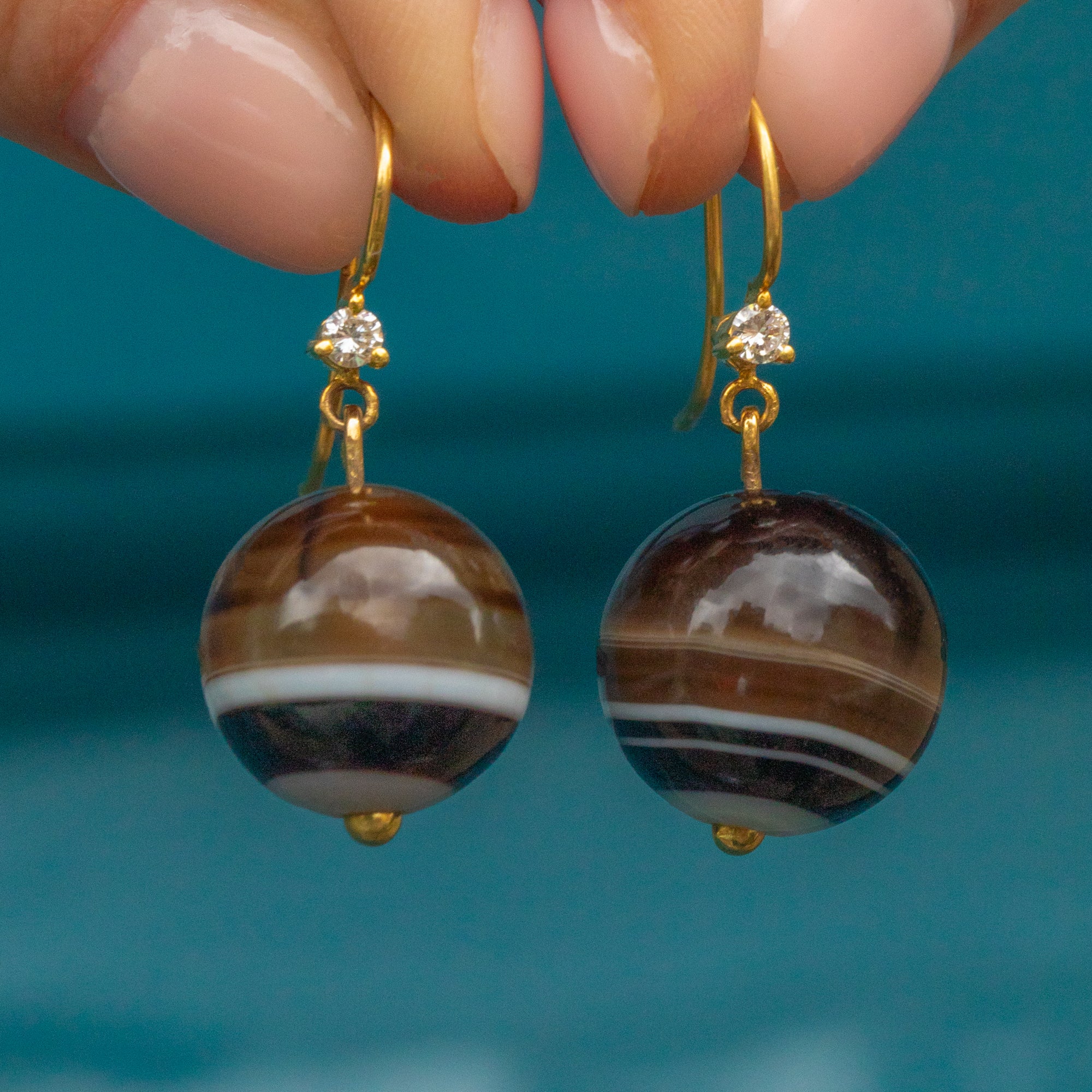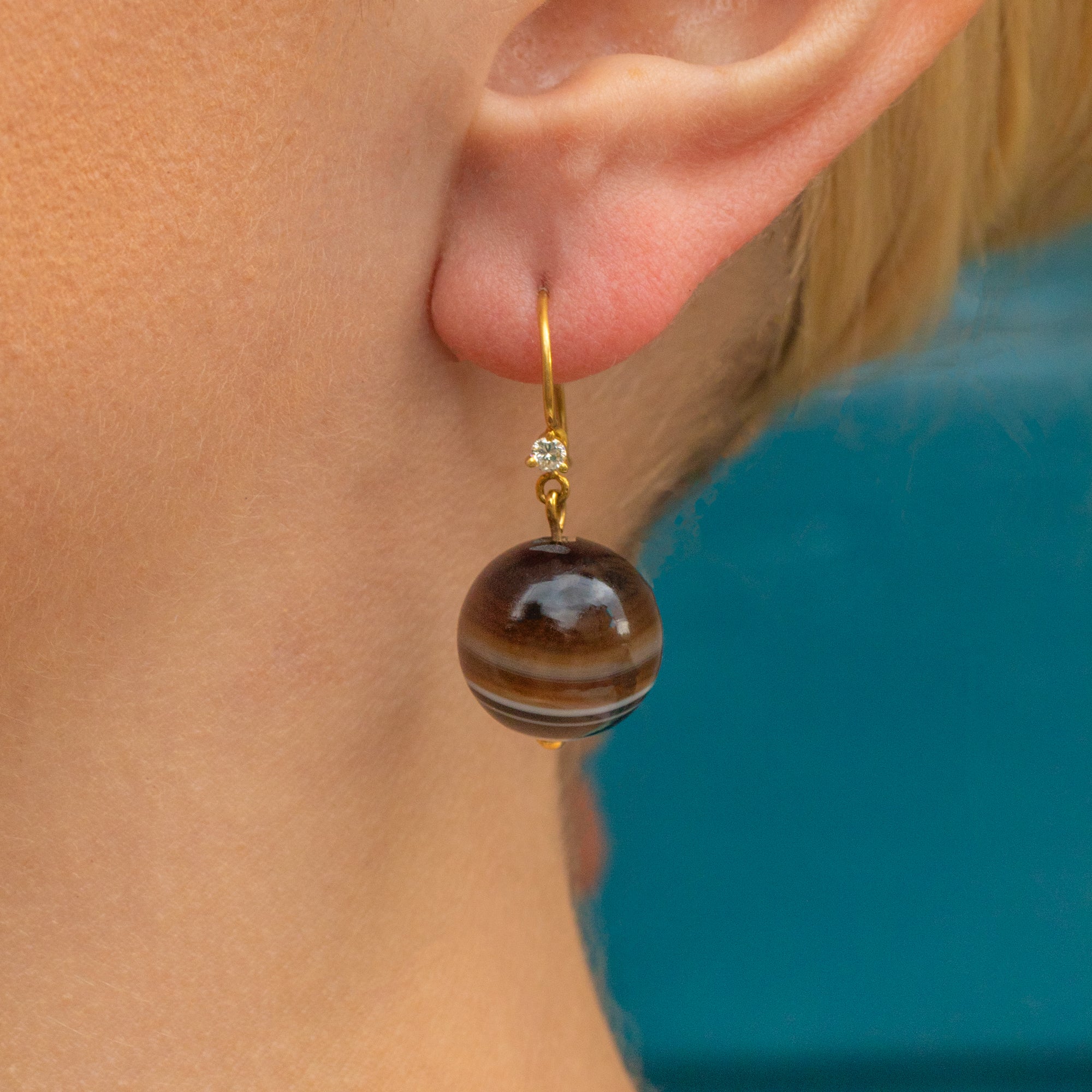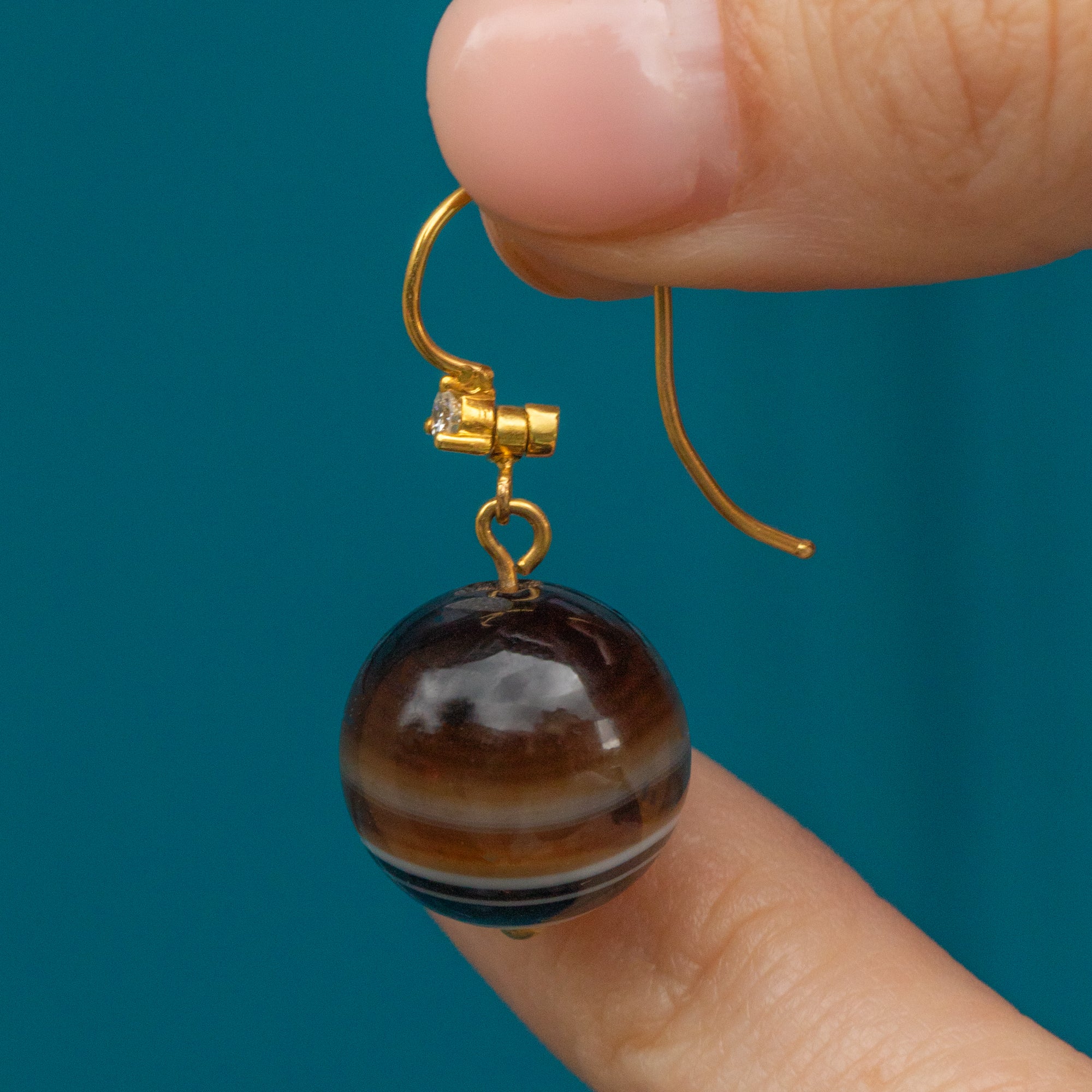 Wie himmlisch sind diese antiken Ohrringe mit gebändertem Achat und Diamanten?! An 9ct Goldhaken hängend, zeigen die gebänderten Achatkugeln köstliche Mokka-Töne, die über ihre glatte Oberfläche fließen, besetzt mit einem funkelnden Diamant-Akzent oben.