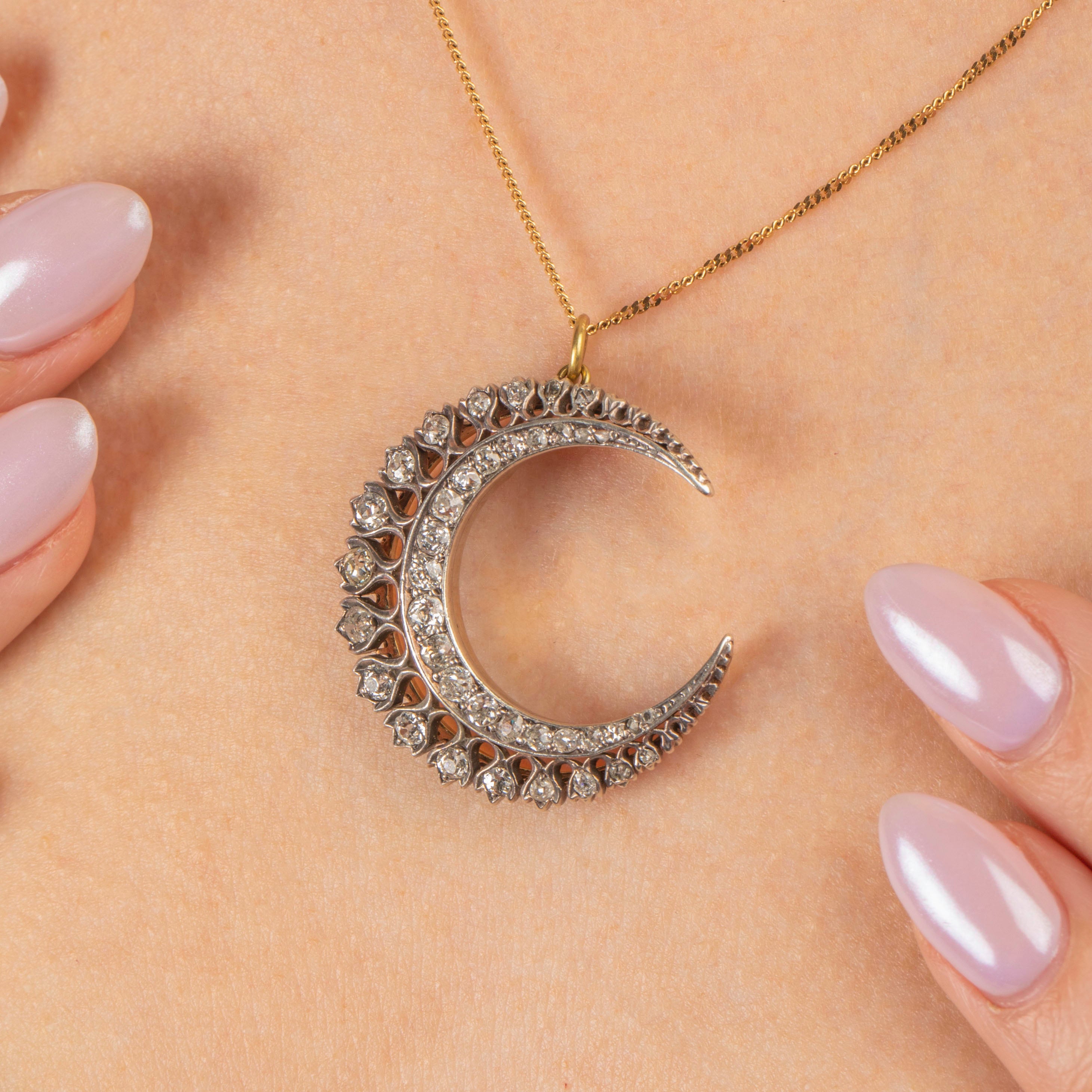 EXCELLENT. This antique Diamond crescent moon pendant is in immaculate condition. Each shimmering Diamond is bright and free from any chips or nibbles, securely set in their Silver settings. The Silver is bright and perfectly juxtaposed with the saturated rich 15ct Gold, adding to her antique charm.