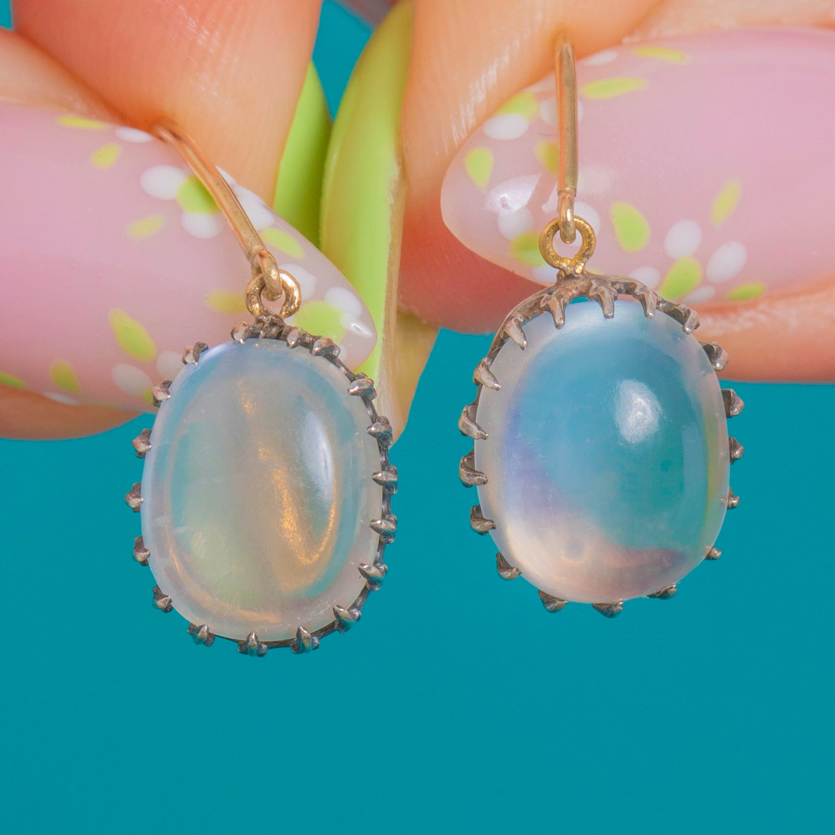 In ein ätherisches Licht getaucht, sind diese Edwardian Moonstone Ohrhänger von unwiderstehlicher Romantik. Jeder hochgewölbte ovale Moonstone schimmert mit zarten blauen und pfirsichfarbenen Reflexen, eingefasst in eine hübsche, gezackte Silber-Zarge, die einen kronenartigen Abschluss verleiht. Die Anhänger schwingen an eleganten Haken aus 9ct Gold, wobei die zweifarbige Komposition die leuchtende Adulareszenz der Moonstones besonders hervorhebt.