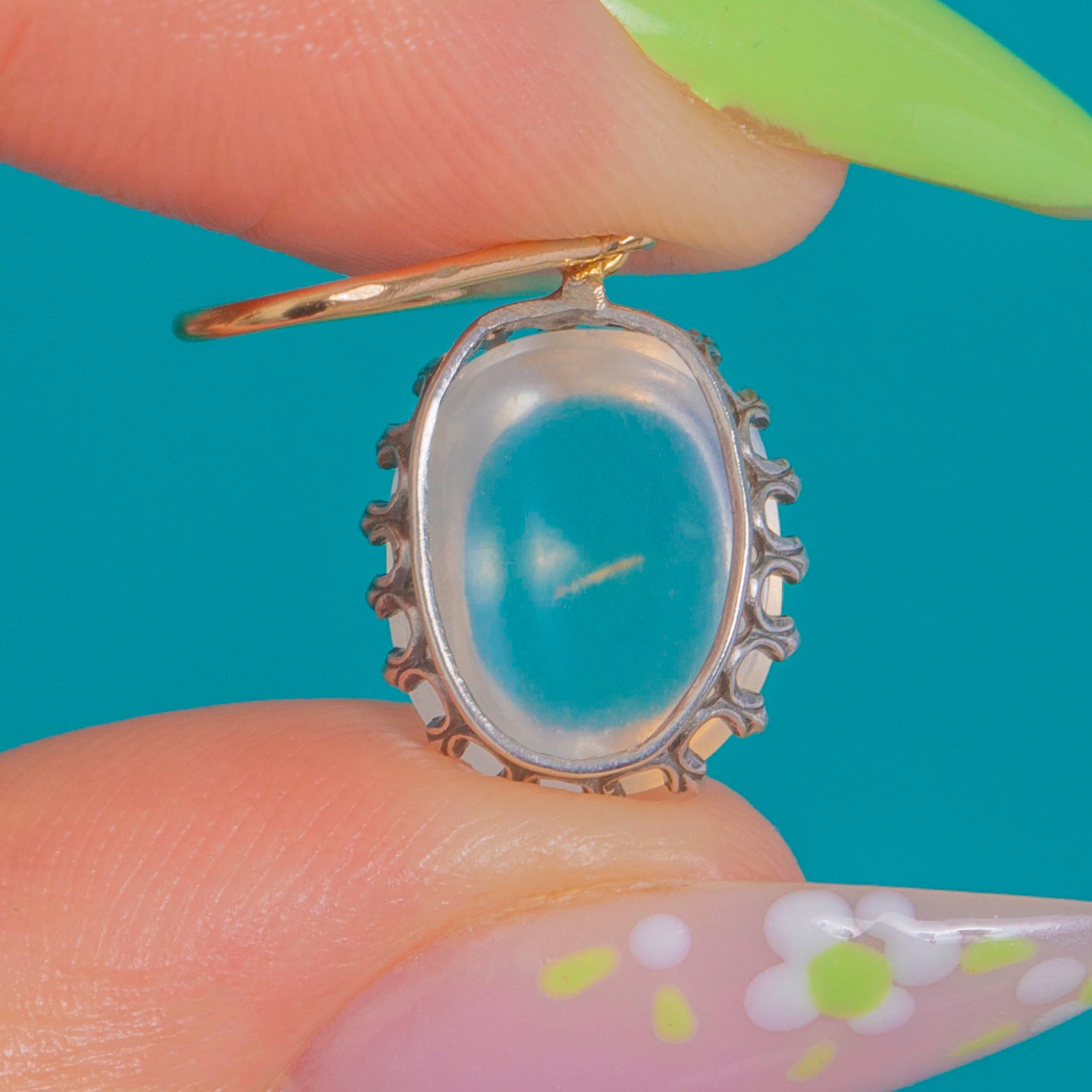SEHR GUT: Die Moonstones sind leuchtend mit leichten Gebrauchsspuren an der Oberfläche und einer sichtbaren Einschlussbildung in einem Stein, wie angegeben. Die Silberfassungen und Haken aus 9ct Gold zeigen eine altersgemäße, dezente Patina und leichte Tragespuren, die Steine sitzen sicher in ihren Fassungen. Natürliche Größenunterschiede der Steine sind vorhanden und unterstreichen ihren Charakter.