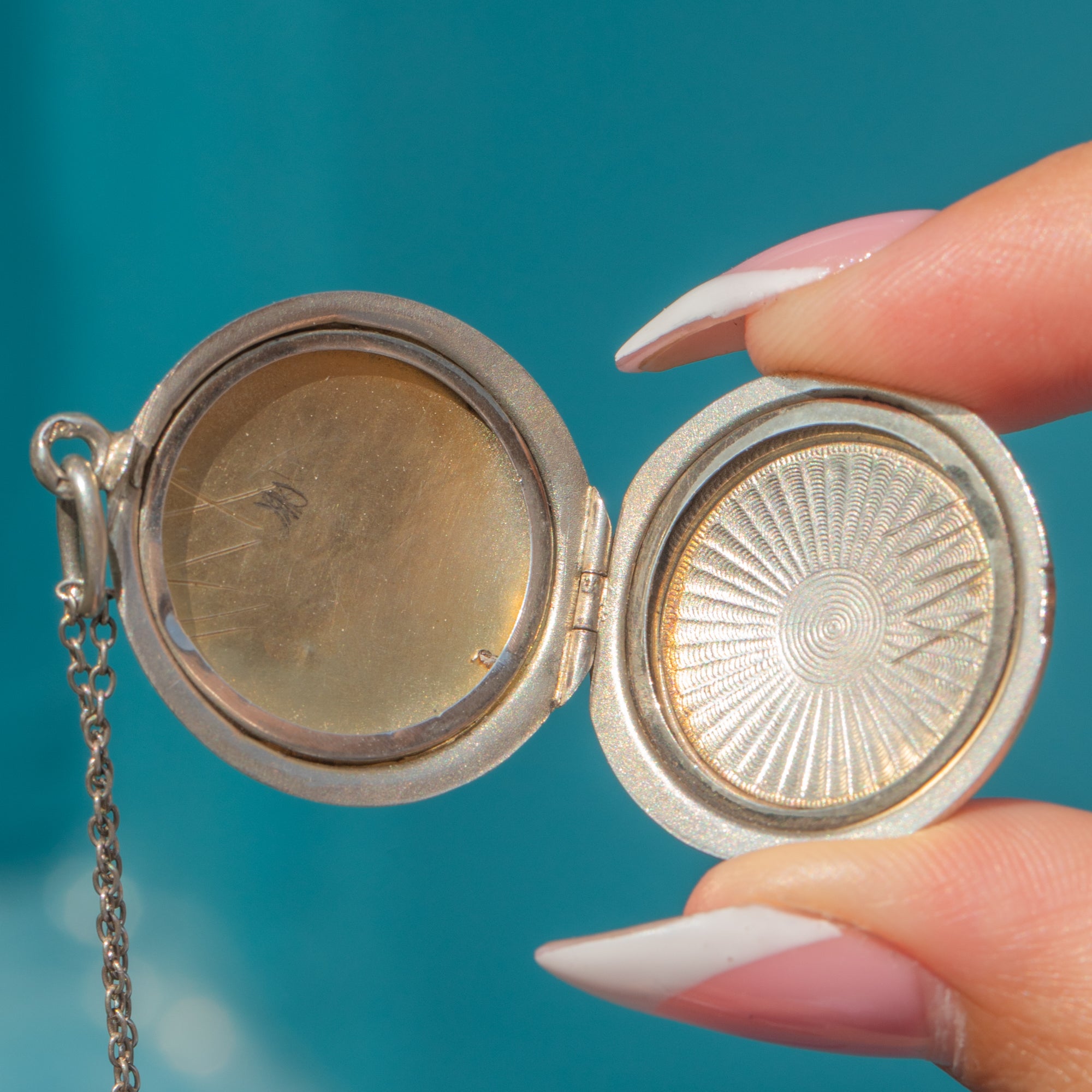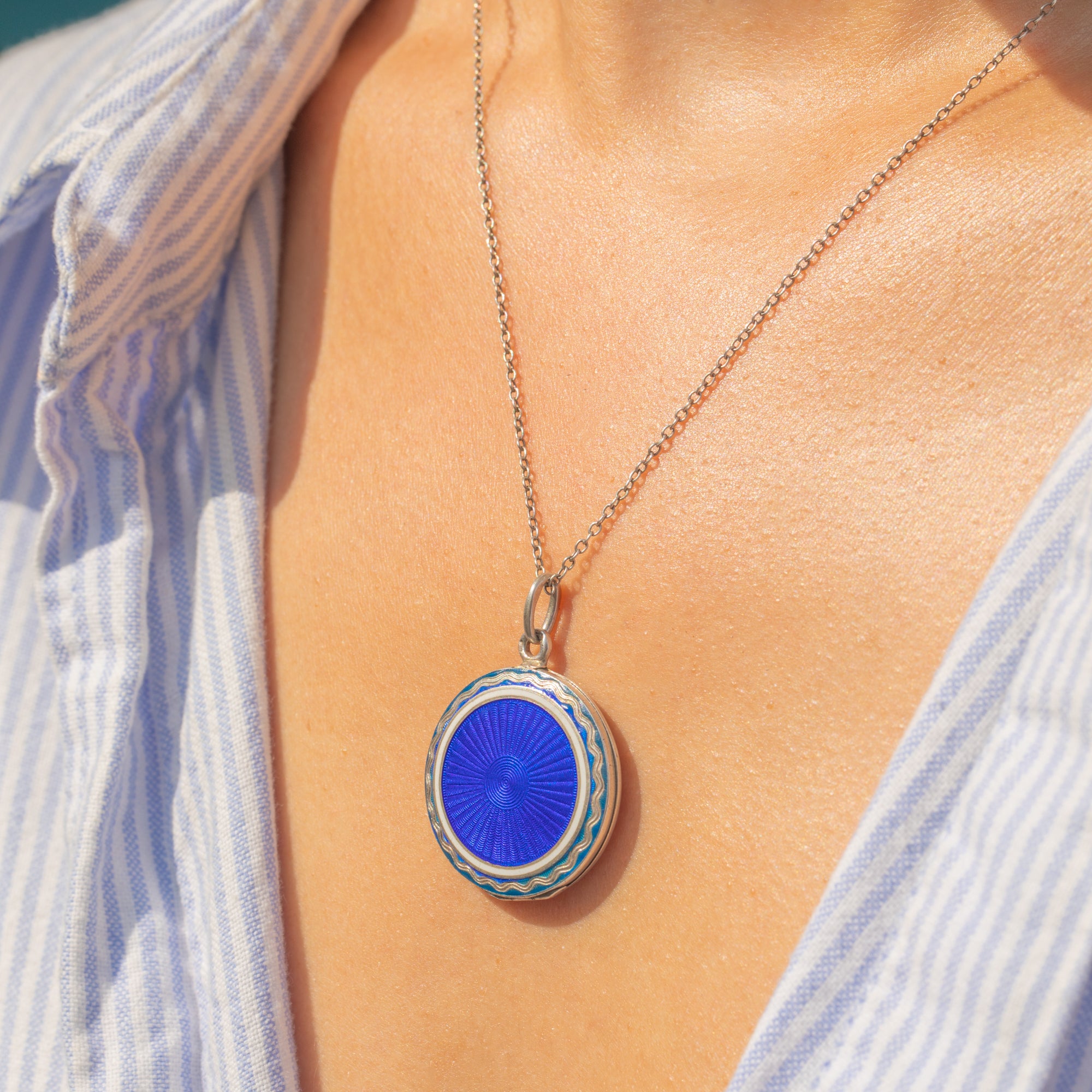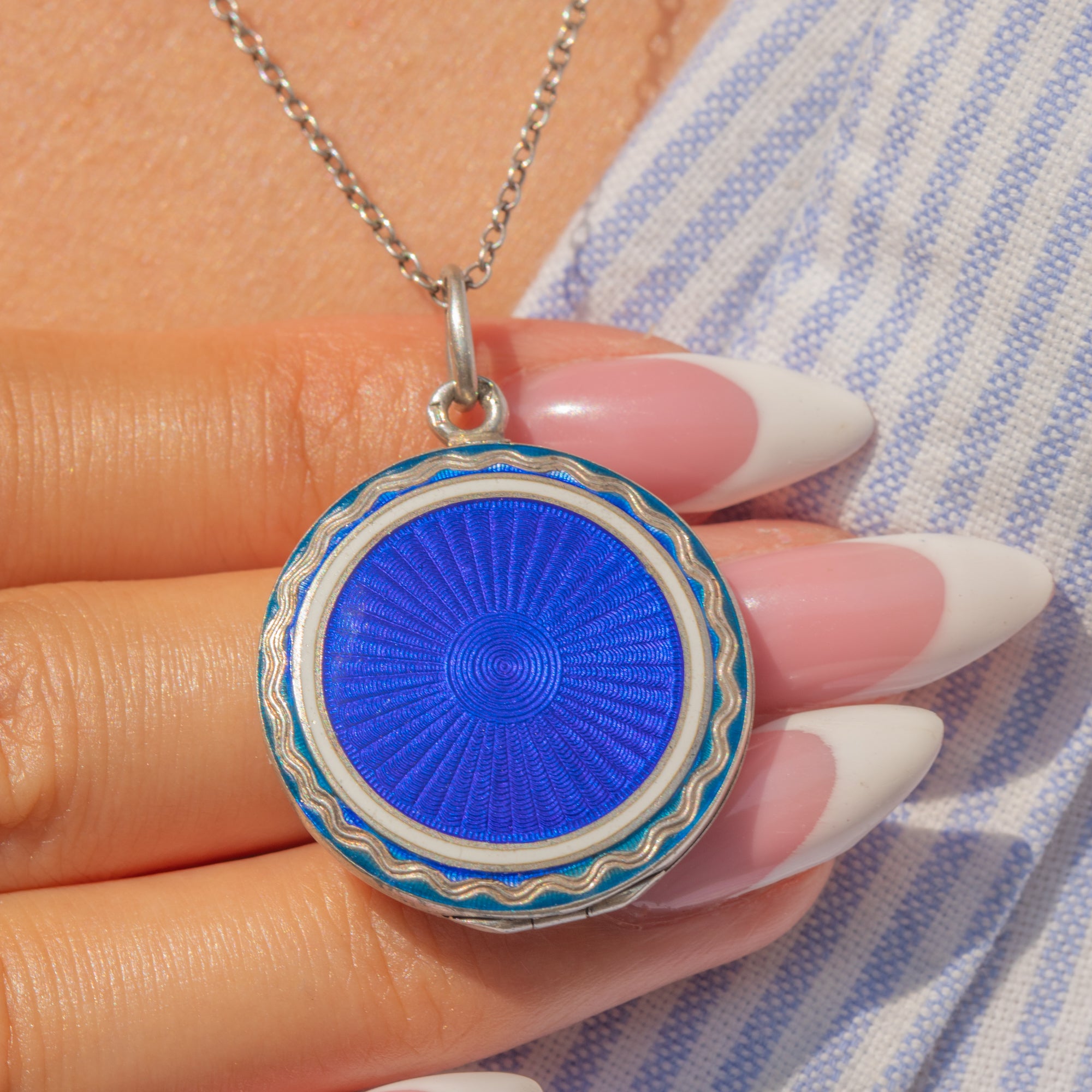 This beautiful Edwardian locket features a striking Royal blue Guilloché Enamel design bordered by a crisp white edge. The vibrant colour and intricate detailing exemplify the fine craftsmanship of the early 20th century, making this piece a true statement of elegance. The interior is gilded, and both frames remain intact, showcasing its careful preservation.