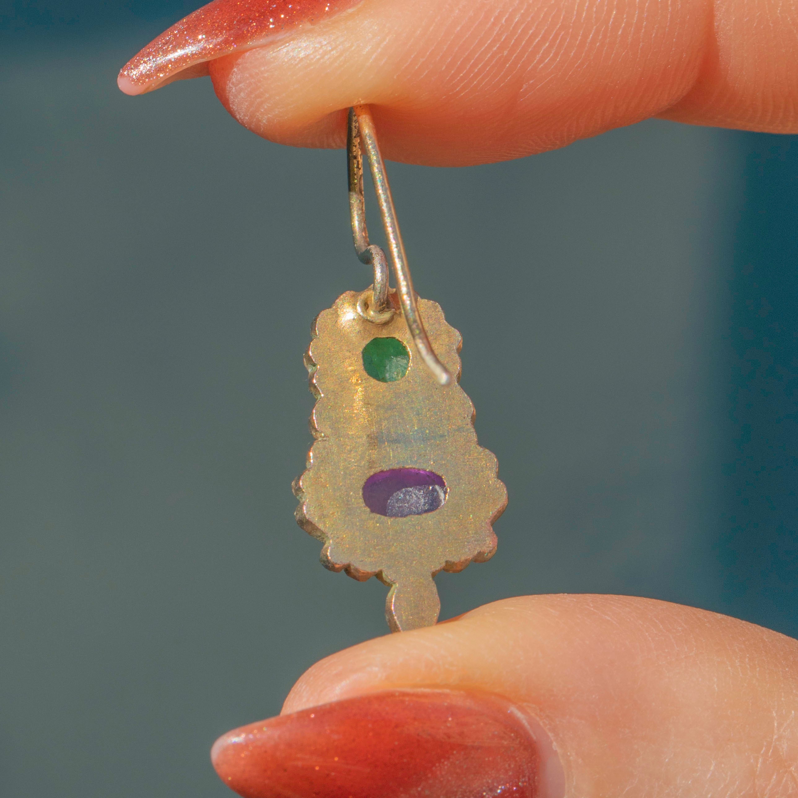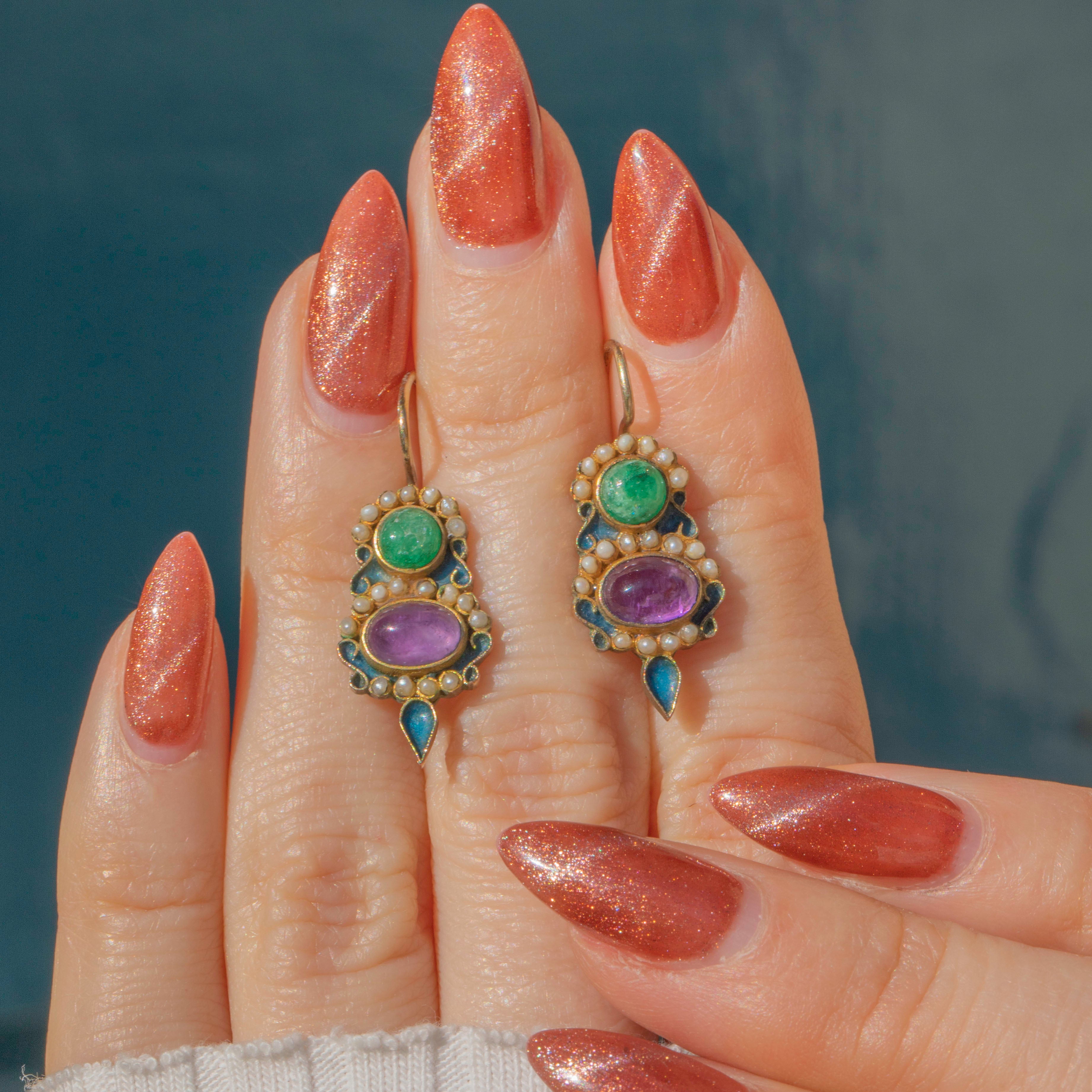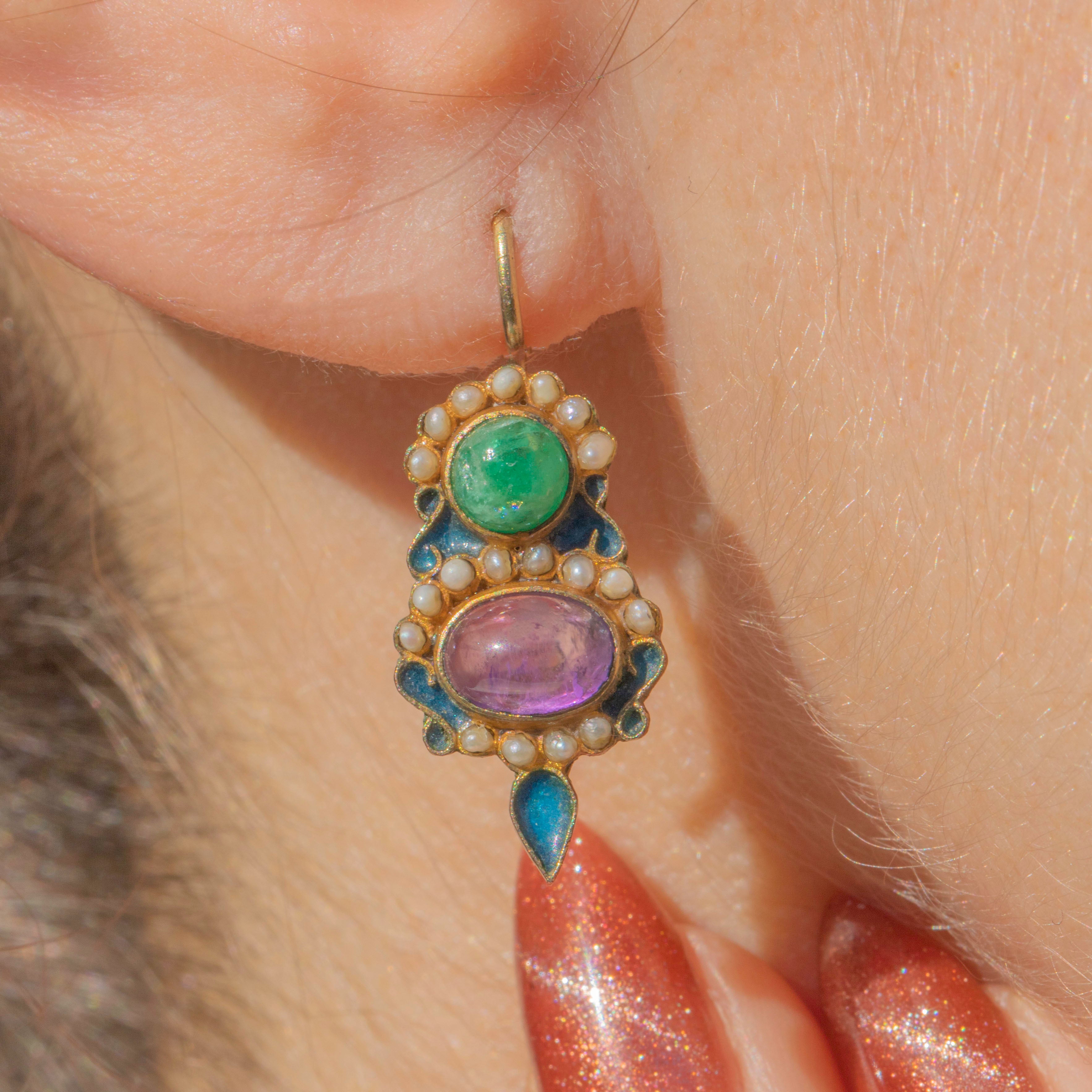 MATERIALS: Silver Gilt hooks, gilded metal bottoms, Amethysts (0.90ct), Emeralds (0.60ct), Seed Pearls, Enamel.