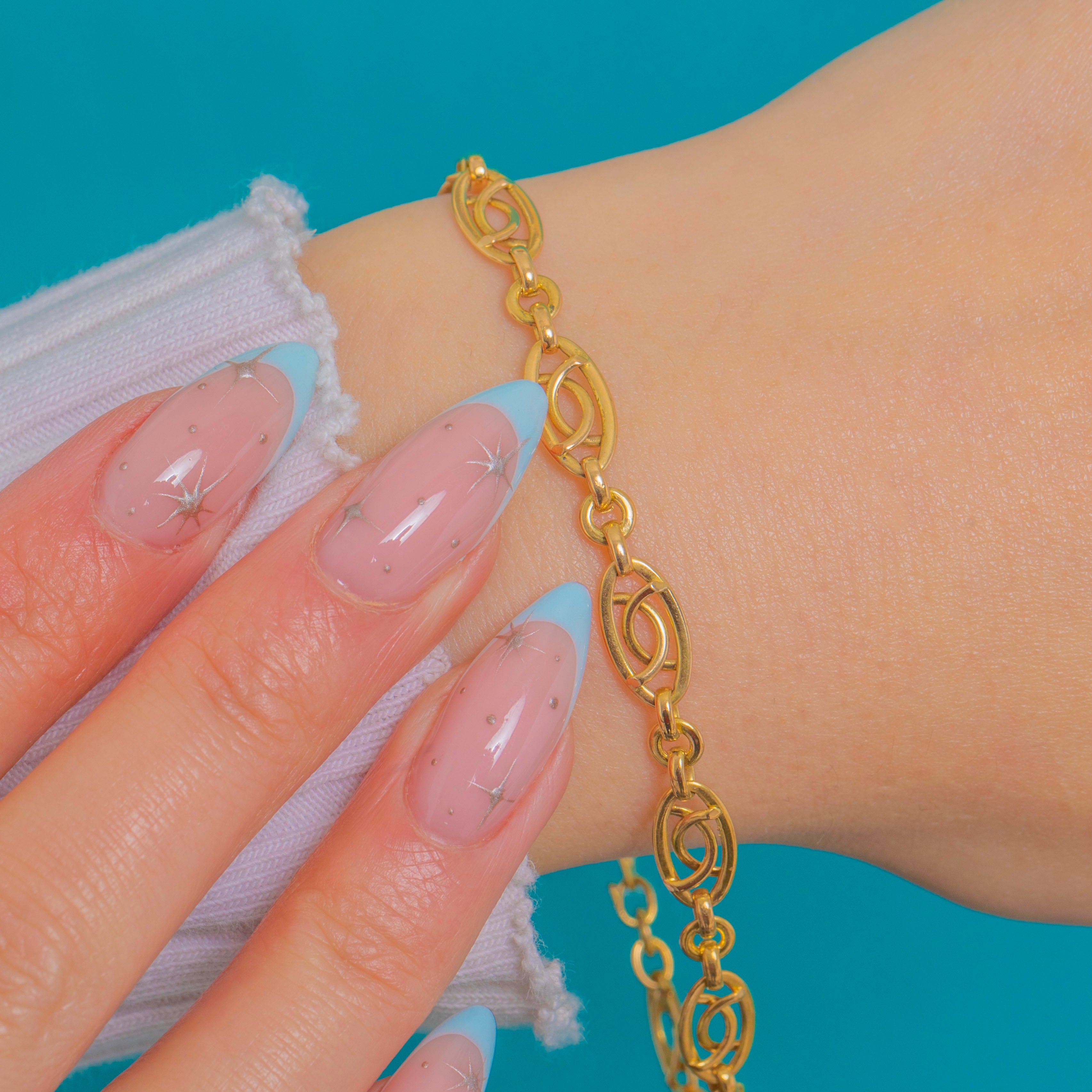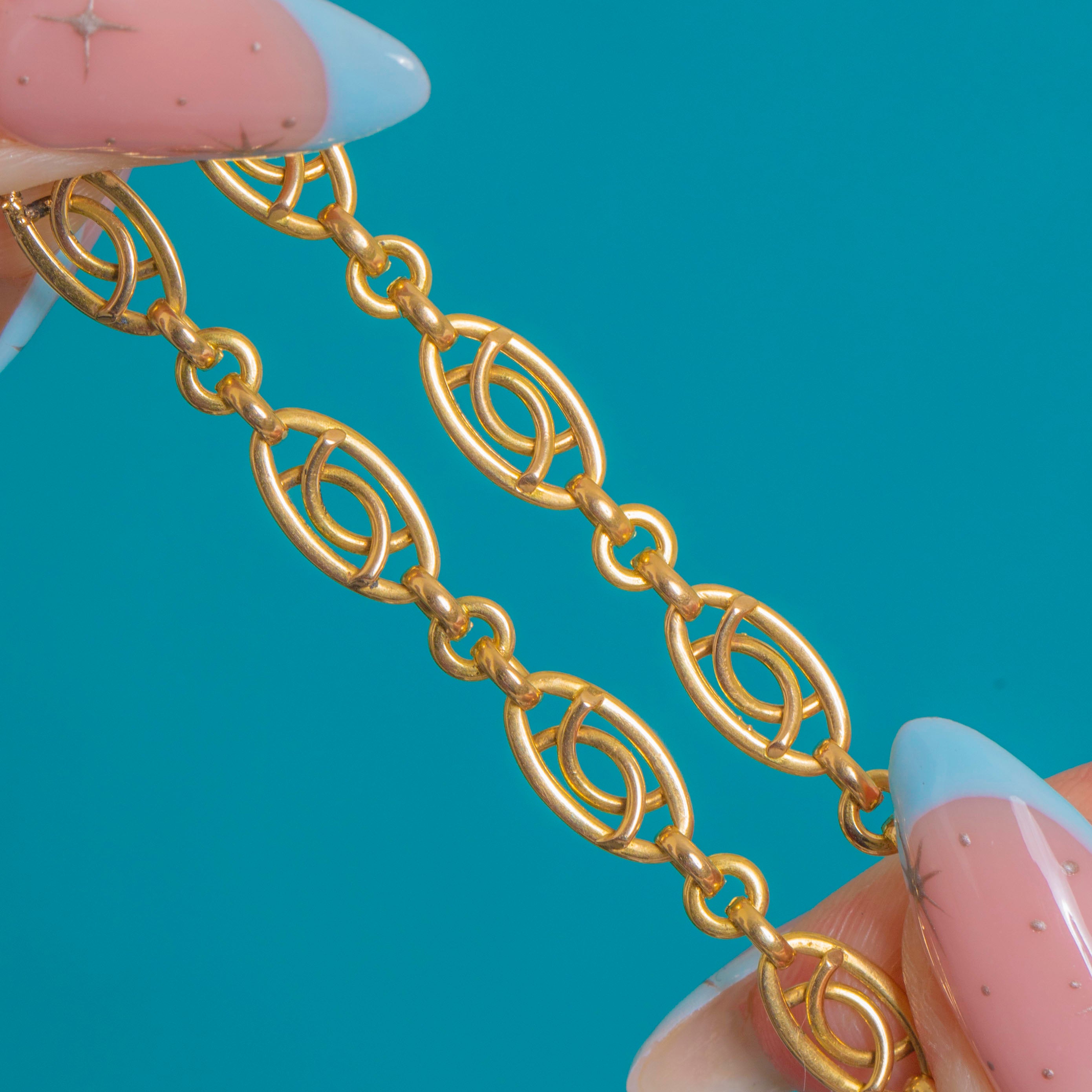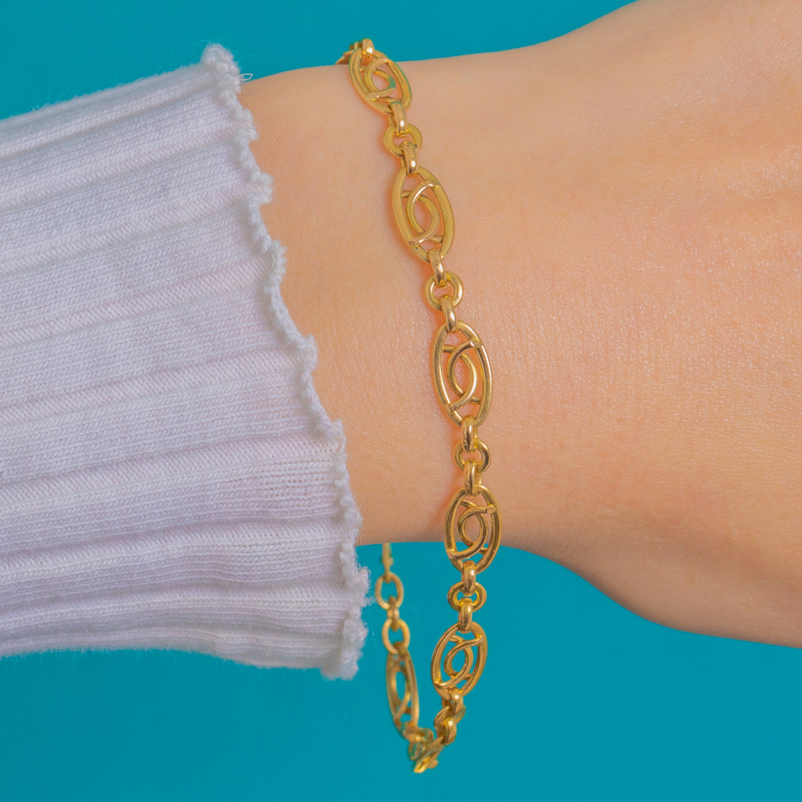 Sleek and refined, this Late Victorian French 18ct Gold fancy link bracelet is composed of repeating openwork navette links that create a graceful ribbon of light across the wrist. The airy design, crisp geometry and glossy finish strike a beautiful balance of delicacy and presence.