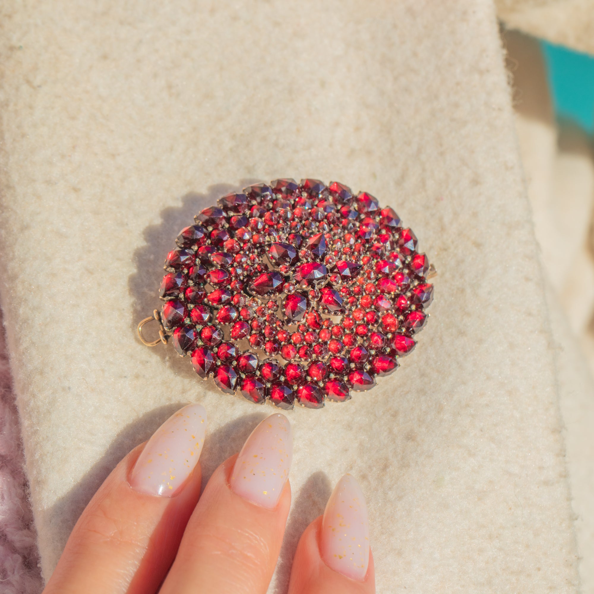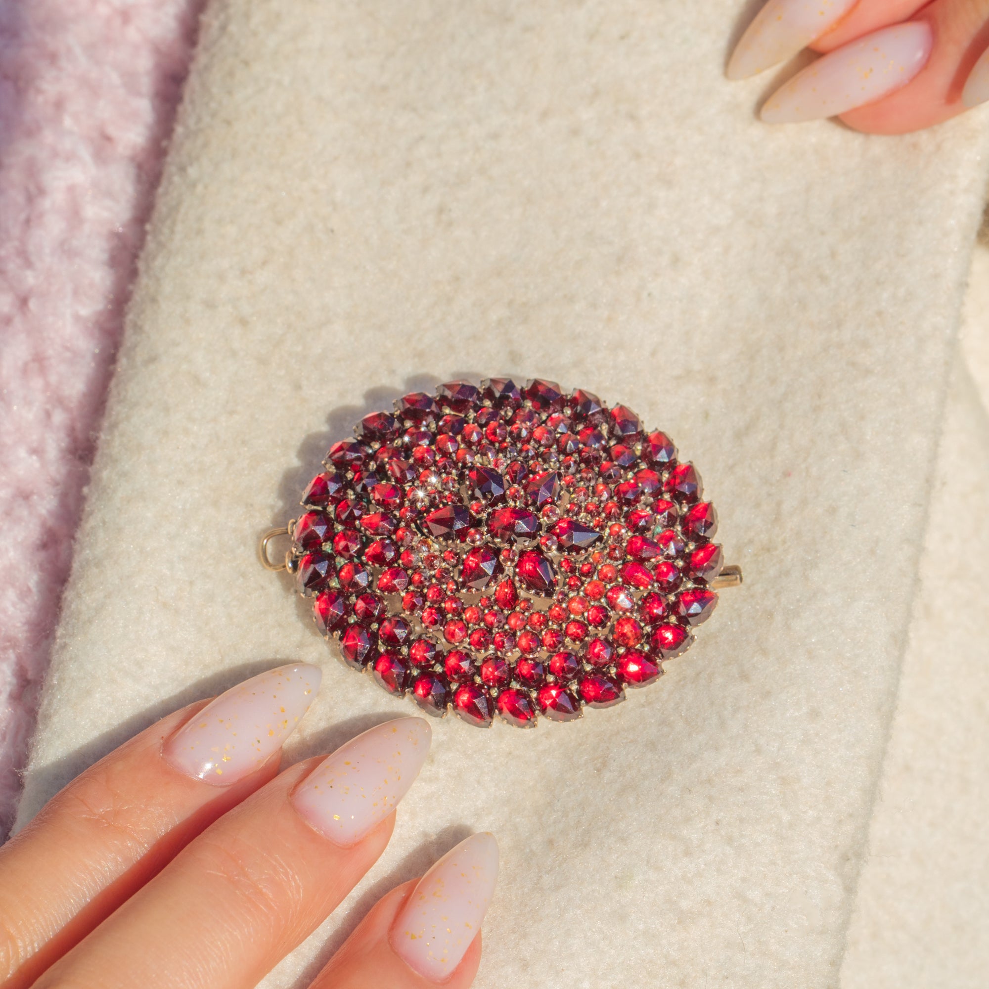 HERVORRAGEND: Granate sind leuchtend, gut aufeinander abgestimmt und sicher gefasst, mit nur leichten, altersgemäßen Spuren unter Vergrößerung sichtbar. Das Metall zeigt eine sanfte, gleichmäßige Patina, die Verschlüsse funktionieren einwandfrei. Keine sichtbaren Reparaturen, insgesamt sehr gepflegter Zustand.