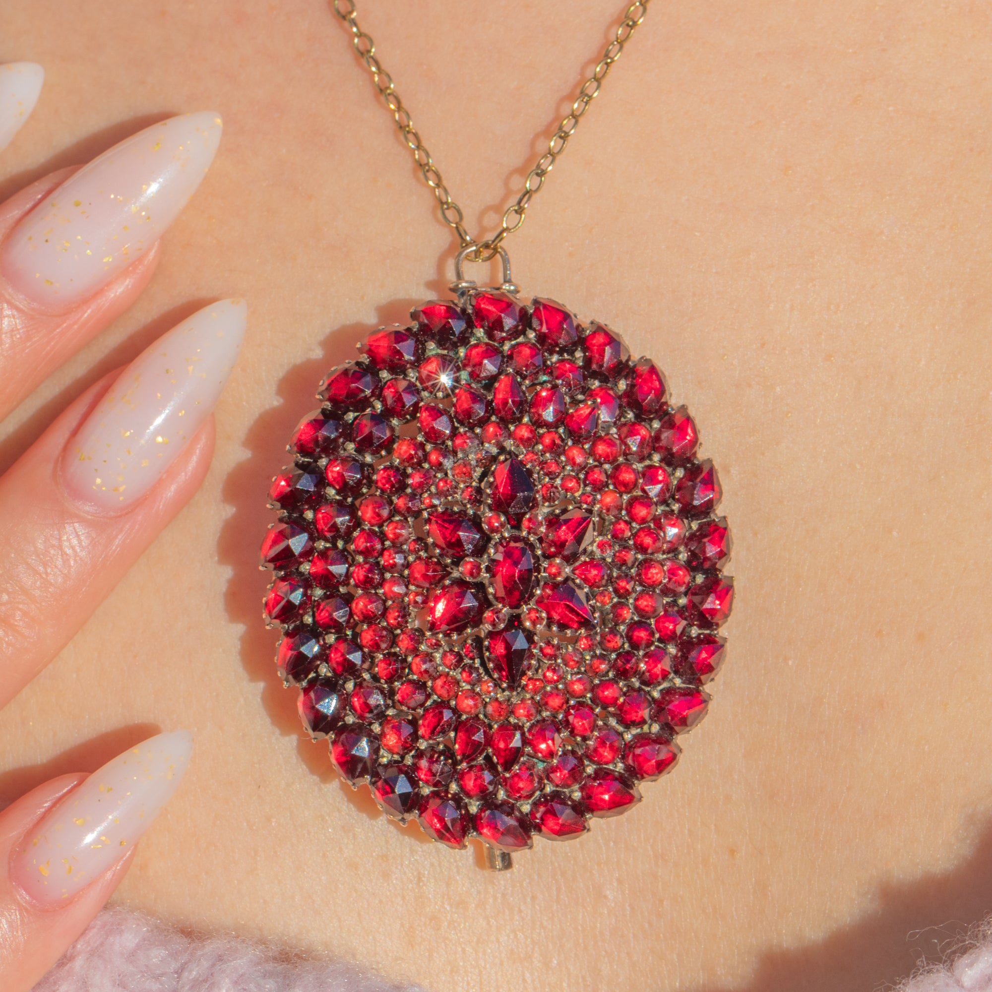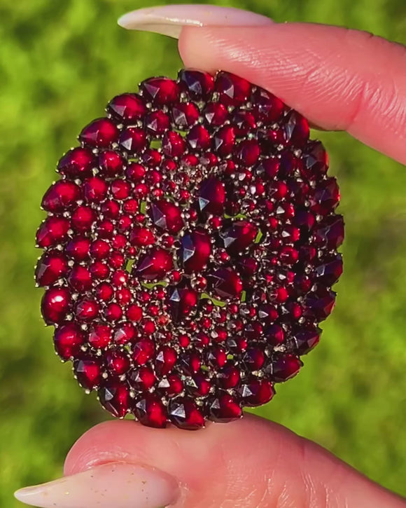 Leuchtend in gesättigtem Granatapfelrot, ist diese ausdrucksstarke Victorian Brosche-Anhänger ein Meisterwerk aus dicht gefassten Granaten. Das gewölbte Cluster ist in konzentrischen Rosettenstufen mit sternförmigem Zentrum angeordnet und endet in einem gezackten Saum aus tropfenförmigen Steinen – ein prachtvolles Victorian Schmuckstück, das am Dekolleté oder Revers wunderschön schimmert.