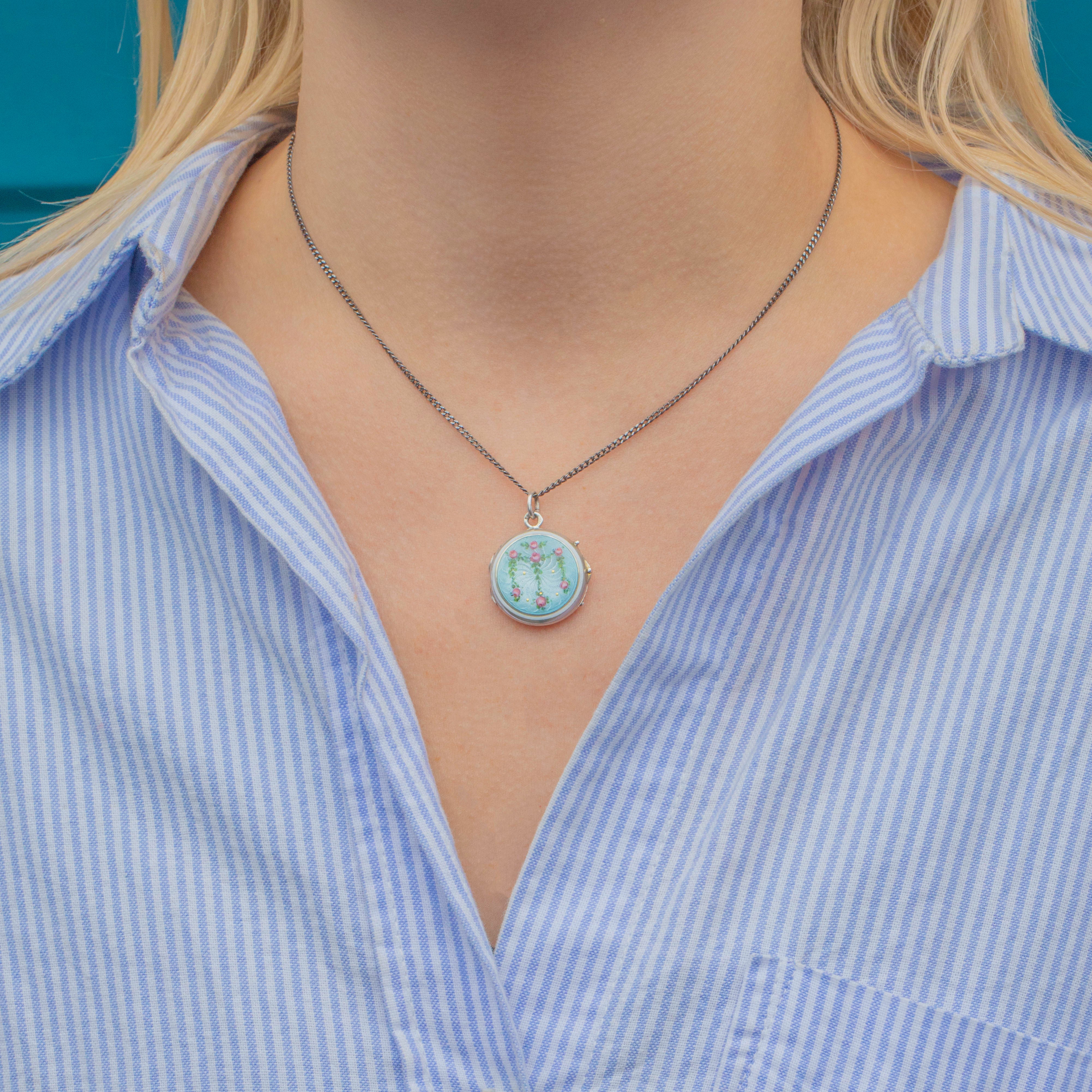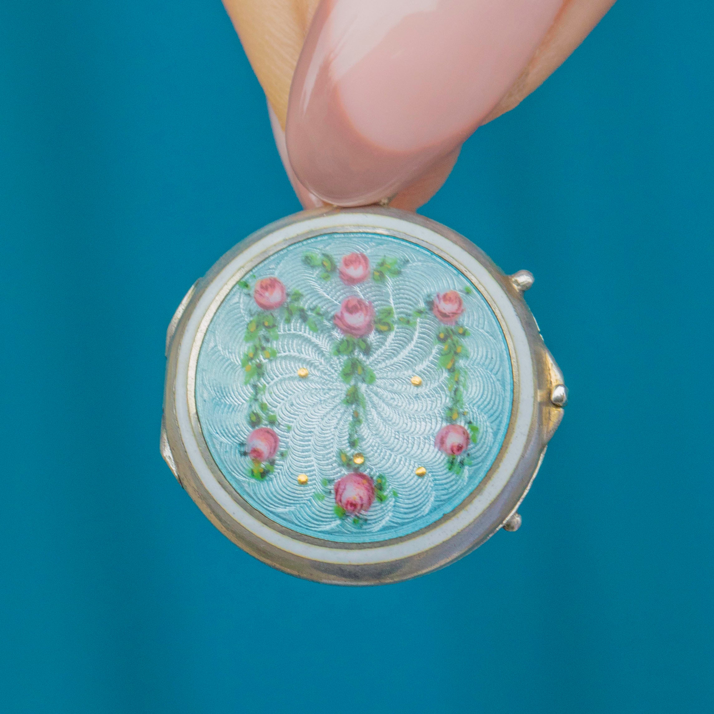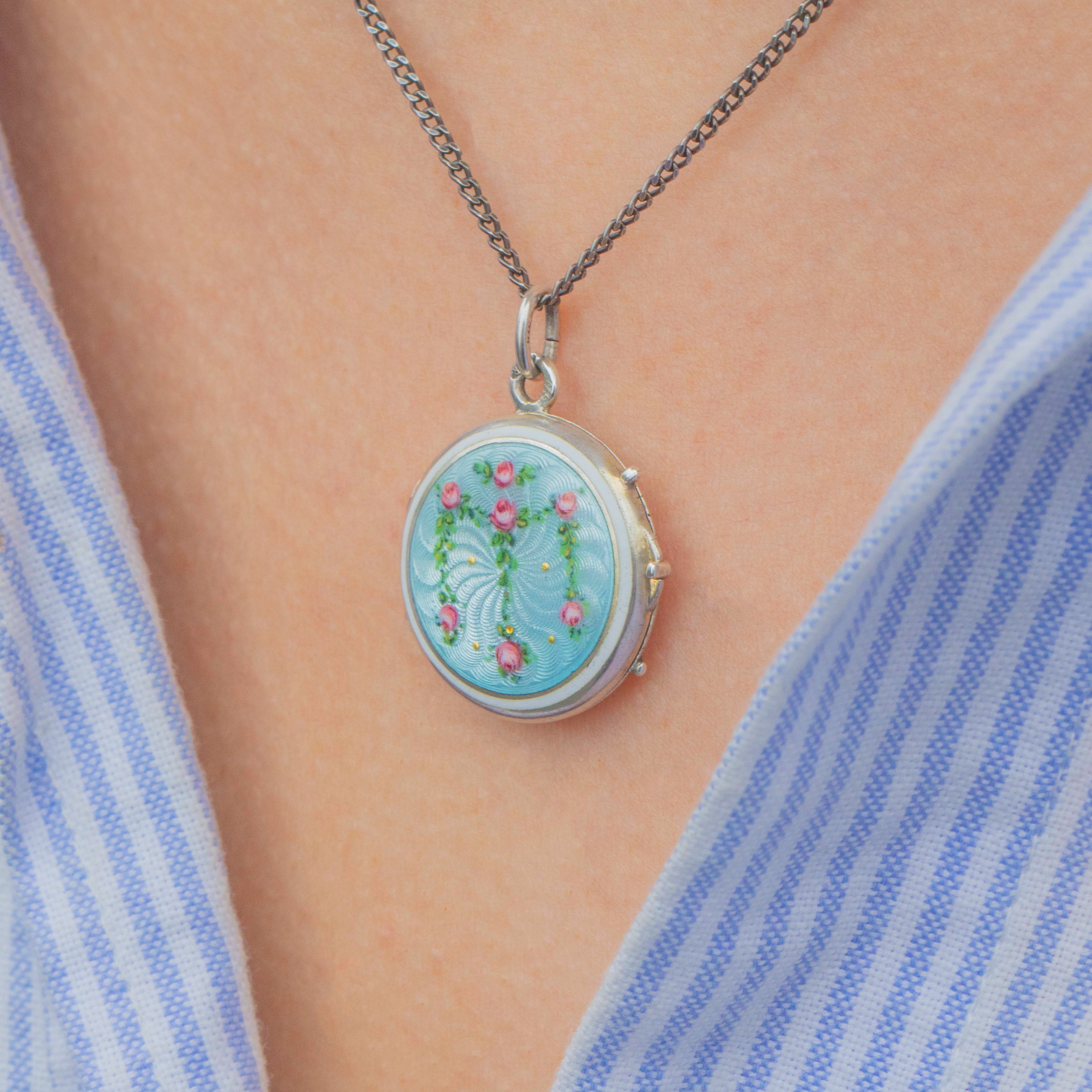 This Edwardian antique guilloché enamel locket is a delight! Crafted from bright Silver, this antique locket features shimmering soft blue Enamel in the centre, adorned with a delicate rose garland motif adding a touch of romantic allure.