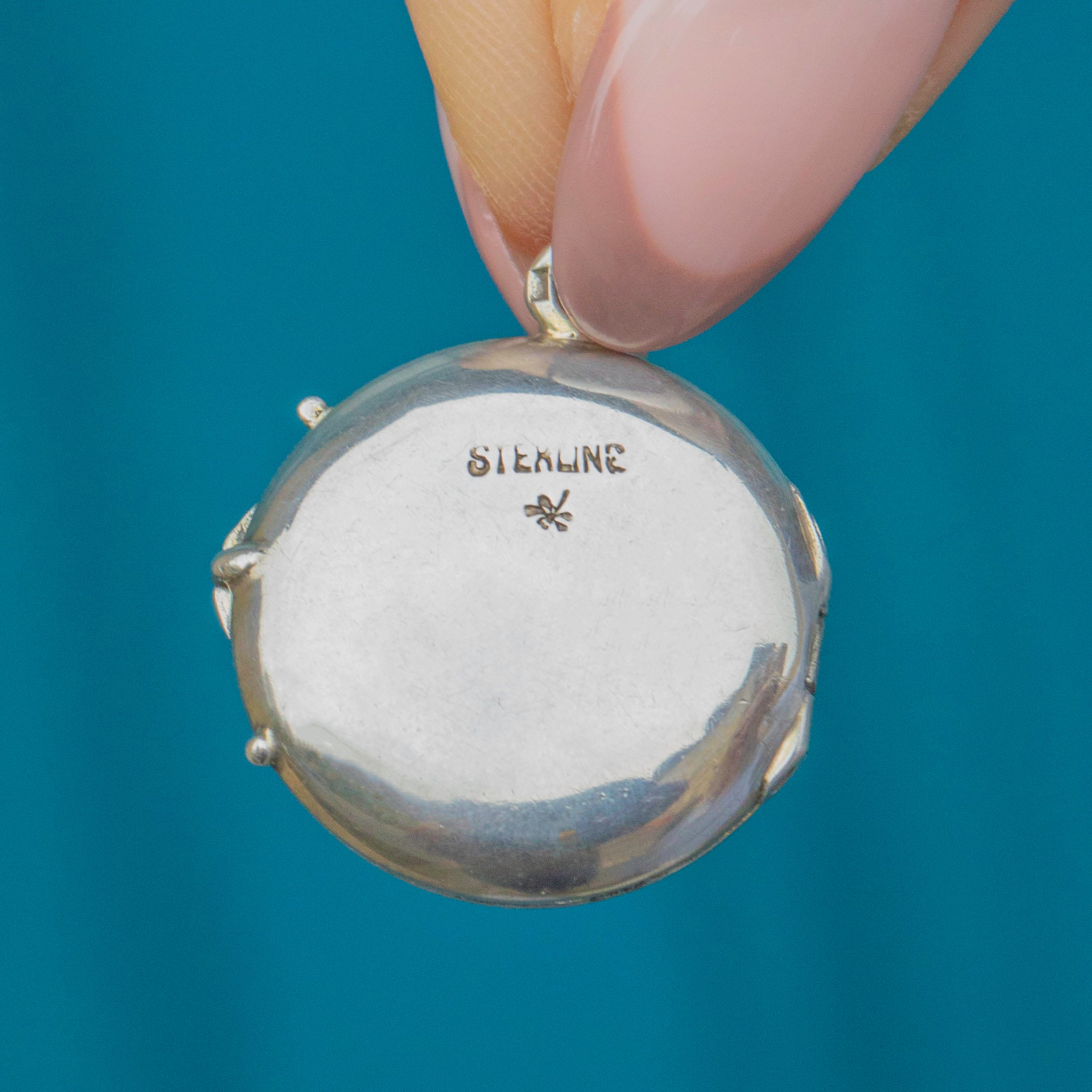 VERY GOOD. This antique Guilloché Enamel locket is in very good condition. Her Enamel is vibrant and shimmery, providing a gorgeous texture. There are some signs of wear to the Silver commensurate with age, however, this does not affect its functionality. With both frames still in place, this Art Nouveau locket will keep two of your most cherished photographs securely inside.