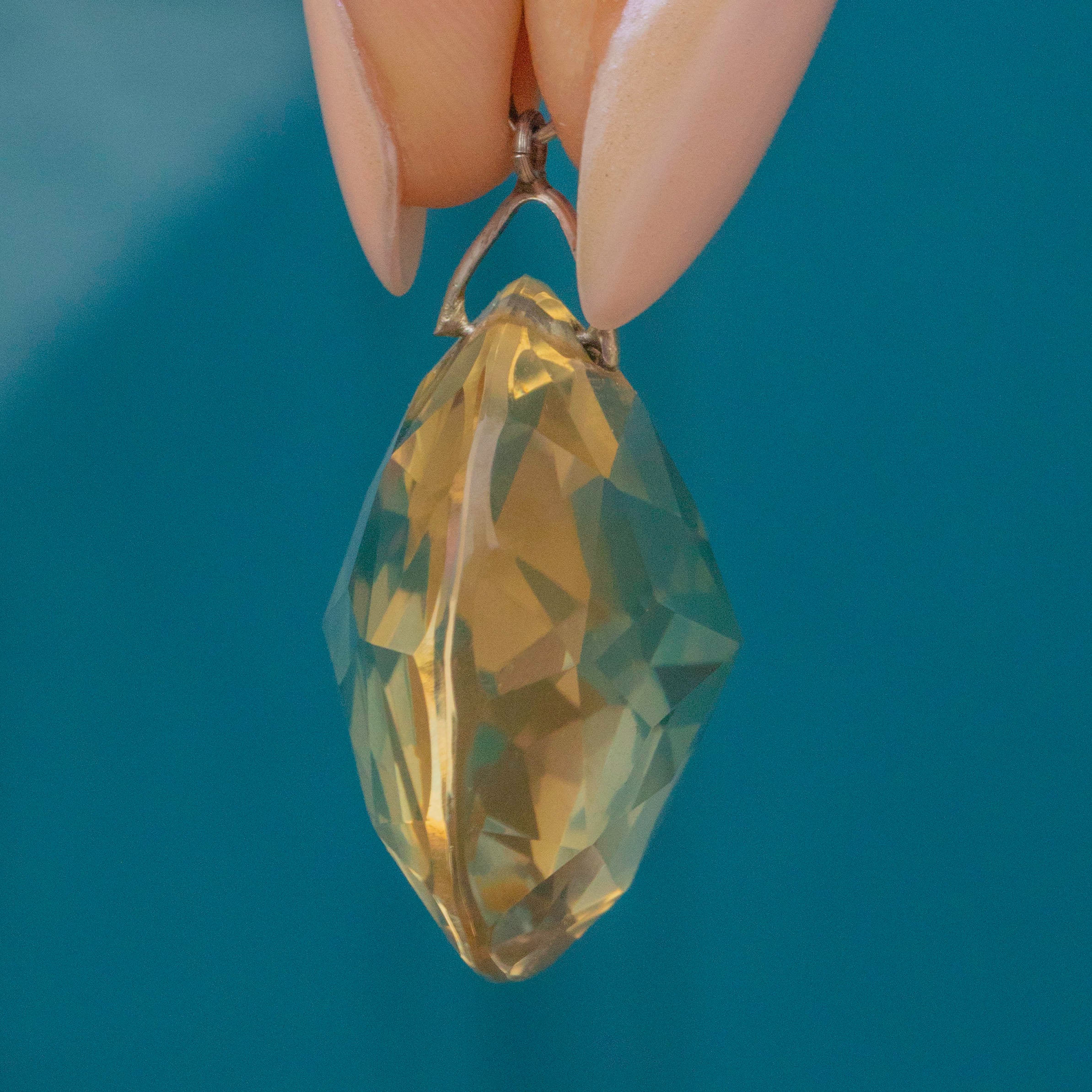 VERY GOOD. This antique Silver round Citrine pendant is in very good condition. Bursting with crisp cut geometric facets, her 56.95ct Citrine has been well cared for, free from any chips or scuffs. She does feature a small inclusion towards the bottom of the pendant, which we feel adds to her antique charm! Complete with a securely soldered Silver jump ring, simply suspend this Victorian pendant from a chain of your choice and enjoy!