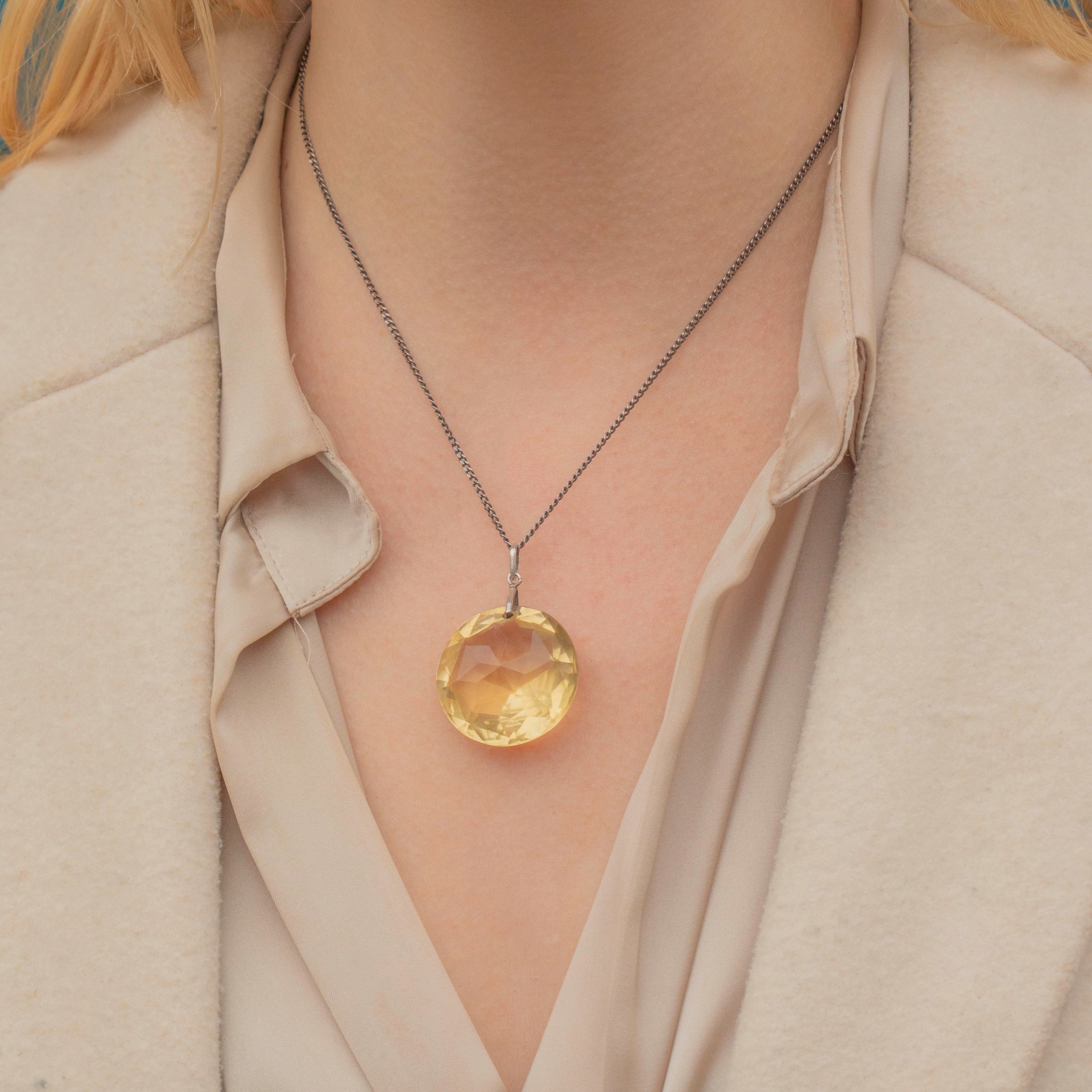 Akin to a ball of sunshine, this joyful antique Silver round Citrine pendant will brighten up your day all year round! Boasting a whopping 56.95ct Citrine, you can't help but admire how the light pours through each sweet lemony facet.