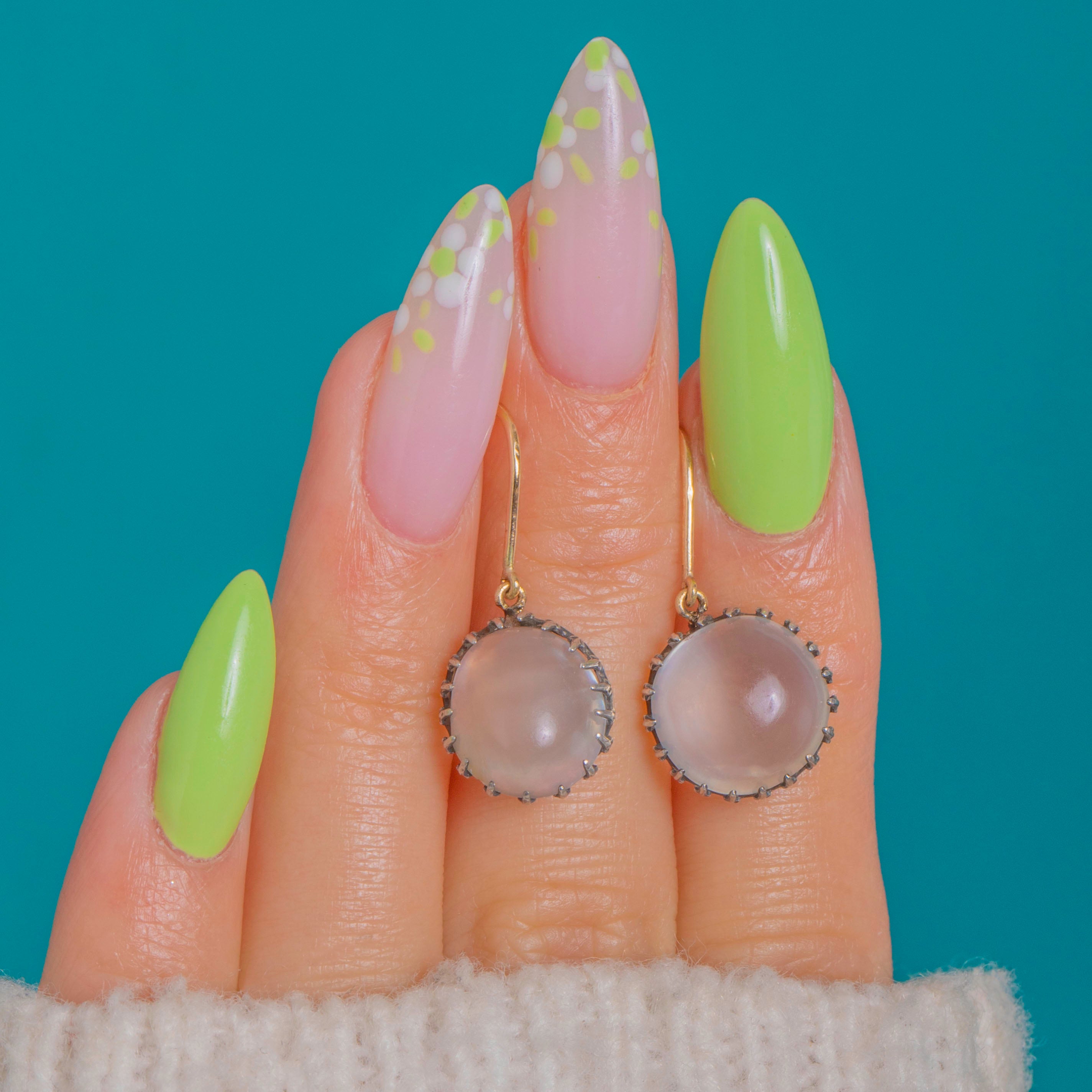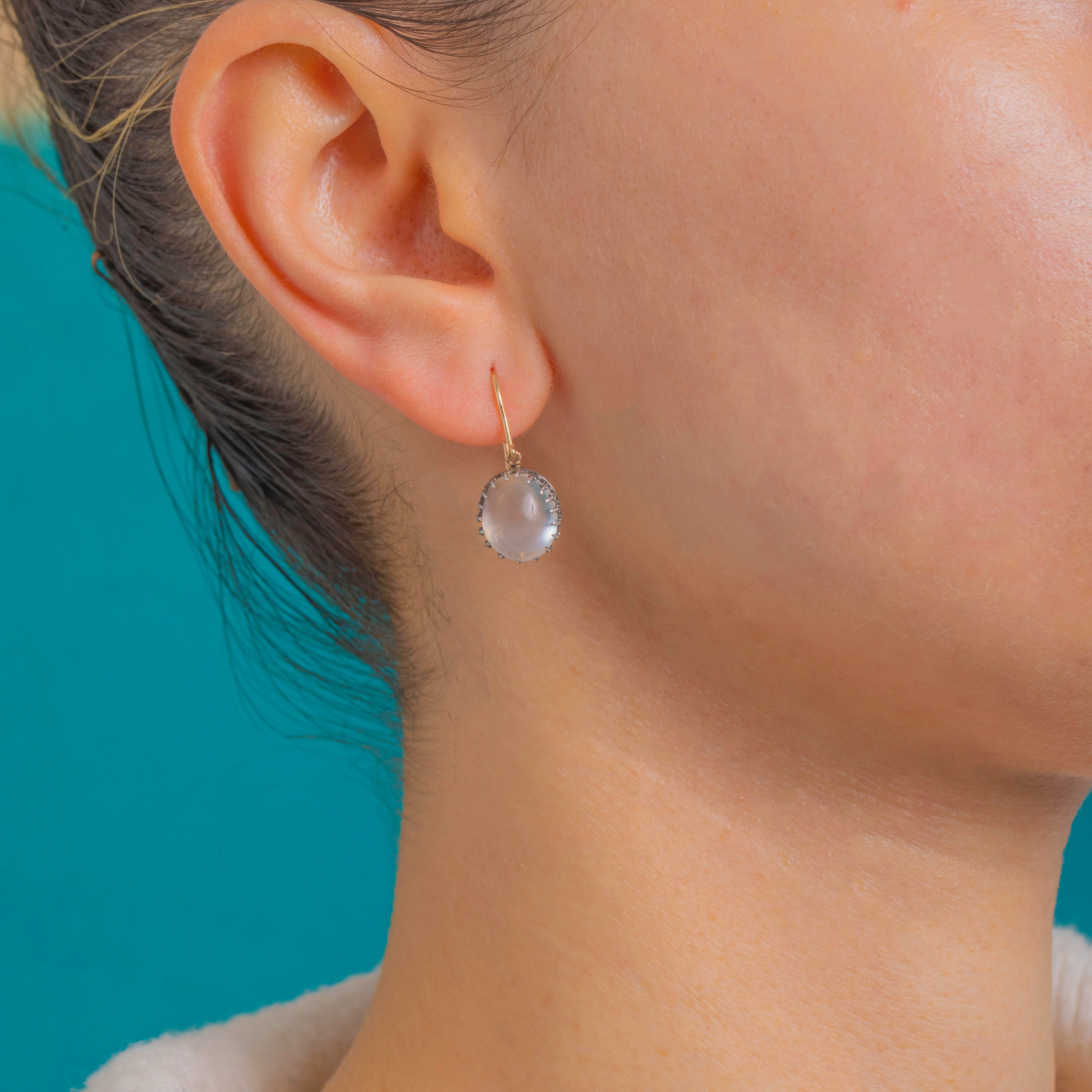 Luftig und von erlesener Zurückhaltung, erstrahlen diese Edwardian Moonstone Ohrhänger in einem sanften, silbrig-blauen Schimmer. Jeder hochgewölbte Cabochon ist in einer romantischen Silber-Krappenfassung gebettet, deren feine Zargen eine zarte Struktur und antiken Charme verleihen. Die Anhänger schwingen sanft an filigranen Haken aus 9ct Gold und schaffen so eine edle Bicolor-Optik, die jedem Teint schmeichelt und jedes Outfit veredelt.