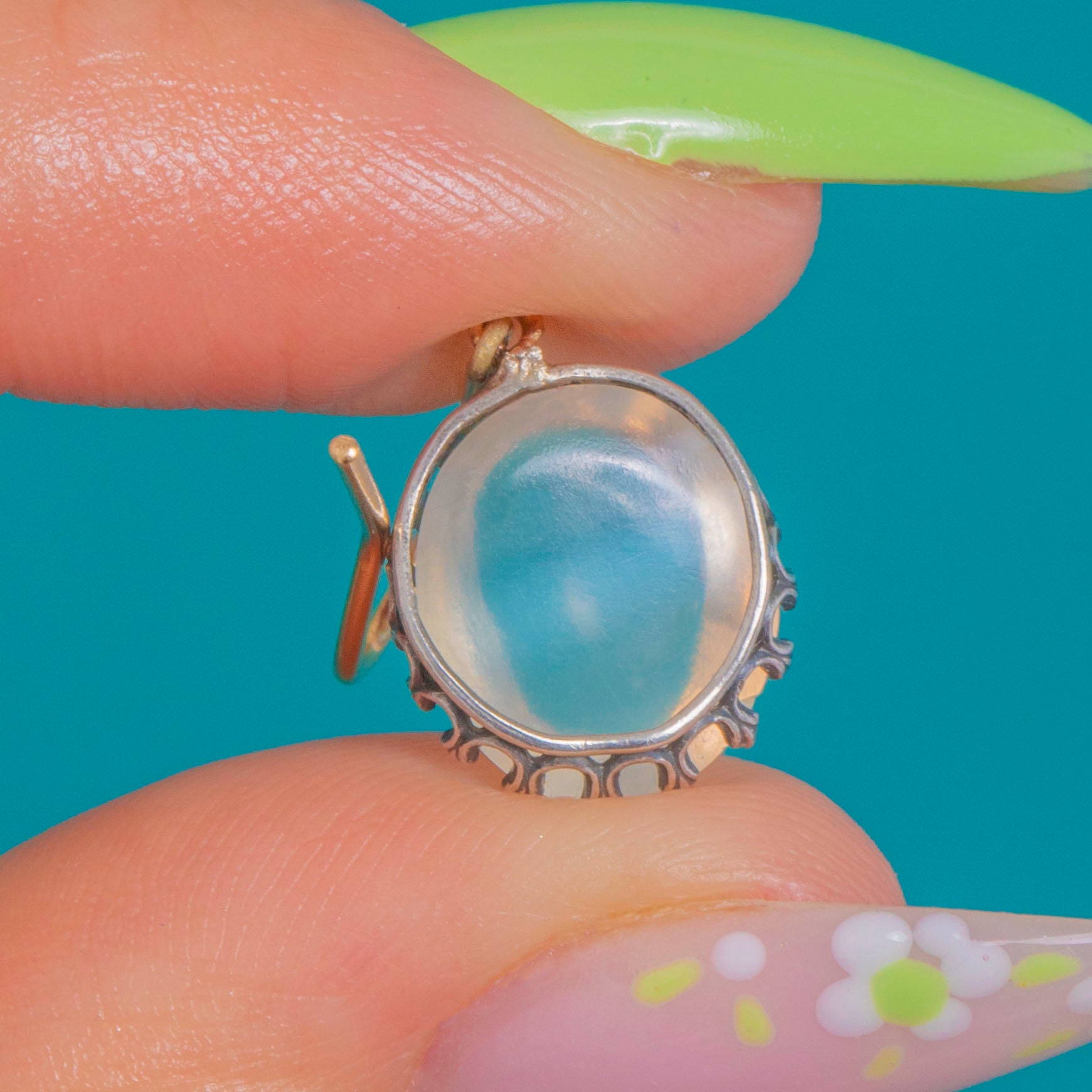 HERVORRAGEND: Die Moonstones sind leuchtend und harmonisch aufeinander abgestimmt, mit minimalen natürlichen Oberflächenmerkmalen, die nur unter Vergrößerung sichtbar sind; keine Absplitterungen oder Risse erkennbar. Die Silberfassungen sind sicher mit allen Zargen vorhanden, und die Haken aus 9ct Gold sind stabil und sofort tragbar. Leichte, gleichmäßige Patina auf dem Metall, altersgerecht und ein Zeichen sorgfältigen Tragens sowie guter Erhaltung.