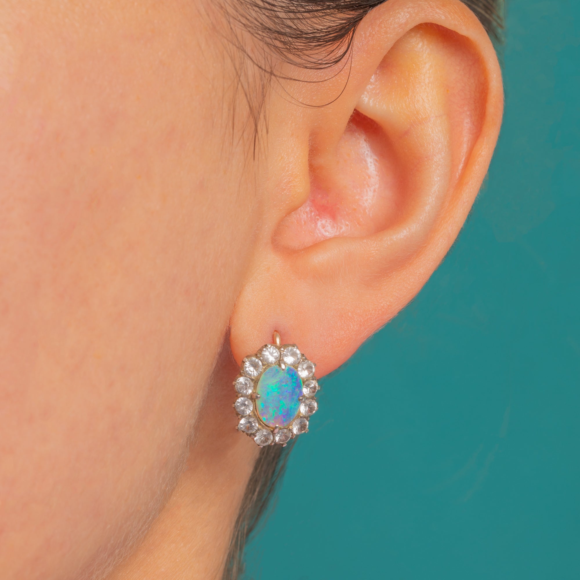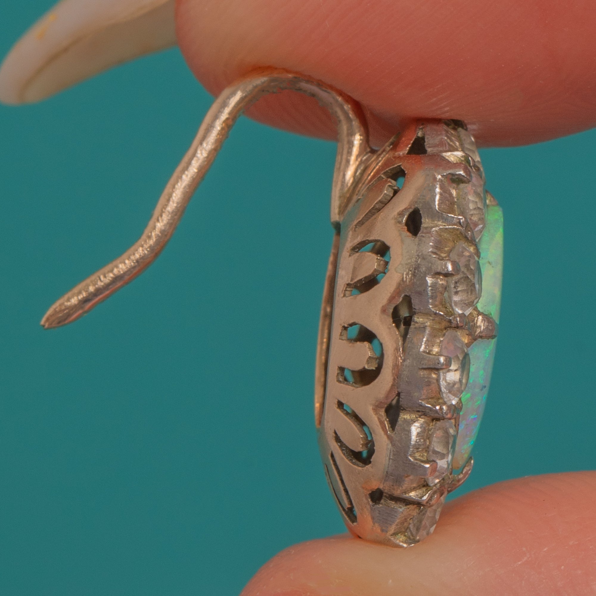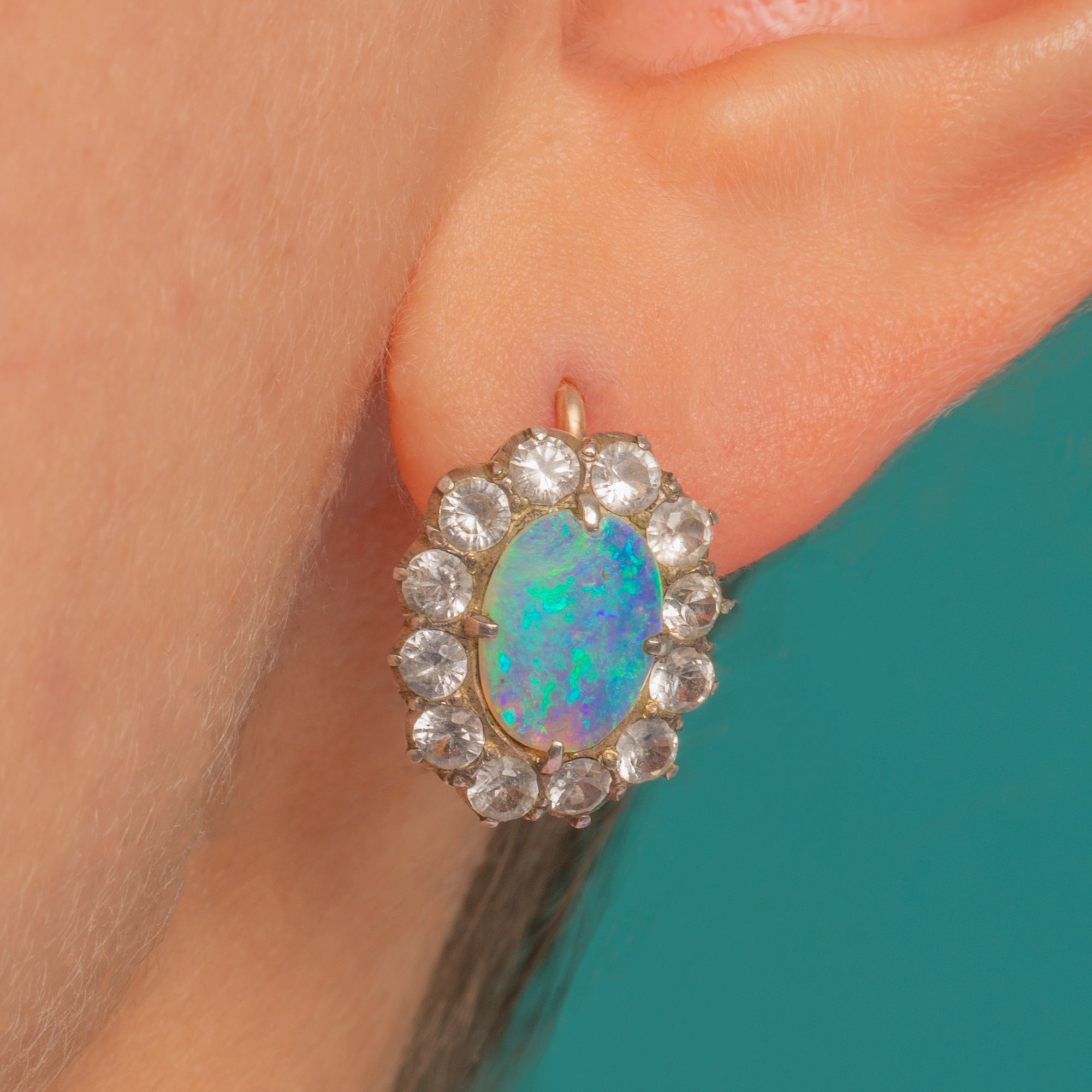EXCELLENT: Opals are bright and clean with strong play‑of‑colour; White Sapphires are lively with only light, minor facet abrasions visible under magnification. Settings are secure with well‑formed claws and a pleasing antique patina to the silver‑topped halos. Hooks and mounts are in excellent order with minimal age wear.