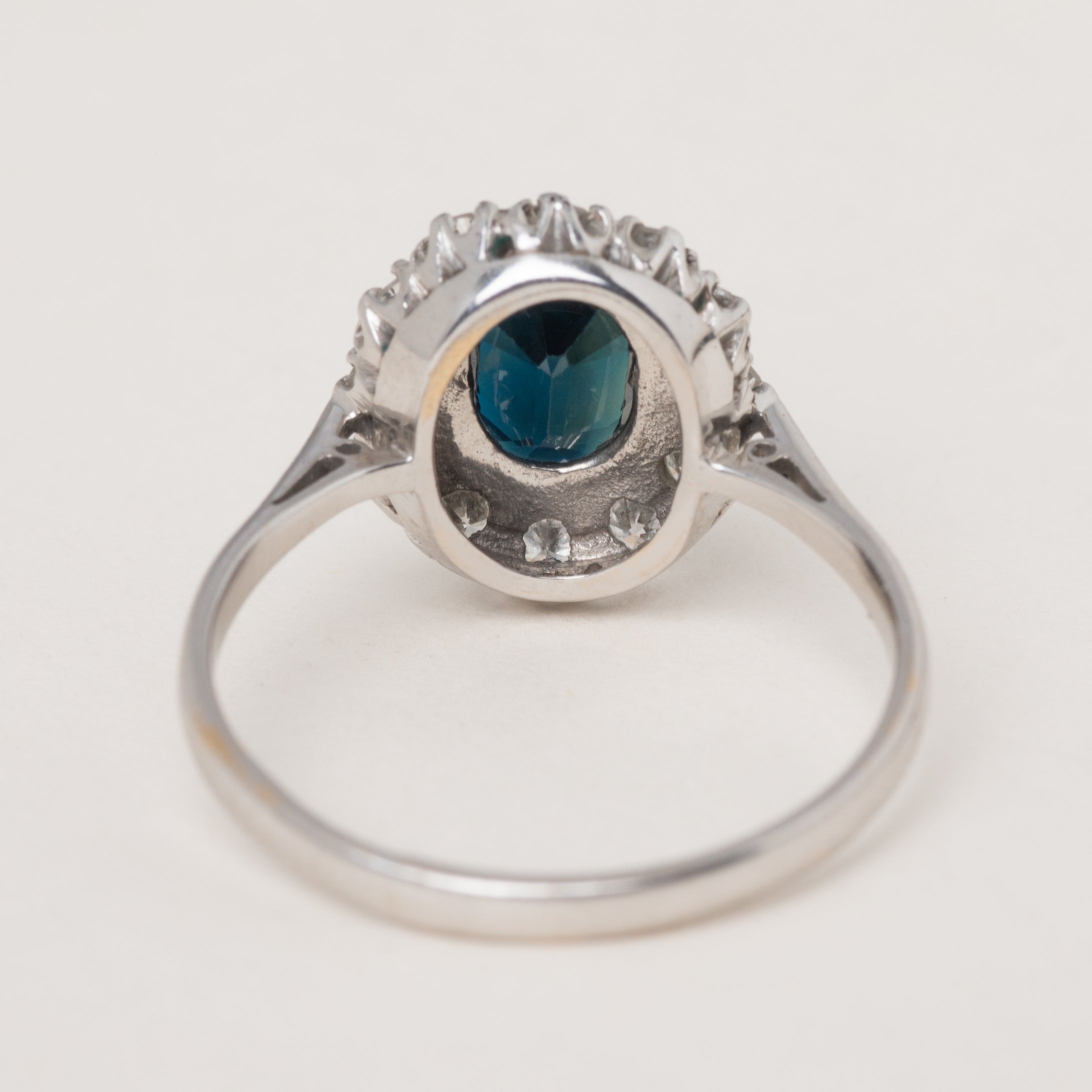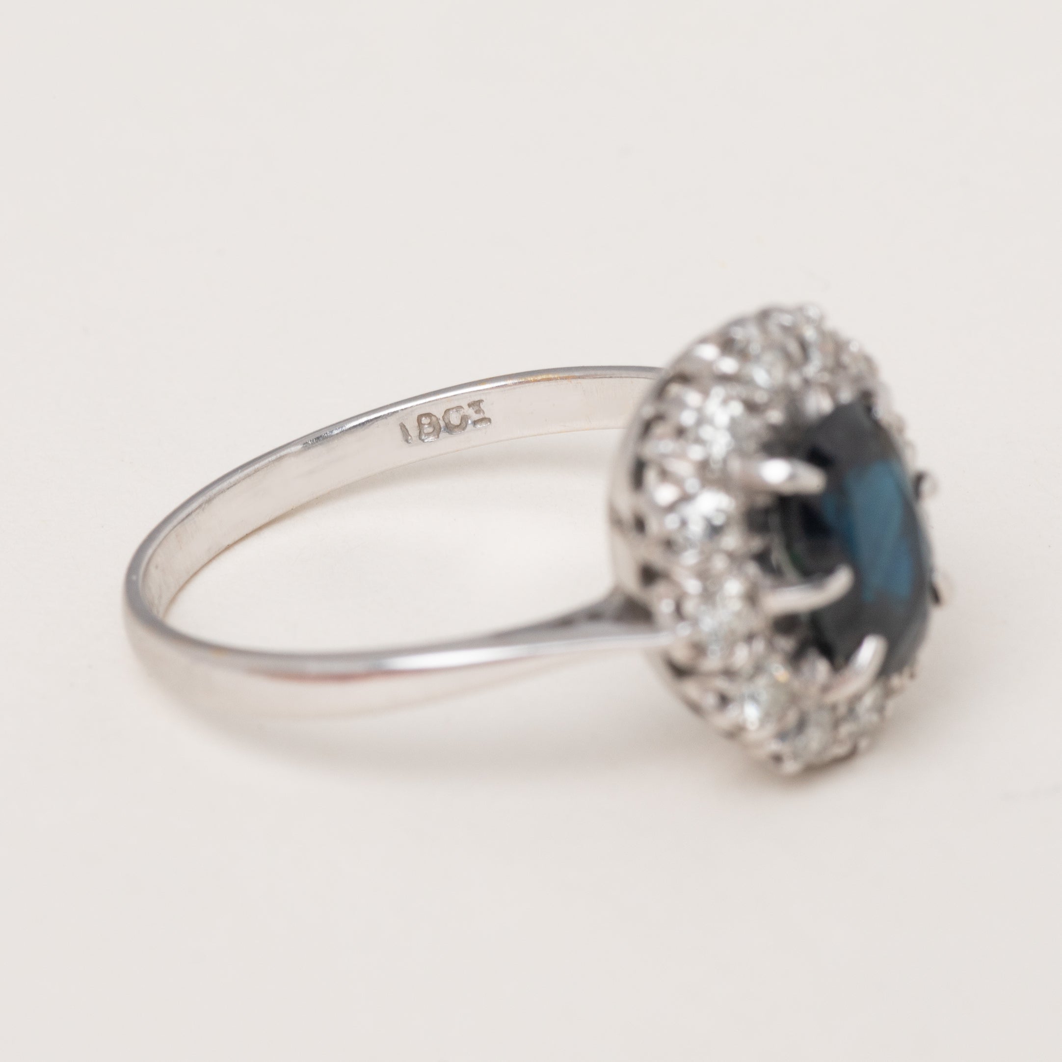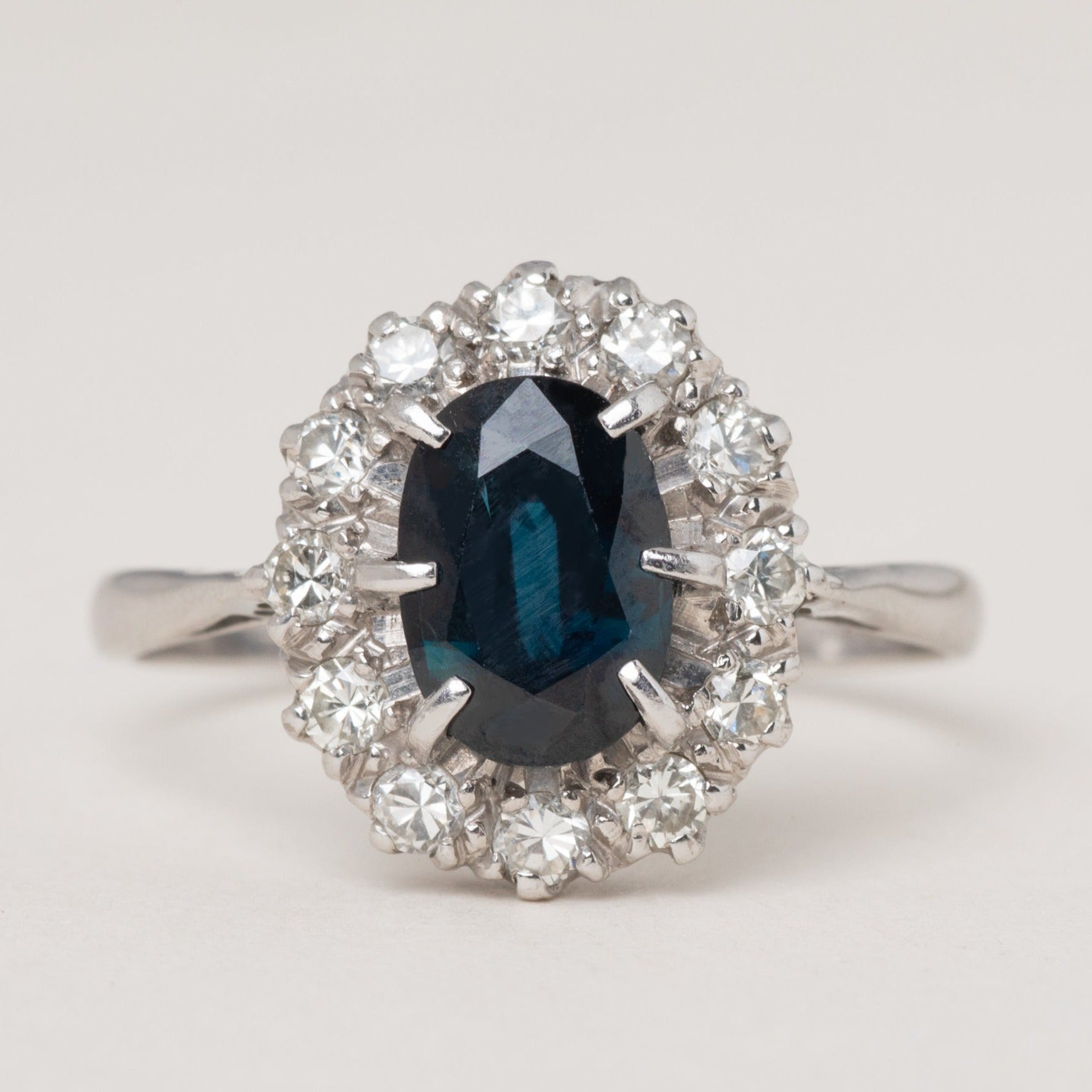 EXCELLENT. This gorgeous antique natural Sapphire and Diamond cluster ring is in excellent condition! This piece has a wonderful natural Sapphire centre, free from damage and securely set, as well as a sparkly halo of Diamonds. The 18ct White Gold ring band has kept its shape very well, and has a partial 18CT stamp still visible.